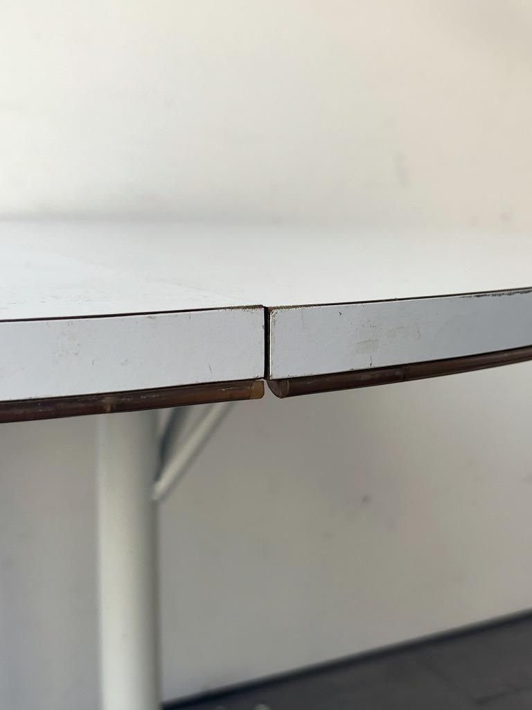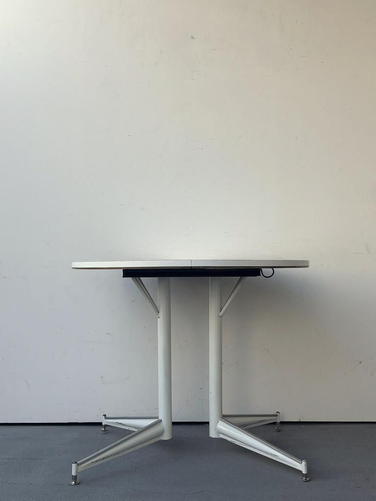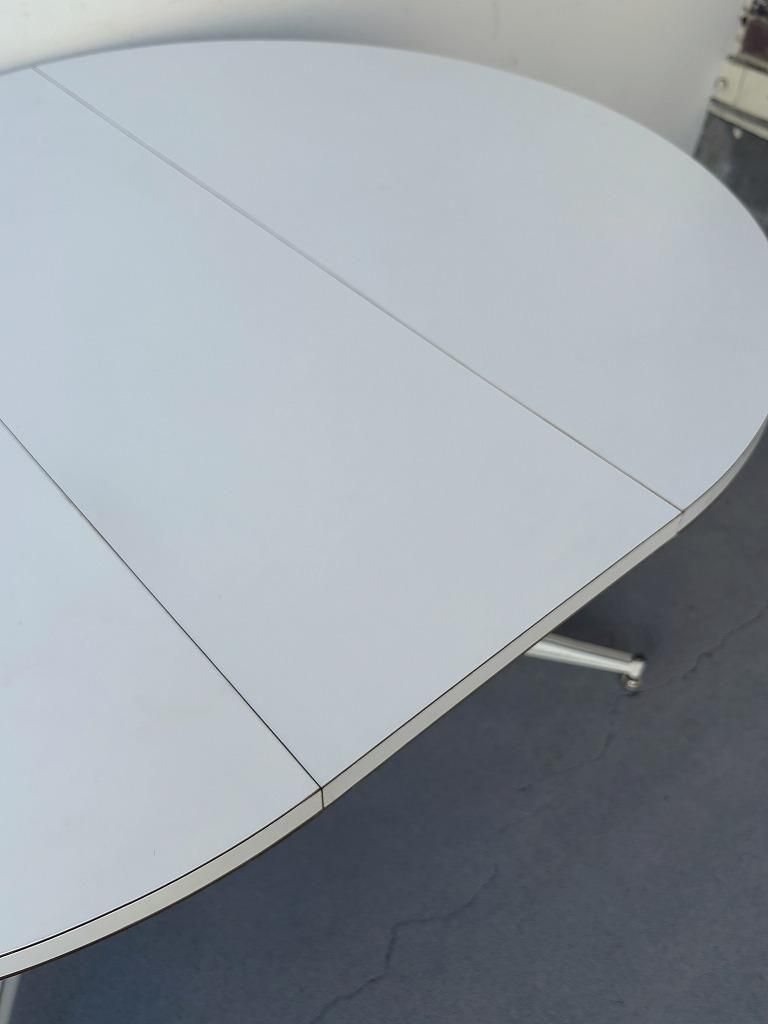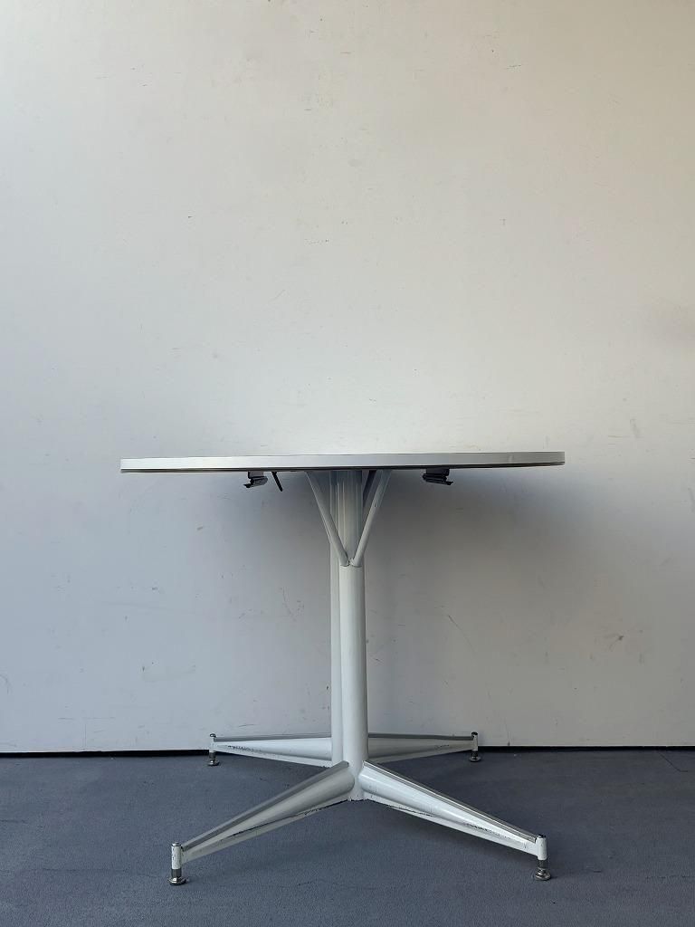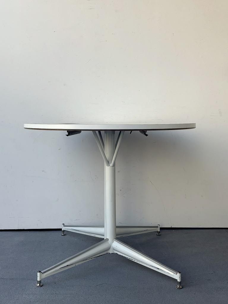 シンプルで合理的、余計な装飾がないミッドセンチュリー・モダンなデザイン。2本支柱から脚が放射状に伸び、アジャスター付きの4点で安定性を確保。当時のオフィス家具・会議用テーブルに多く採用された脚部のデザインです。