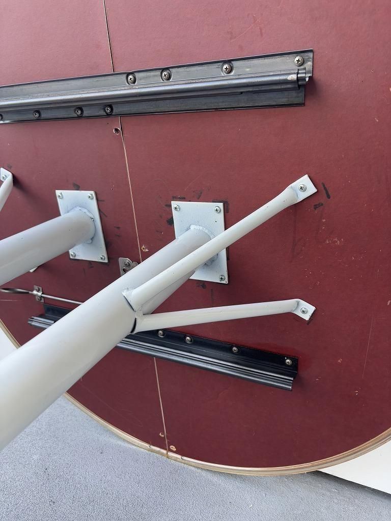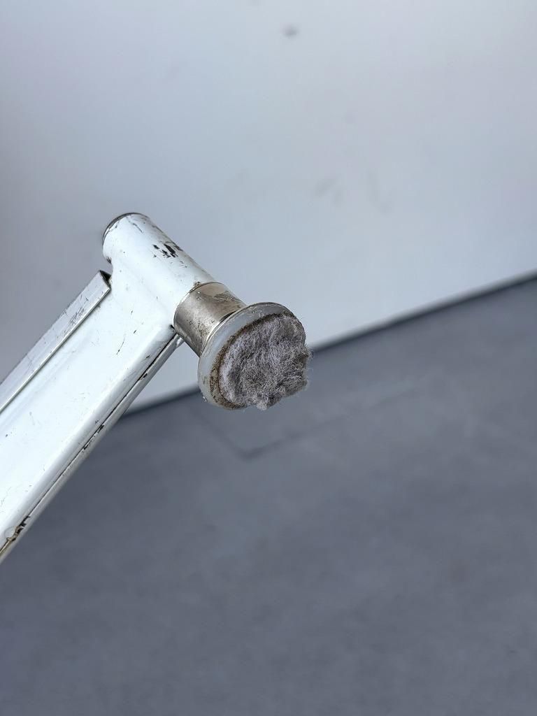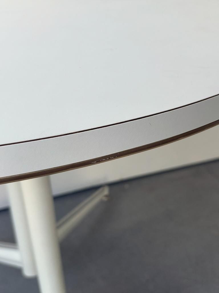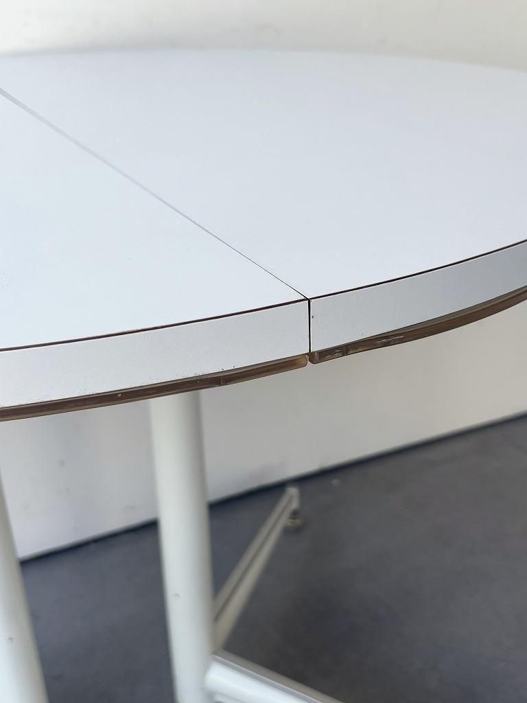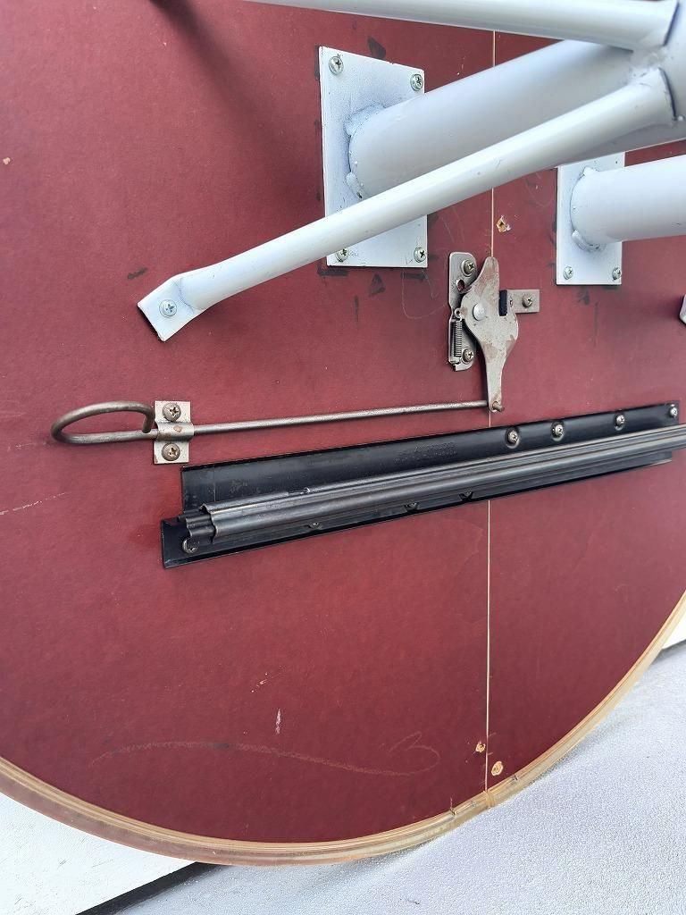 シンプルで合理的、余計な装飾がないミッドセンチュリー・モダンなデザイン。2本支柱から脚が放射状に伸び、アジャスター付きの4点で安定性を確保。当時のオフィス家具・会議用テーブルに多く採用された脚部のデザインです。