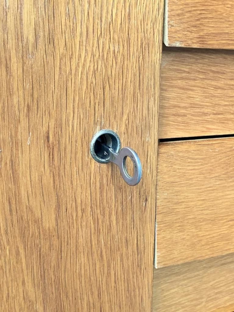 右側には4段の引き出し、左側には棚板付きの収納スペースを備え、日常使いに十分な容量を確保しています。左側の扉には鍵が付属しています。