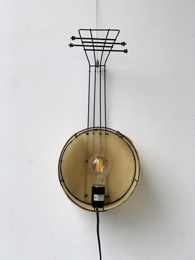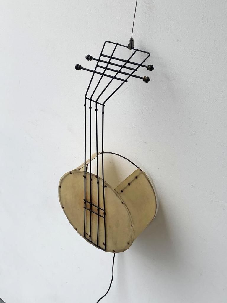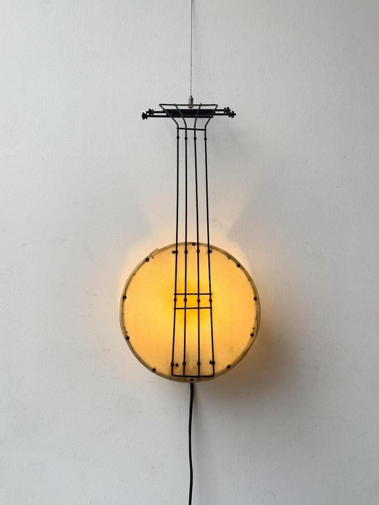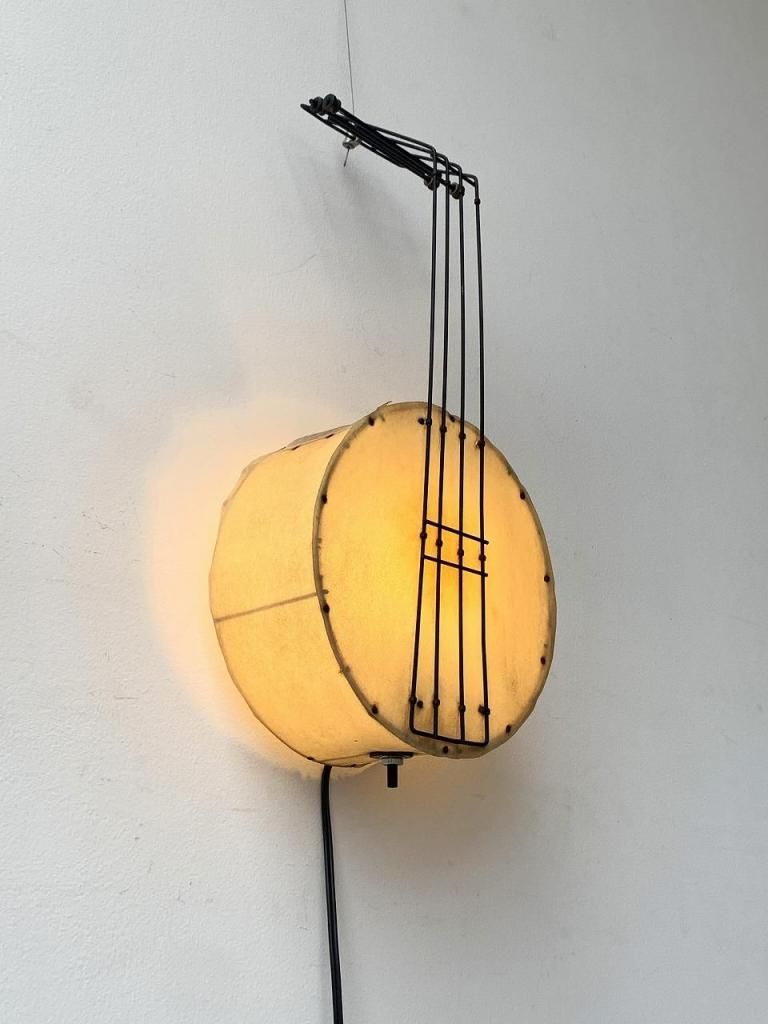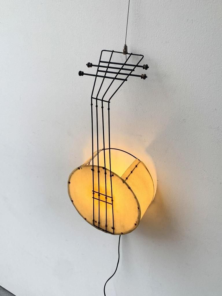 ブラックアイアンロッドでバンジョーのシルエットを抽象的に描いたデザインは、壁からわずかに浮かび、光ではなく線の影までもデザインの一部として演出します。