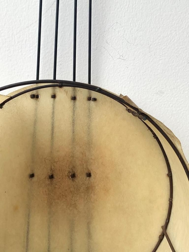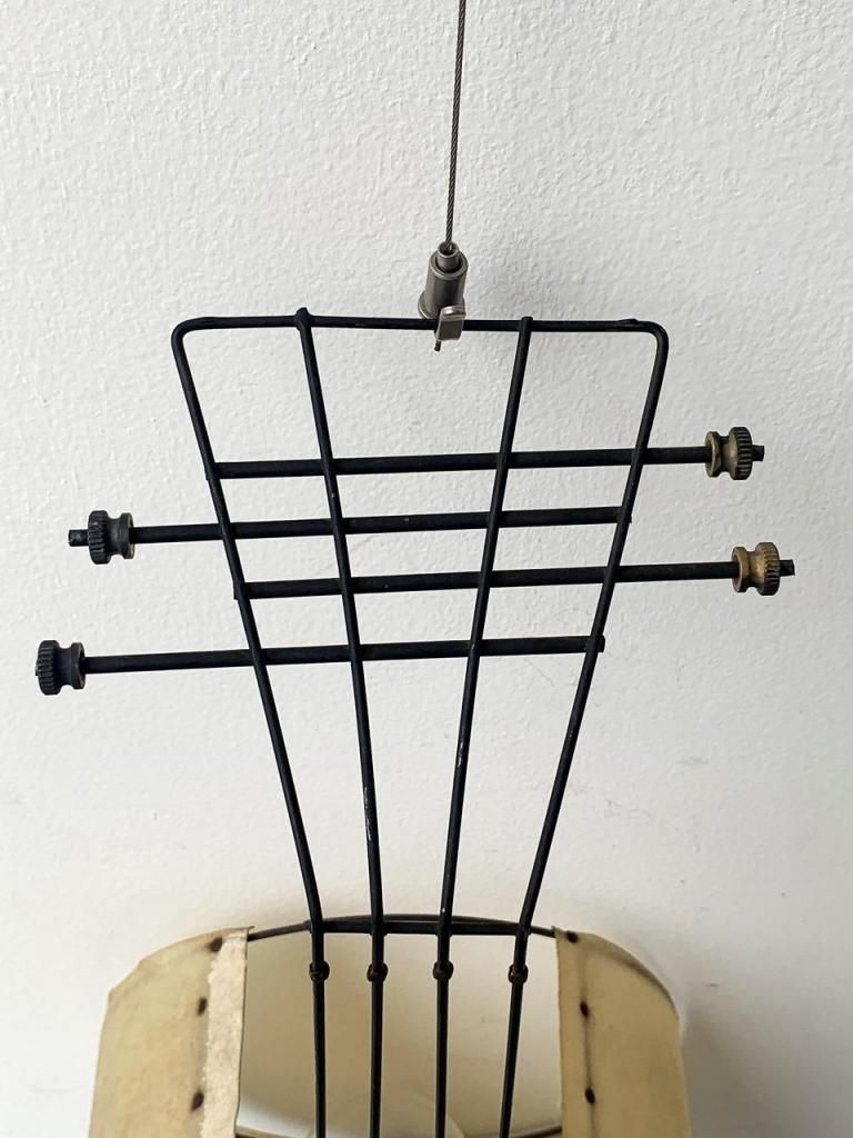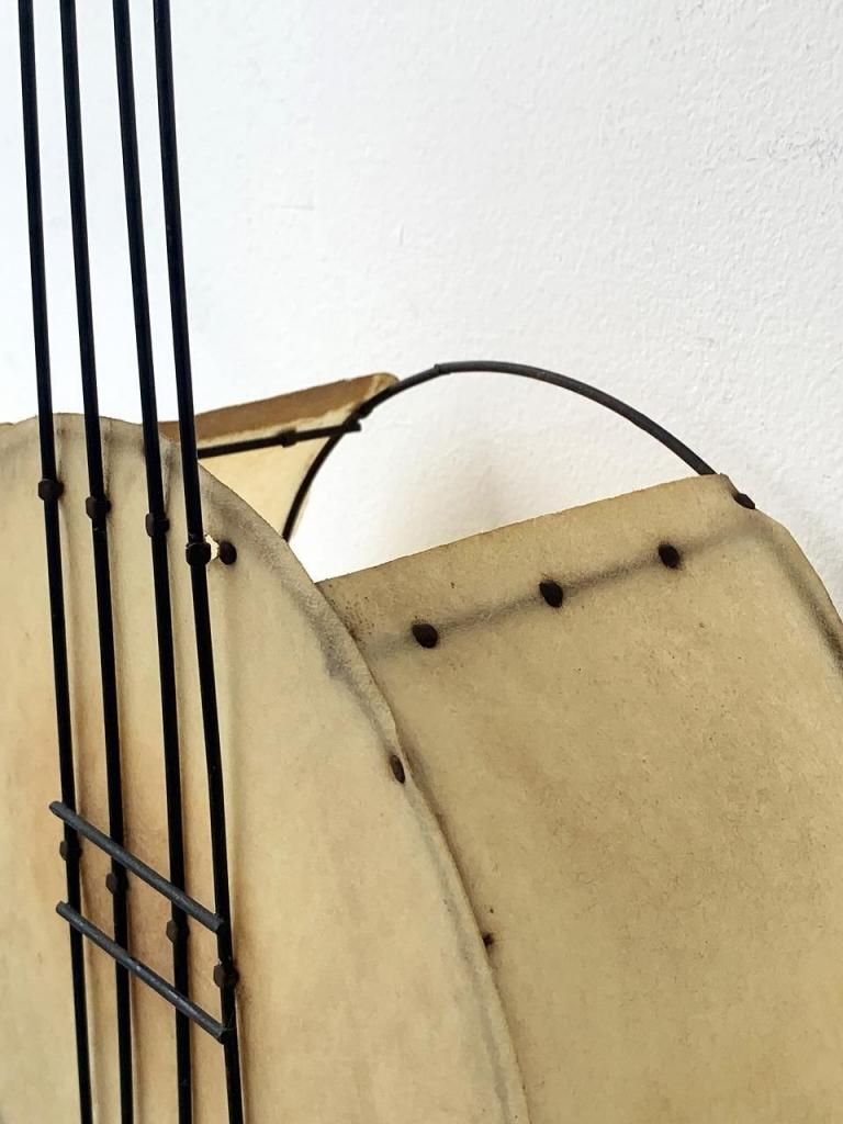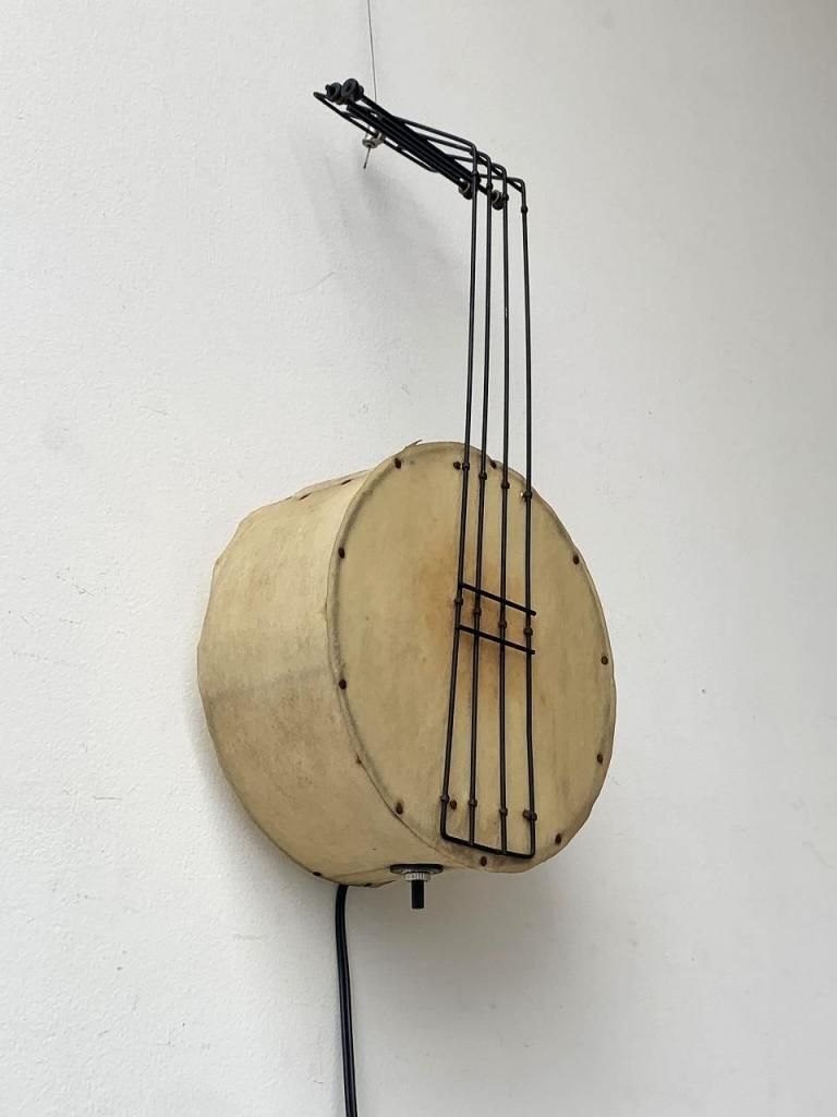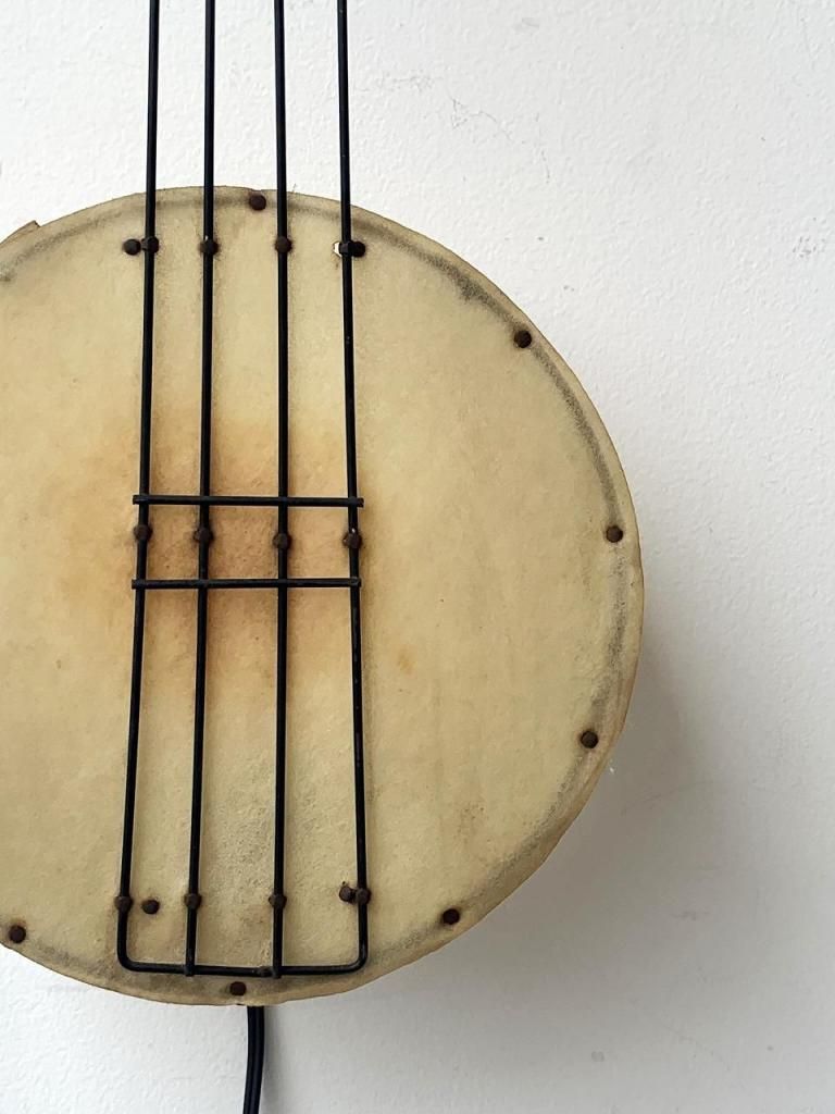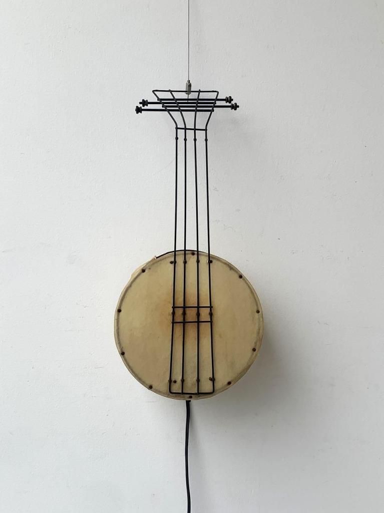 ブラックアイアンロッドでバンジョーのシルエットを抽象的に描いたデザインは、壁からわずかに浮かび、光ではなく線の影までもデザインの一部として演出します。