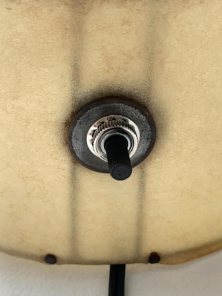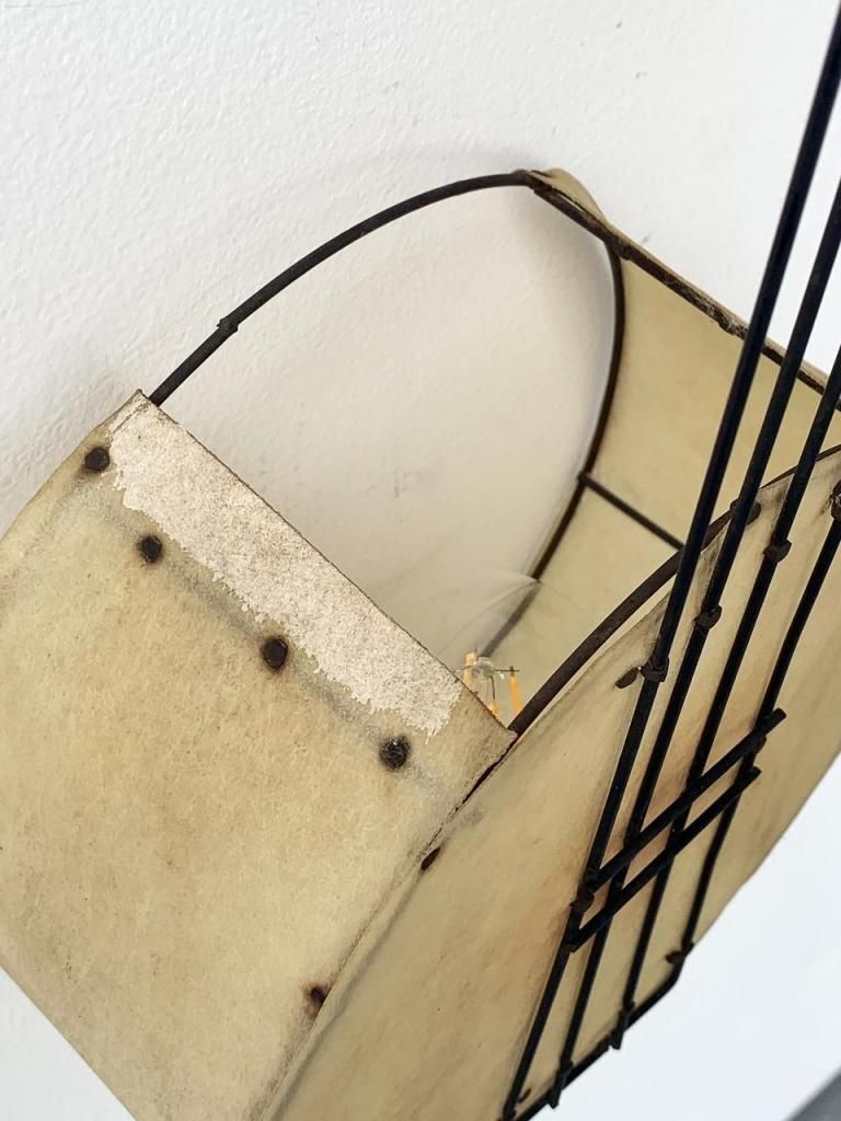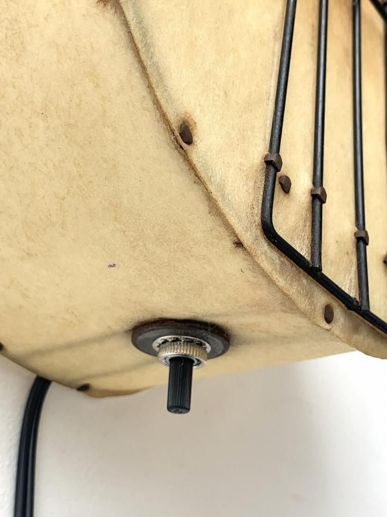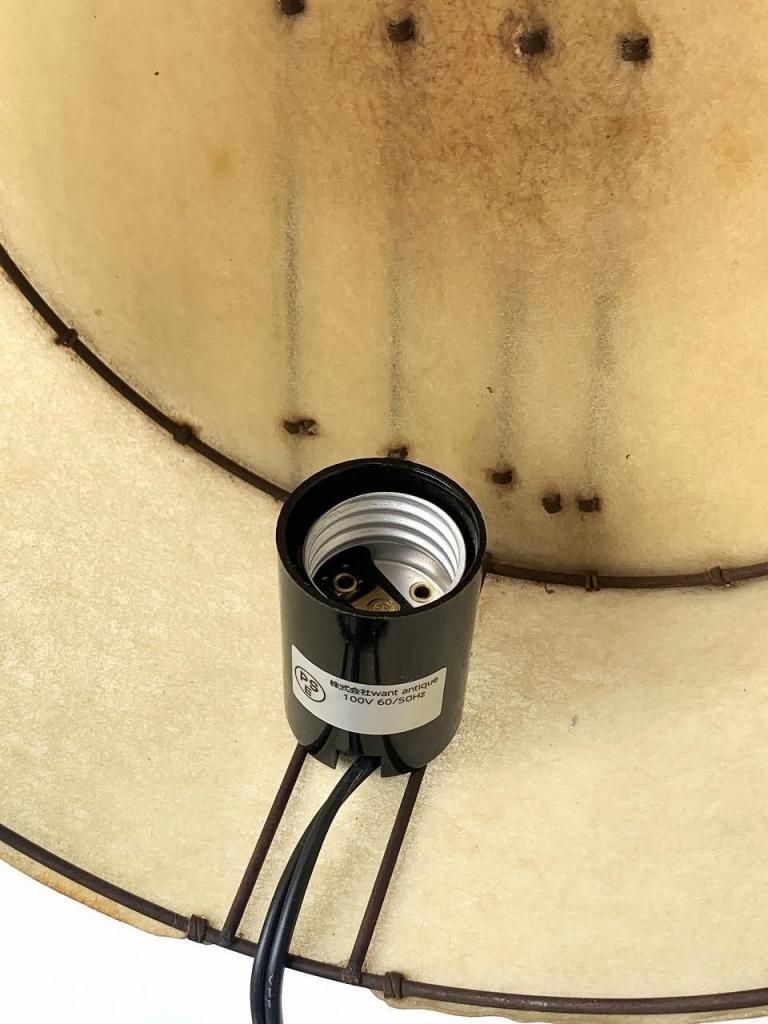 円形のシェードにはファイバー素材が用いられており、点灯時にはじんわりとした温度感のある光がにじむのが特徴です。ビス留めのリズムや、手作業で成形されたような仕上がりにも、当時の家庭のためのアートピースという思想が感じられます。