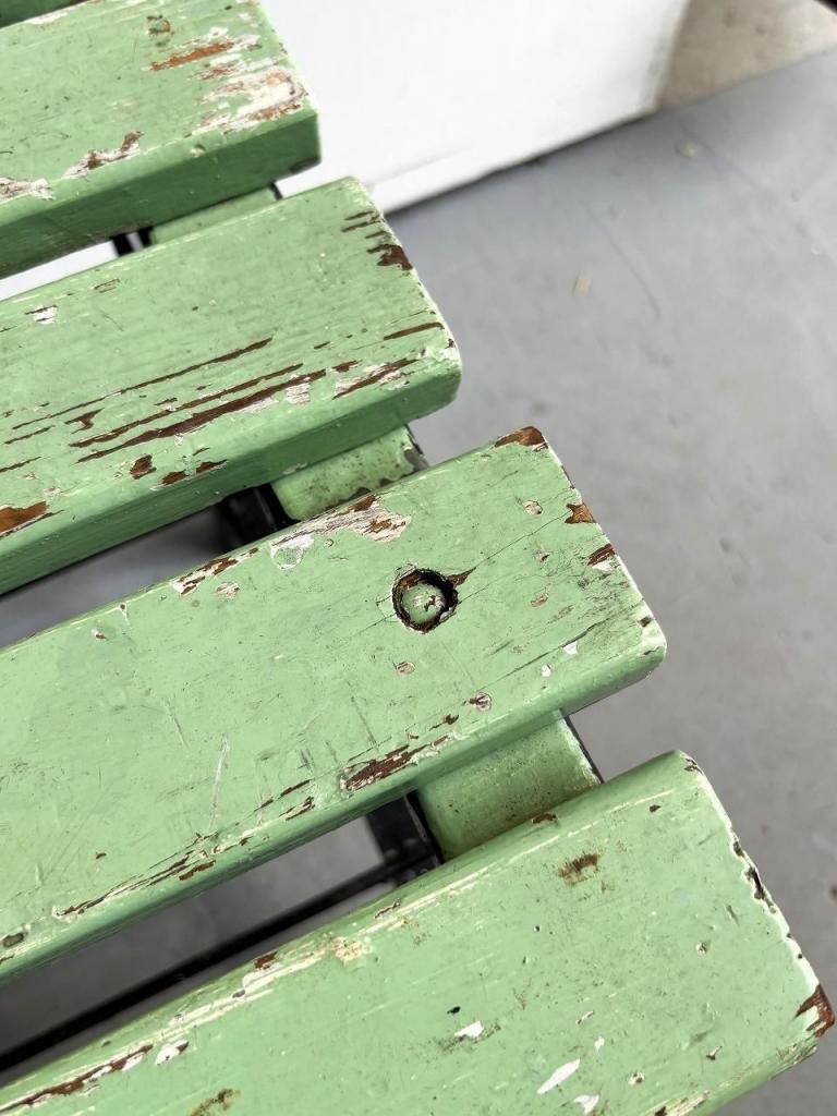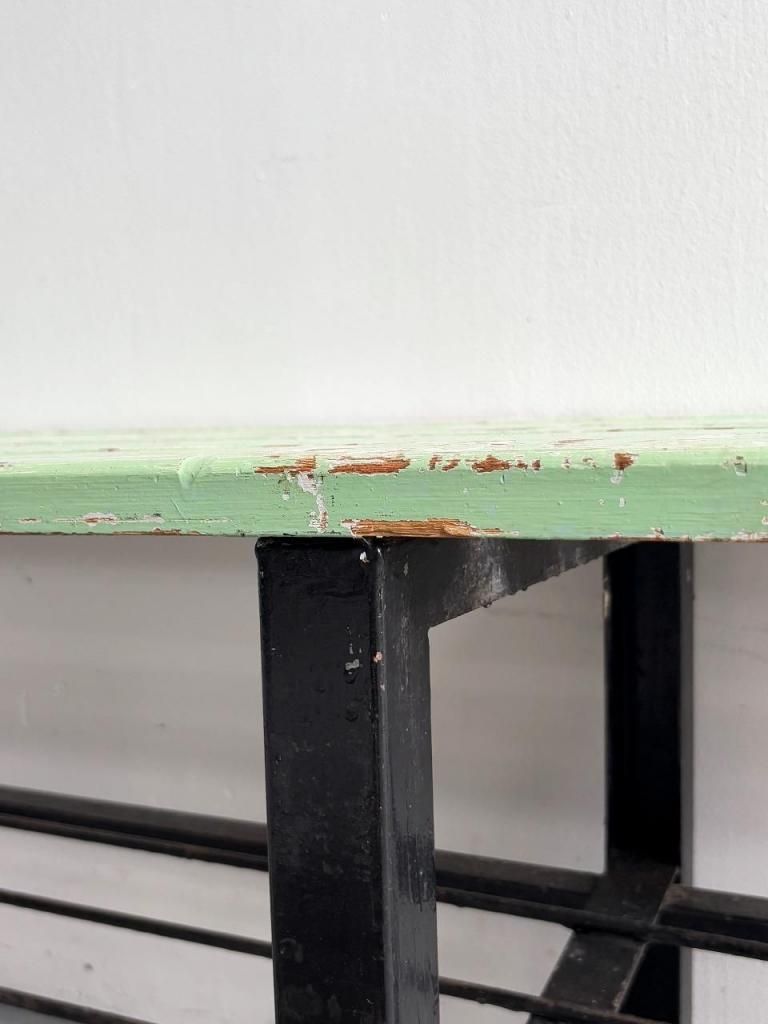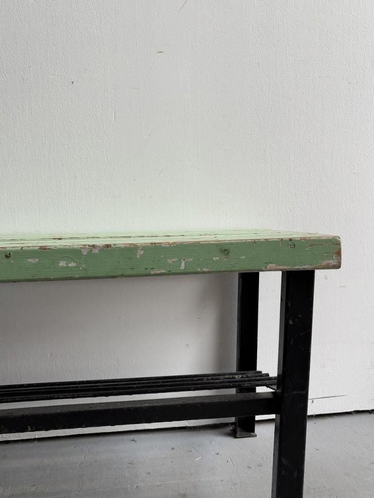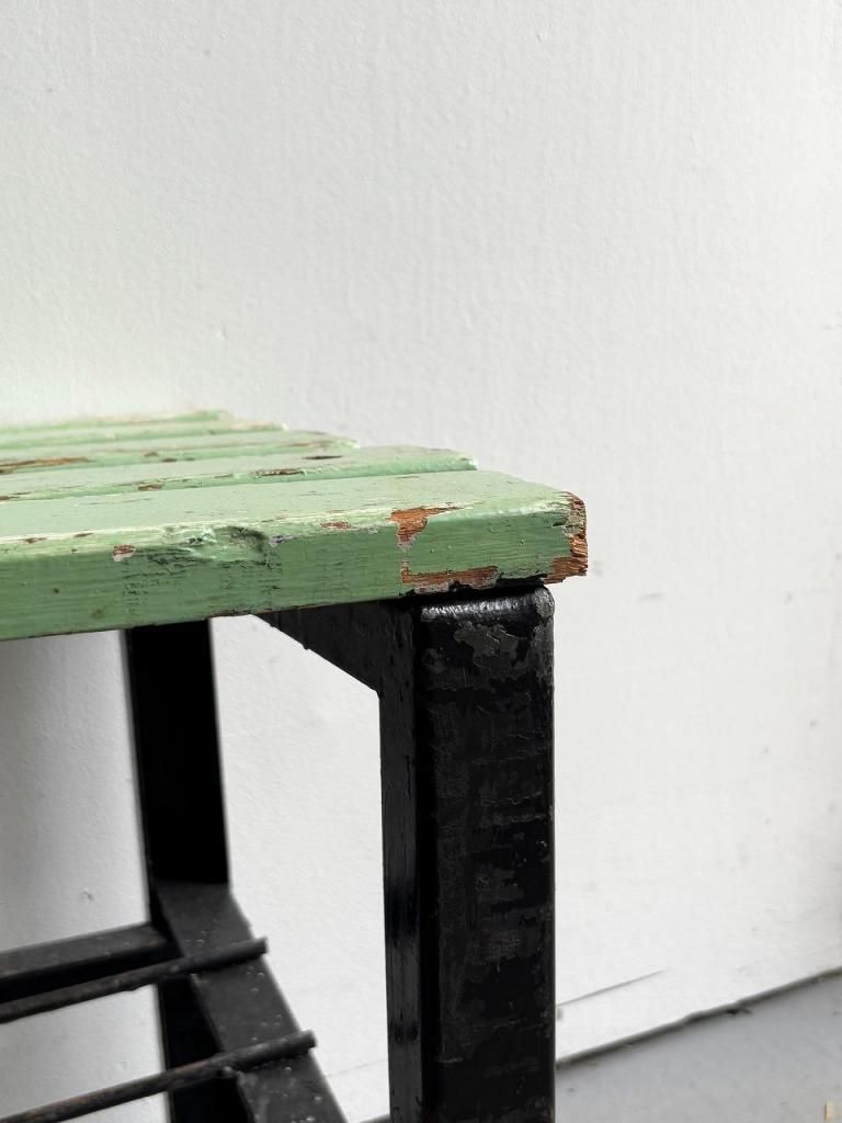 やれ感のあるエメラルドグリーンのウッド座面に無骨なブラックのアイアンベースとの組み合わせ。