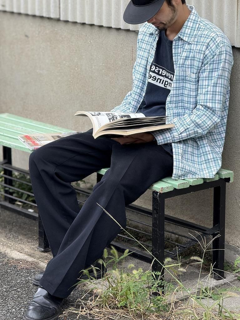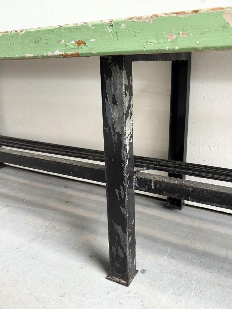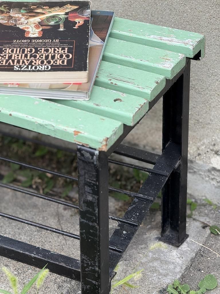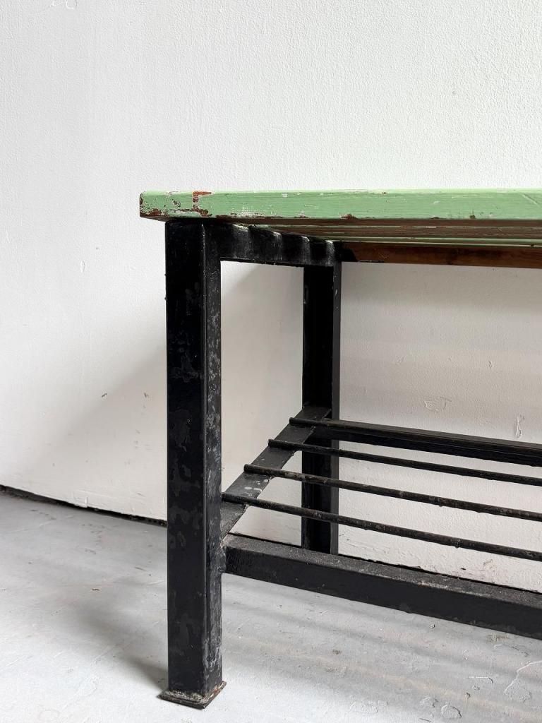 やれ感のあるエメラルドグリーンのウッド座面に無骨なブラックのアイアンベースとの組み合わせ。