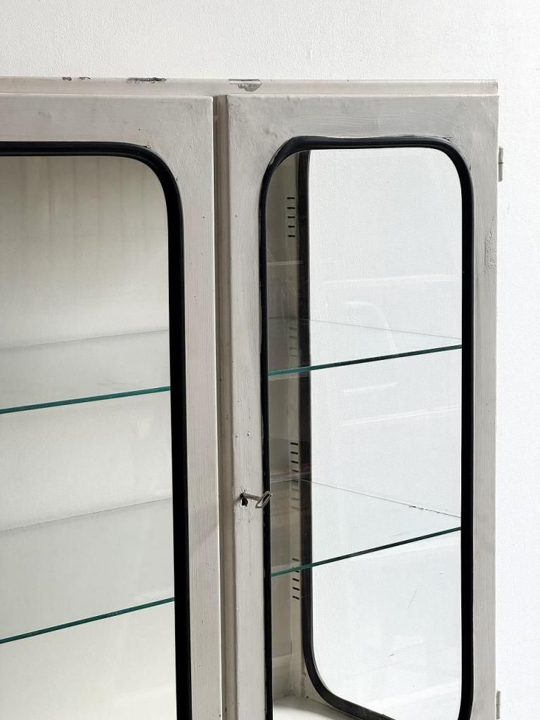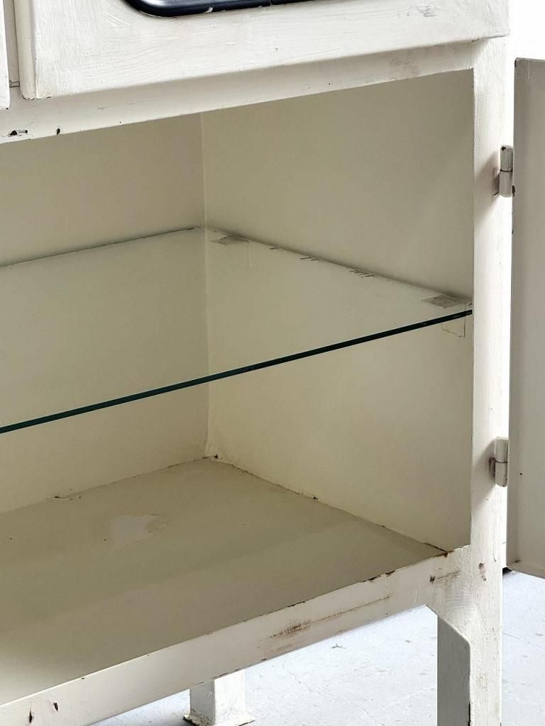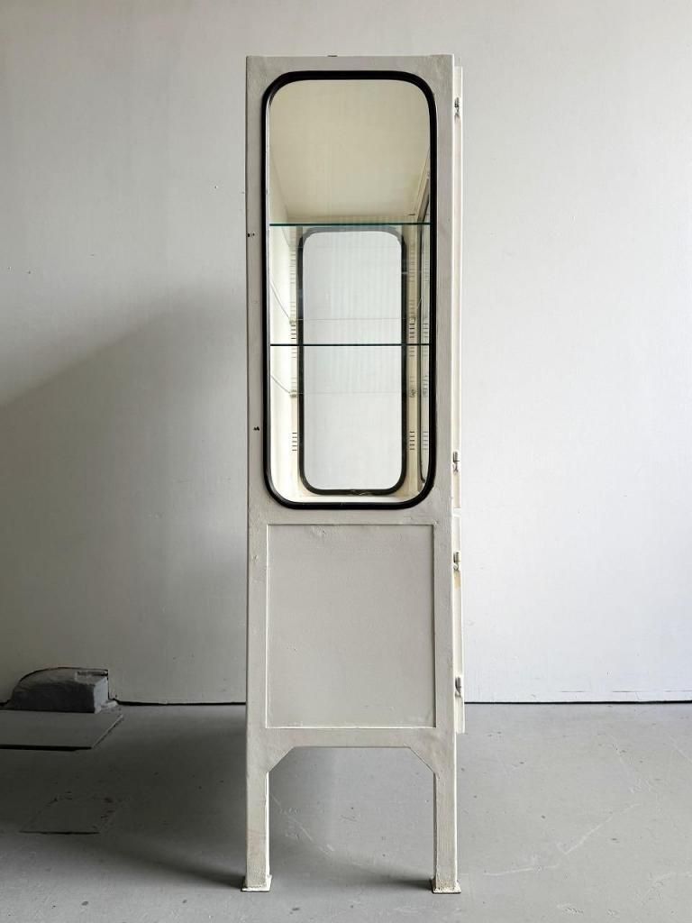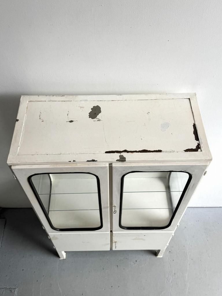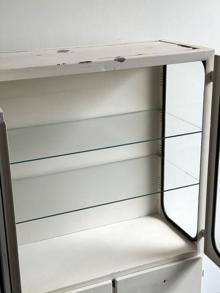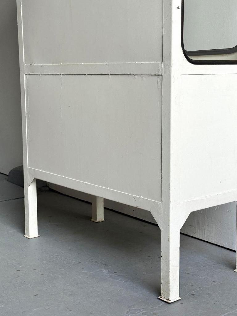 薬品や施術器具の保管庫として使用されていたキャビネットで、密閉性を高めるためにガラスにはゴムモールが取り付けられていて、ホワイトのボディとのコントラストが効いているのも医療用ならではです。