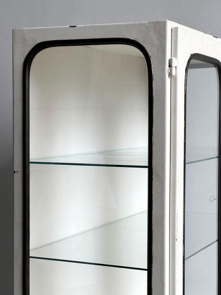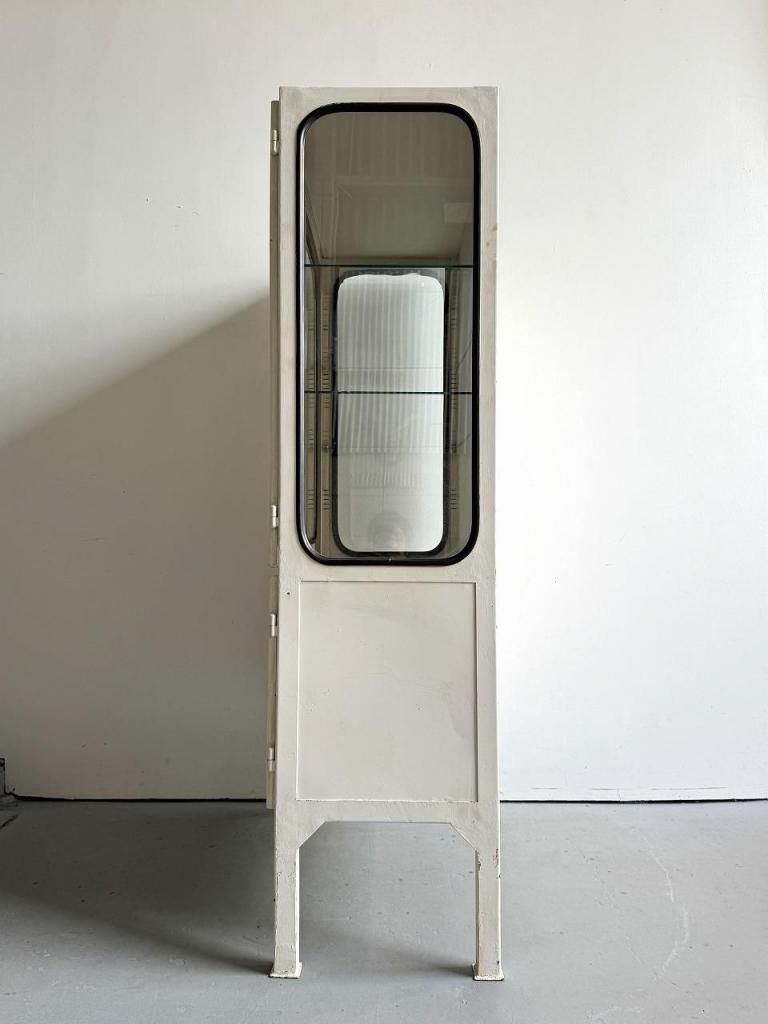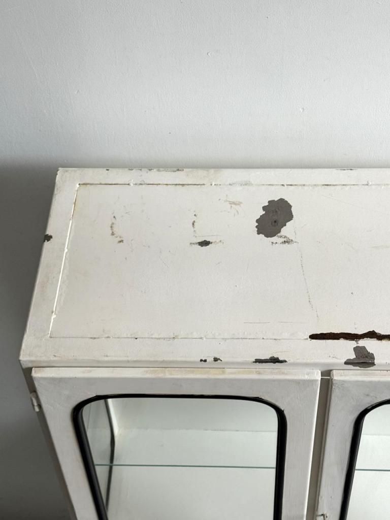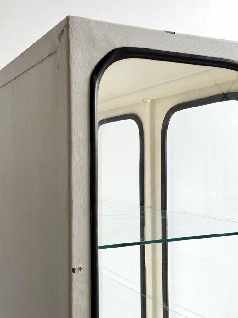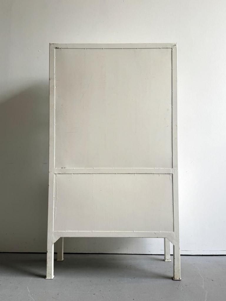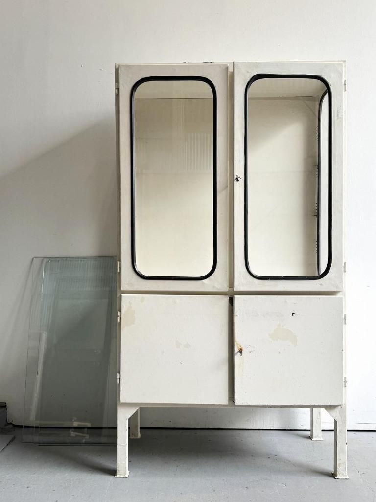 薬品や施術器具の保管庫として使用されていたキャビネットで、密閉性を高めるためにガラスにはゴムモールが取り付けられていて、ホワイトのボディとのコントラストが効いているのも医療用ならではです。