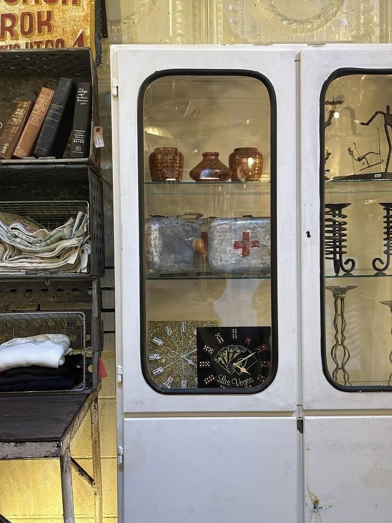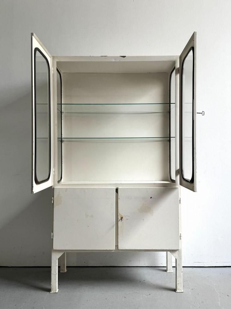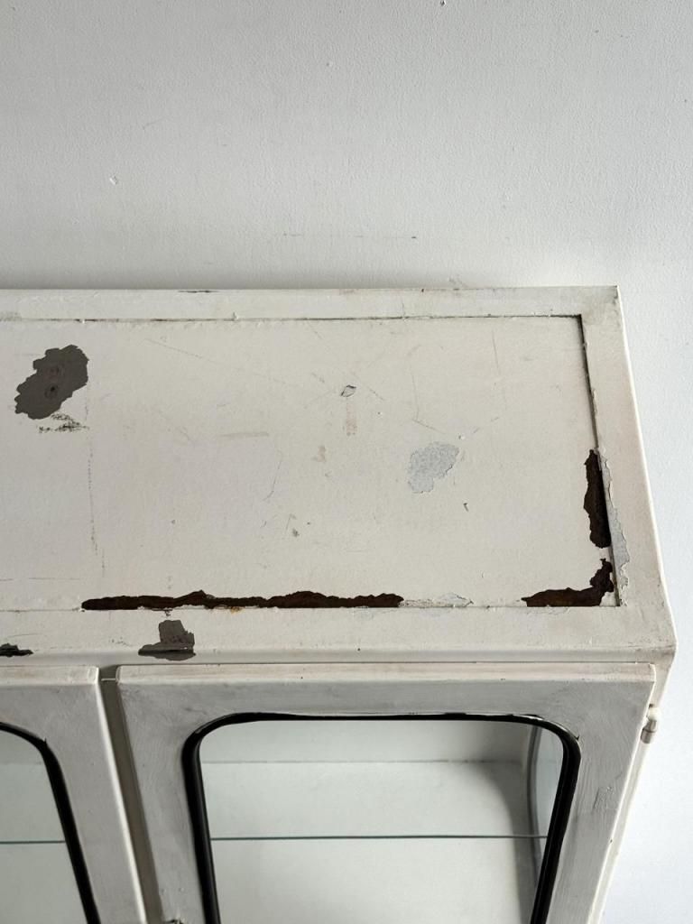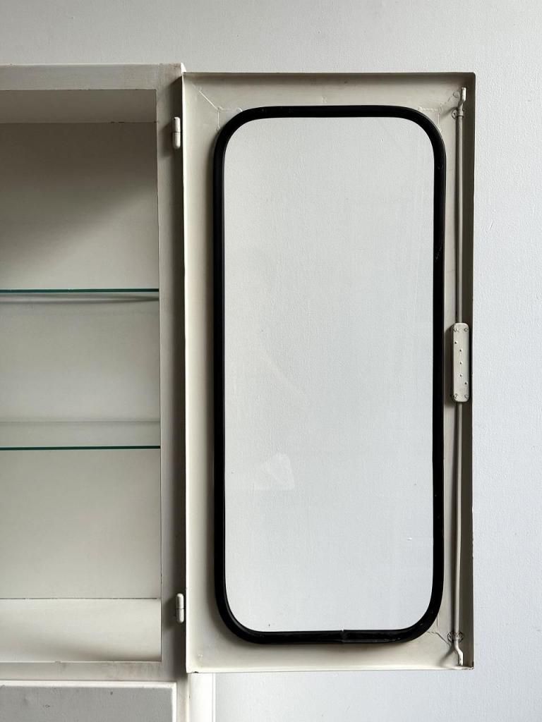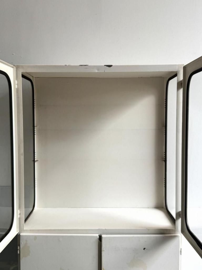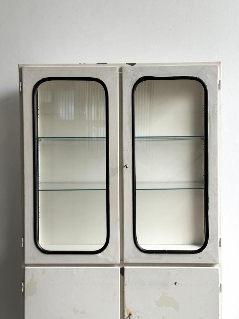 薬品や施術器具の保管庫として使用されていたキャビネットで、密閉性を高めるためにガラスにはゴムモールが取り付けられていて、ホワイトのボディとのコントラストが効いているのも医療用ならではです。