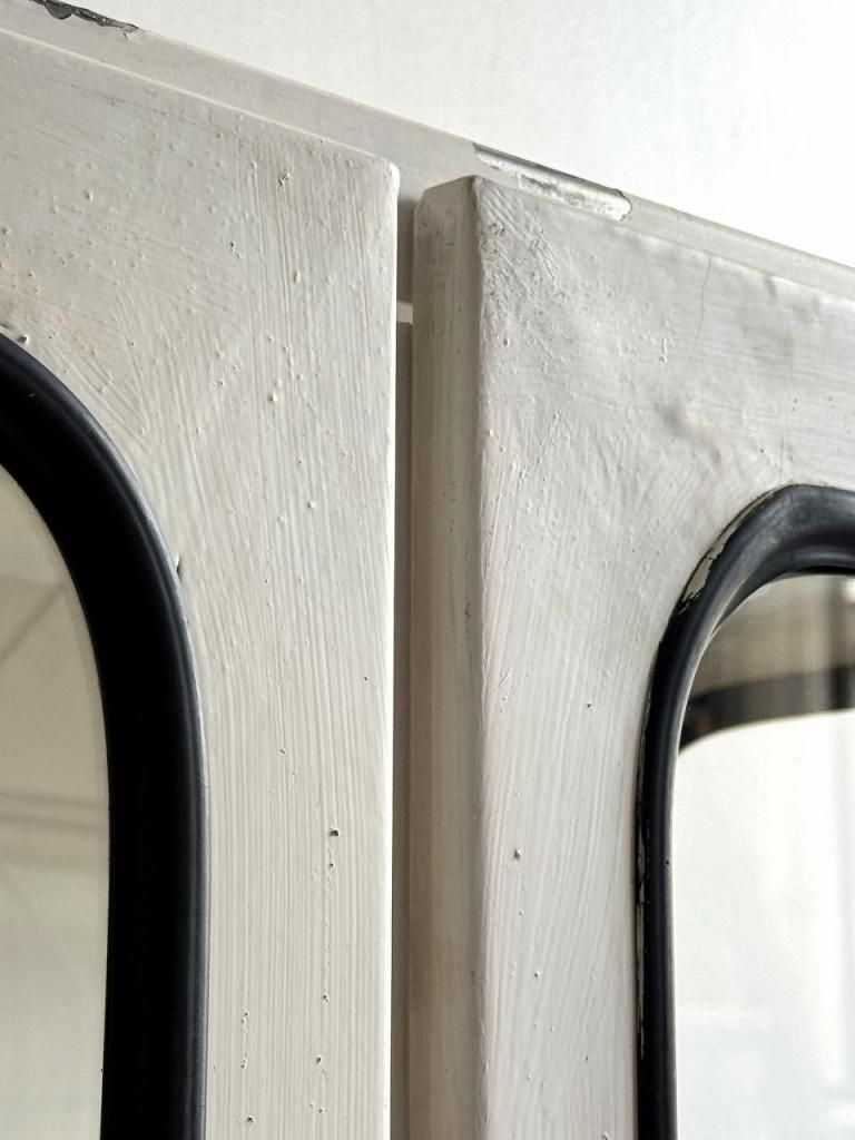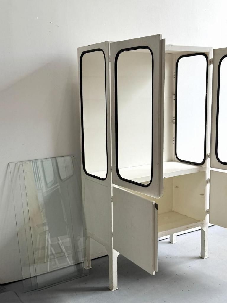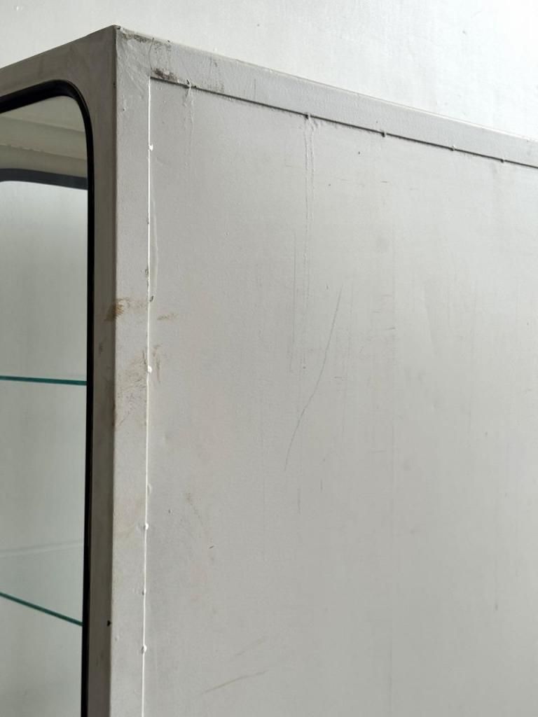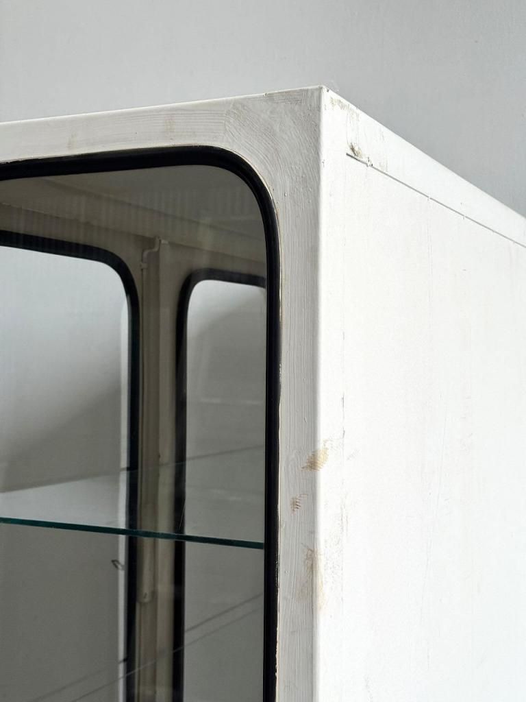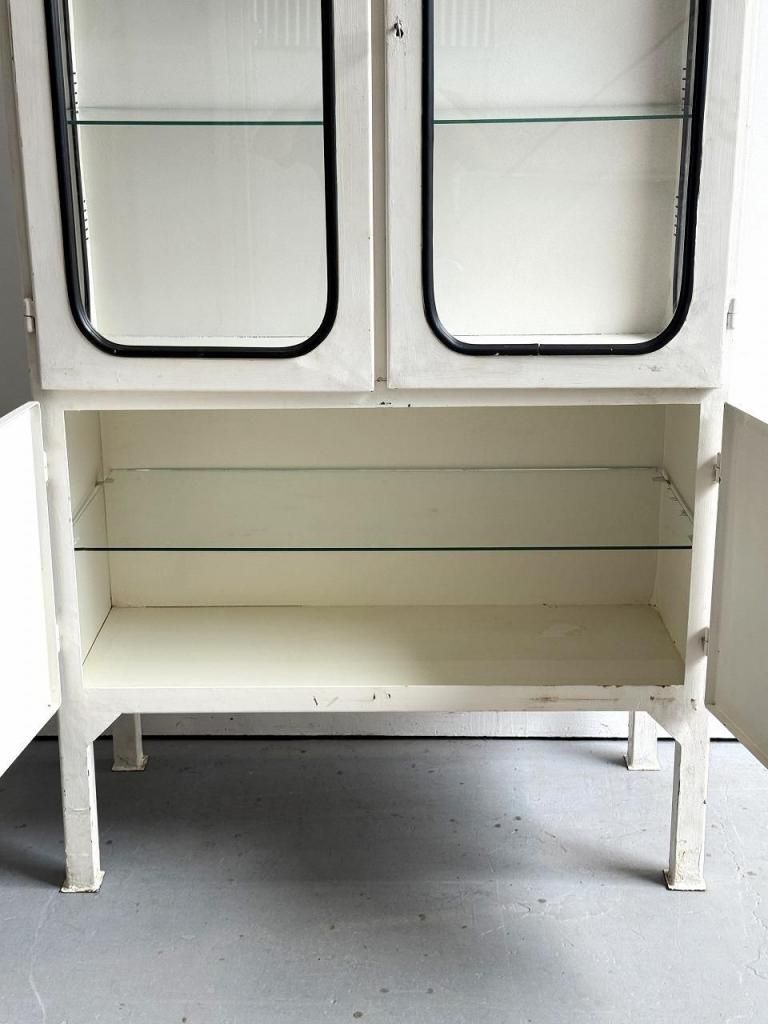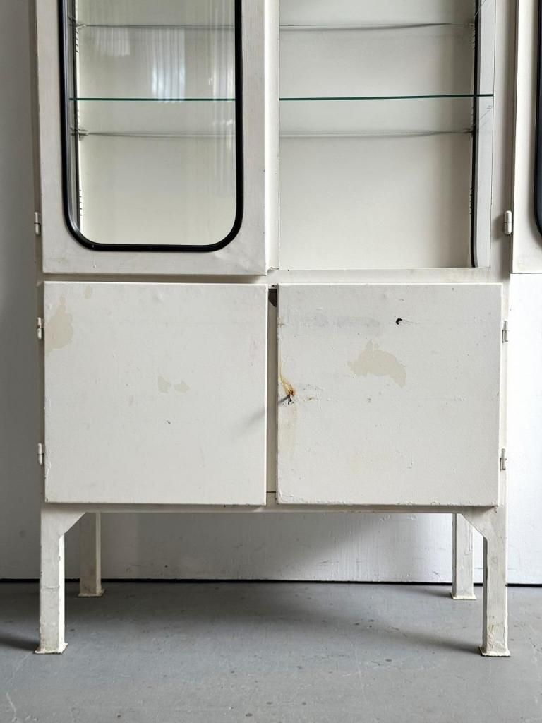 薬品や施術器具の保管庫として使用されていたキャビネットで、密閉性を高めるためにガラスにはゴムモールが取り付けられていて、ホワイトのボディとのコントラストが効いているのも医療用ならではです。
