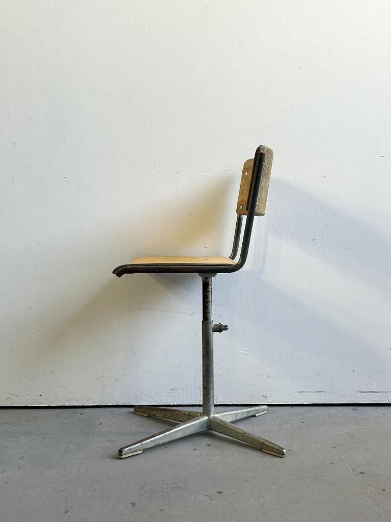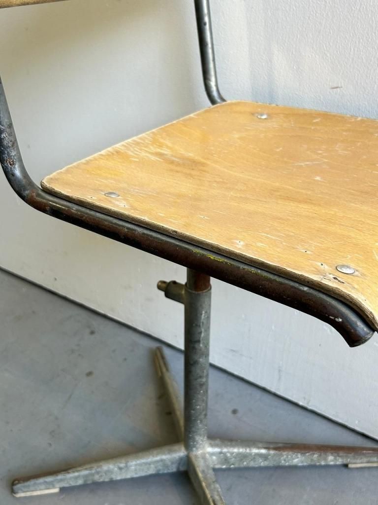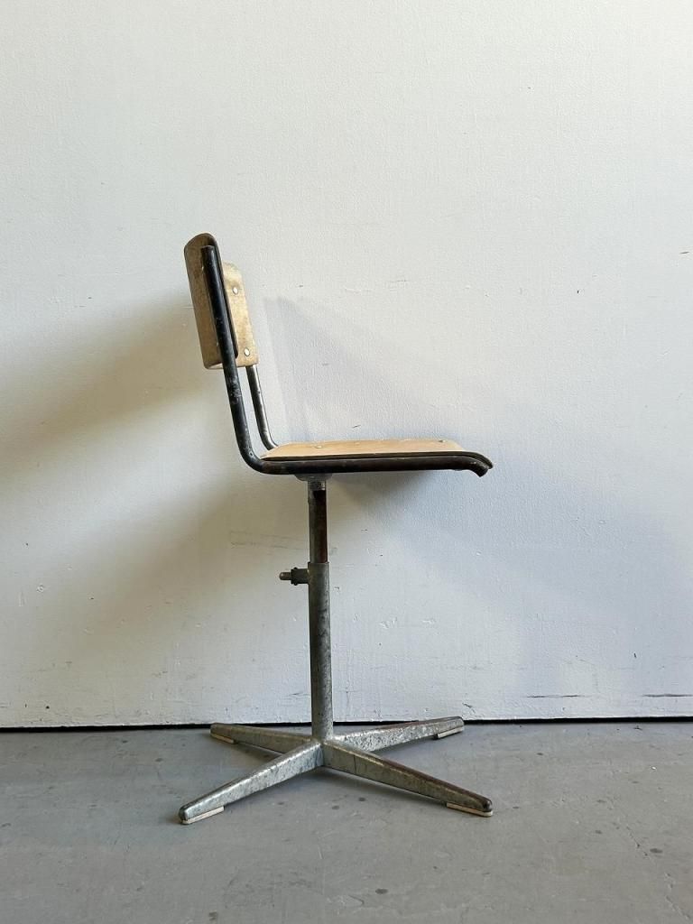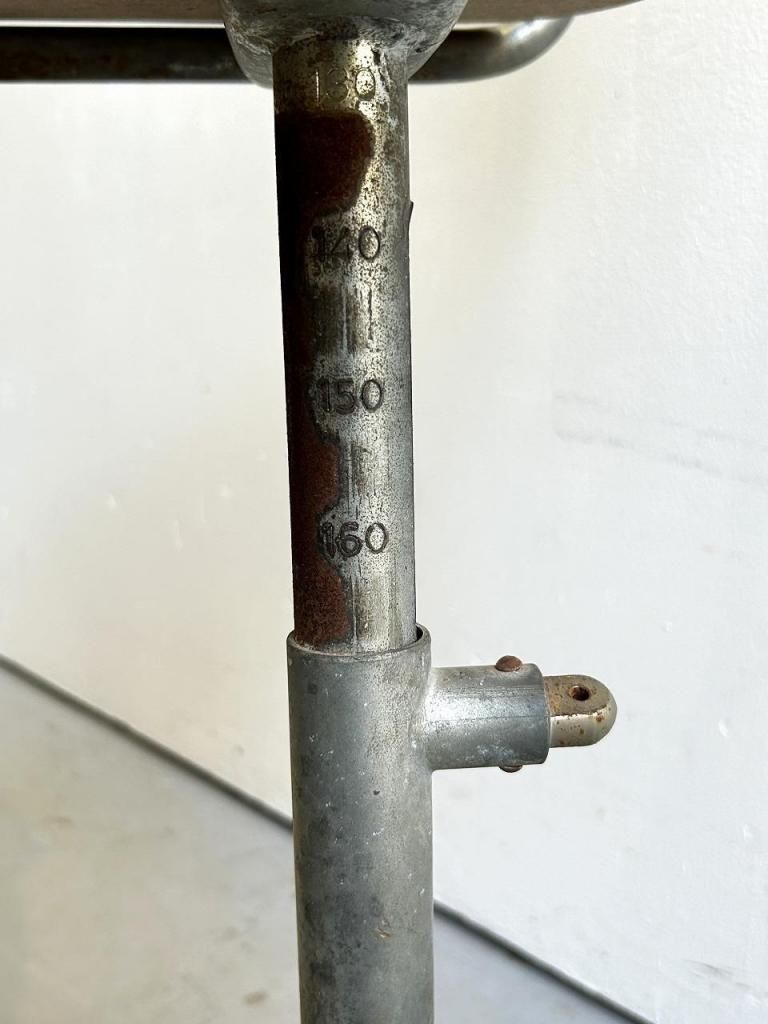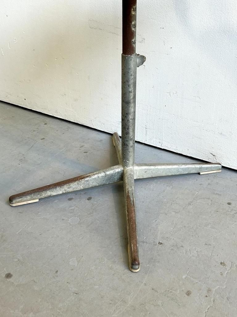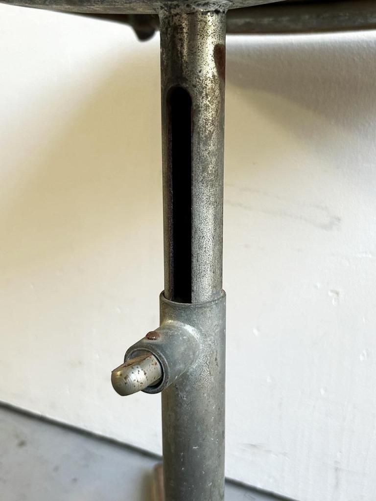 金属脚は4本の放射状ベースで、中央ポールには高さ調節用の目盛りとストッパーが備わった機構が見られ、当時の工房や製図室などで使われていたことがうかがえます。