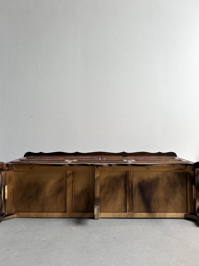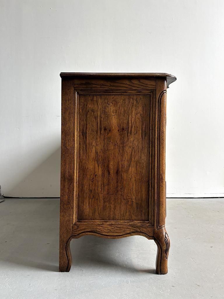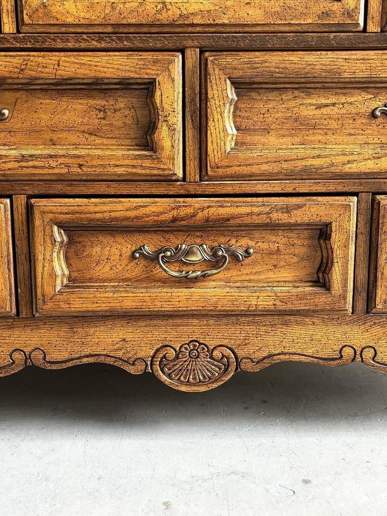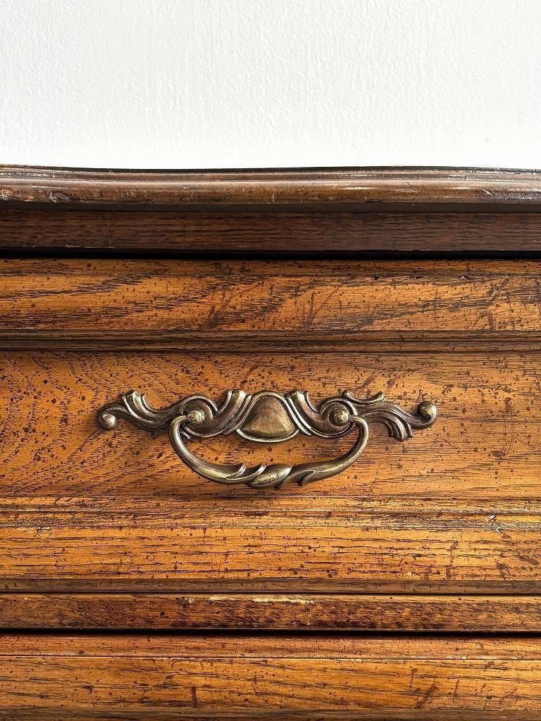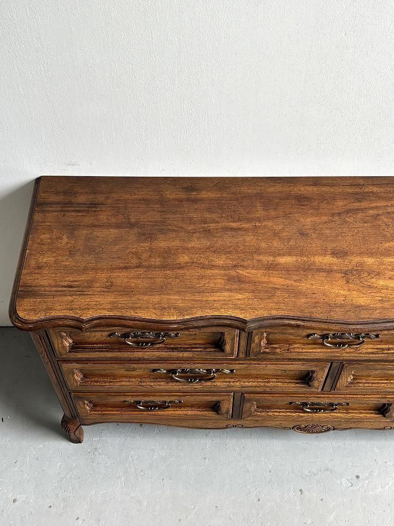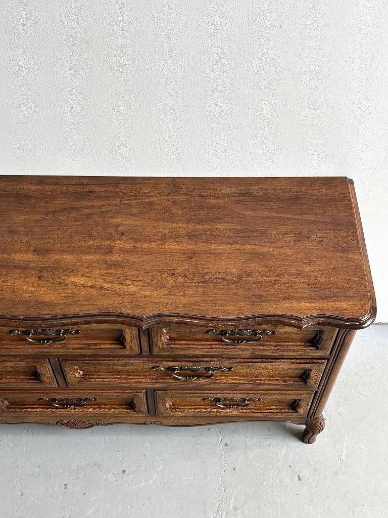 本品は、当時の代表的な人気スタイルである French Provincial(フレンチ・プロヴィンシャル)を色濃く反映したデザインとなっており、ゆるやかな曲線を描く天板、波打つスカラップ装飾、猫脚、そして引き出し前板の立体的フレームなど、優美でありながら重厚感を併せ持った意匠が特徴です。