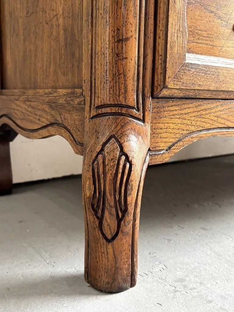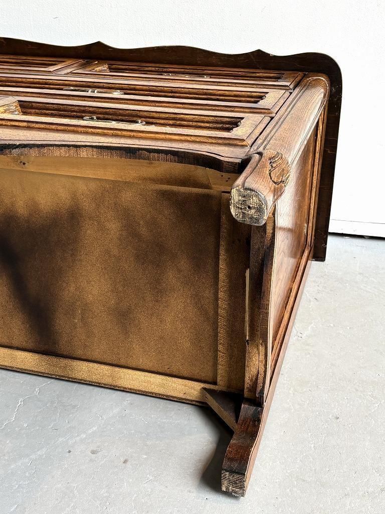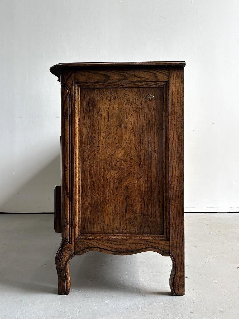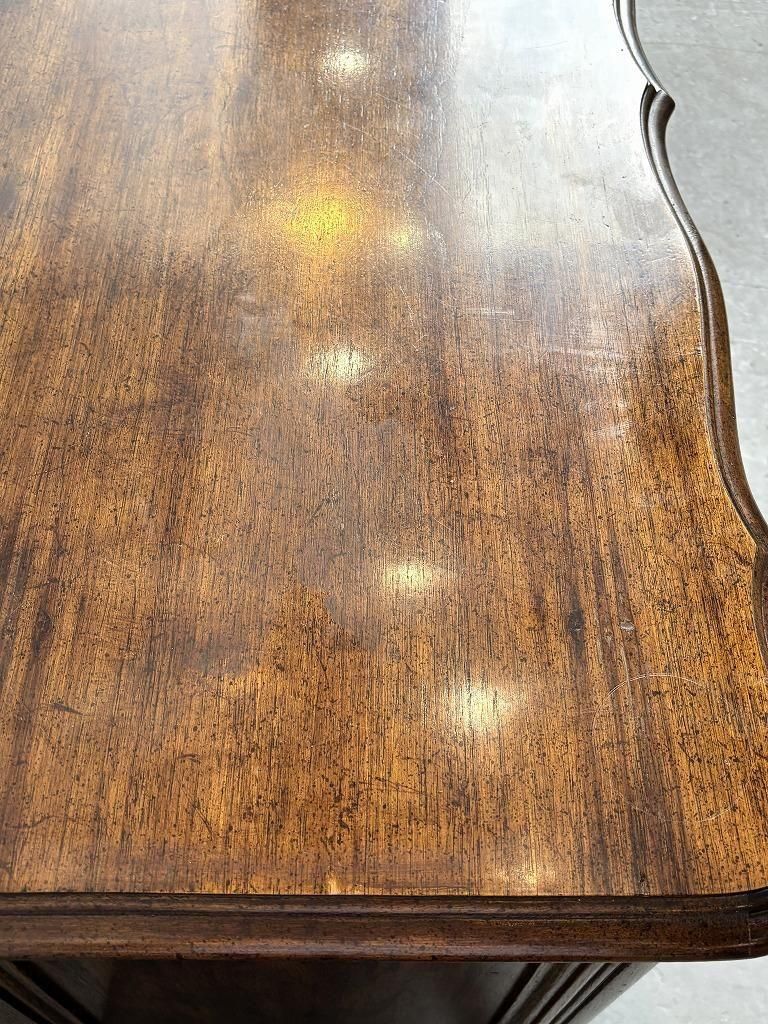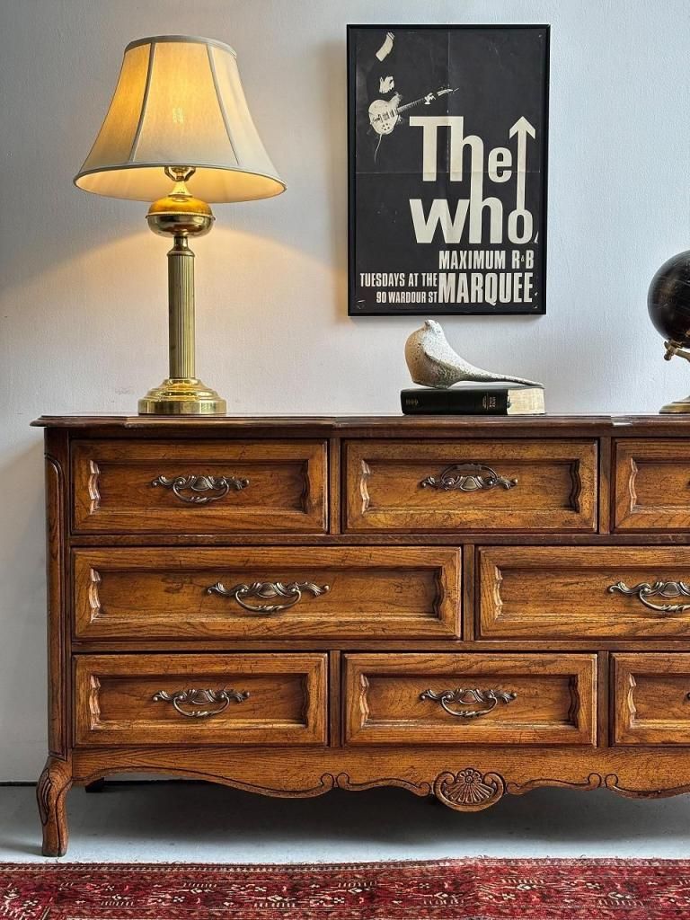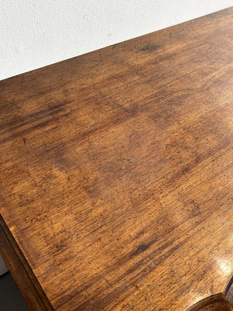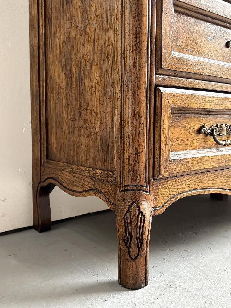 本品は、当時の代表的な人気スタイルである French Provincial(フレンチ・プロヴィンシャル)を色濃く反映したデザインとなっており、ゆるやかな曲線を描く天板、波打つスカラップ装飾、猫脚、そして引き出し前板の立体的フレームなど、優美でありながら重厚感を併せ持った意匠が特徴です。