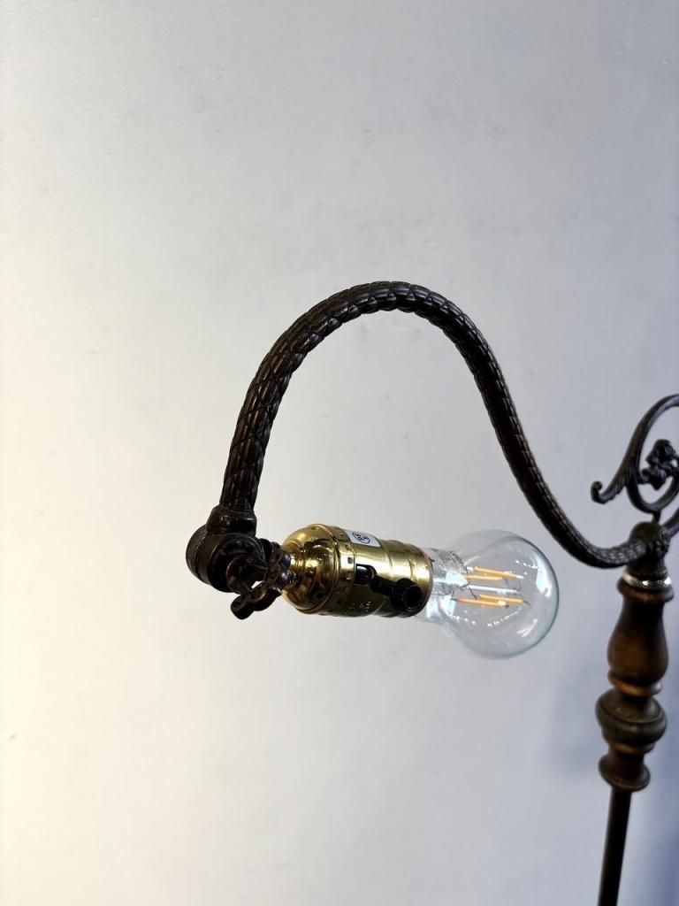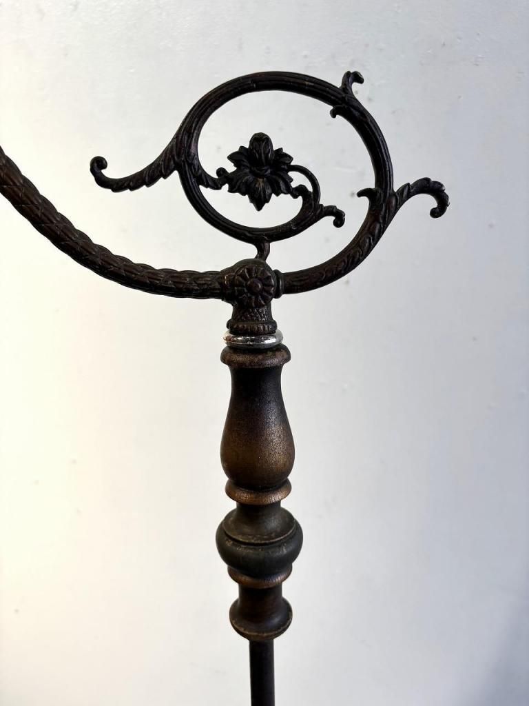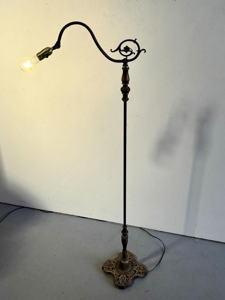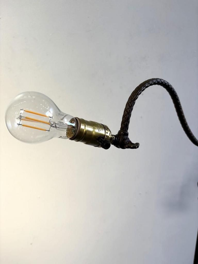 鉄製のアームは鞭のようにうねるS字曲線になっており、重量感ある鋳鉄ベースでありながら、透かし装飾により、鉄でありながらレースのような視覚的な軽やかさとなっています。