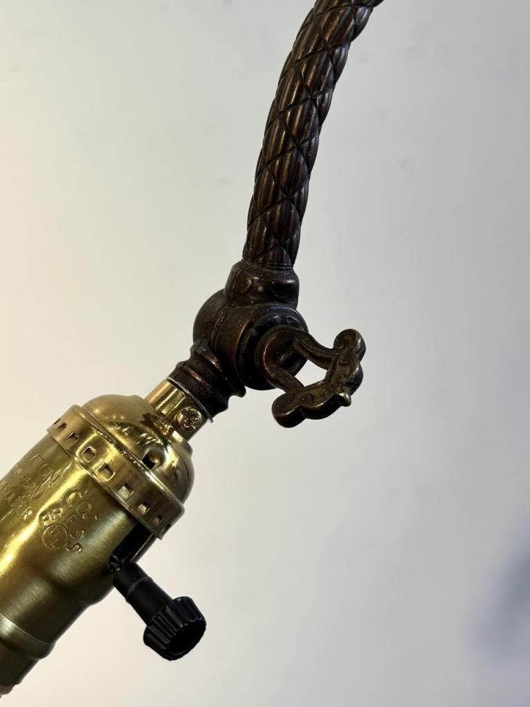 アールヌーボー的な植物のような曲線装飾と、アイアンで表現されたろくろ挽きのシルエットが特徴的な1灯。
