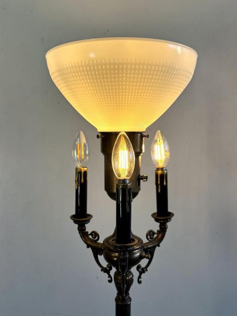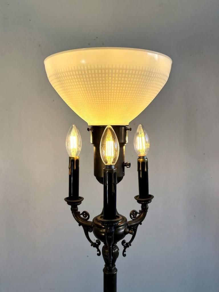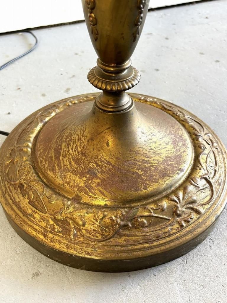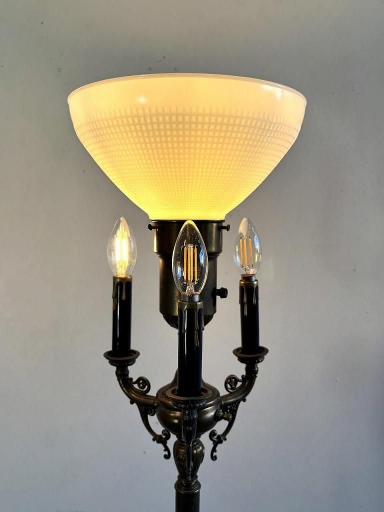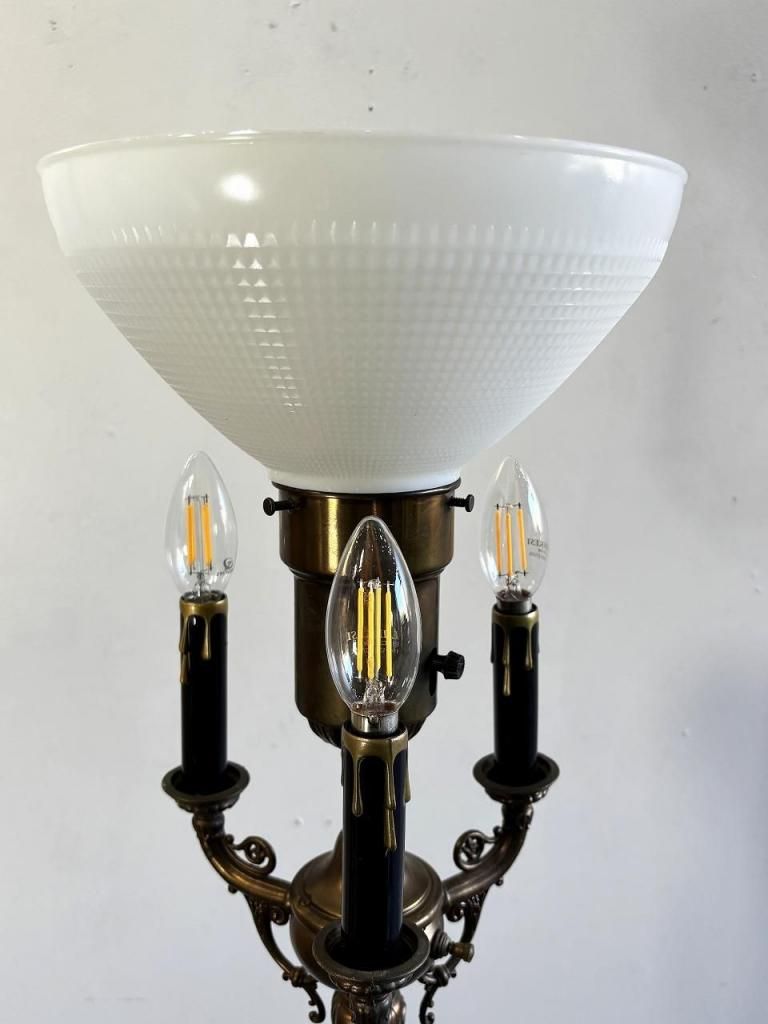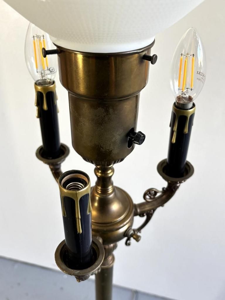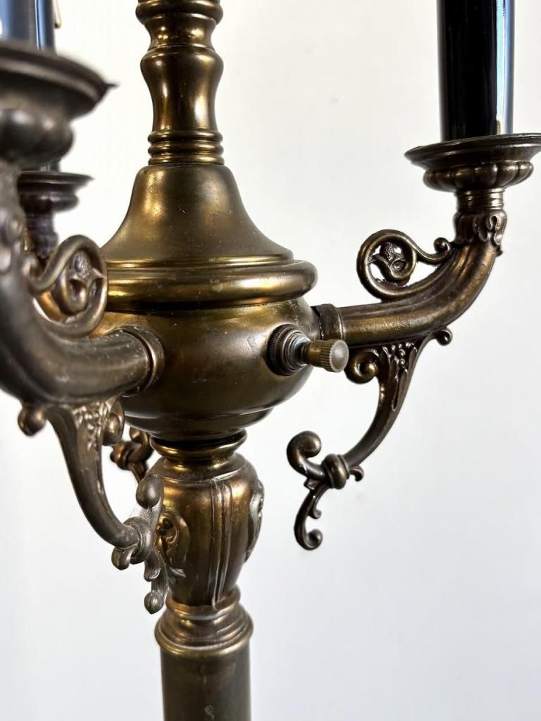 アンティーク特有のクラシカルな意匠を備えた1灯+3灯構造の4灯タイプで、キャンドルソケットや、支柱やベースに施されたリーフモチーフの装飾が印象的な一台。