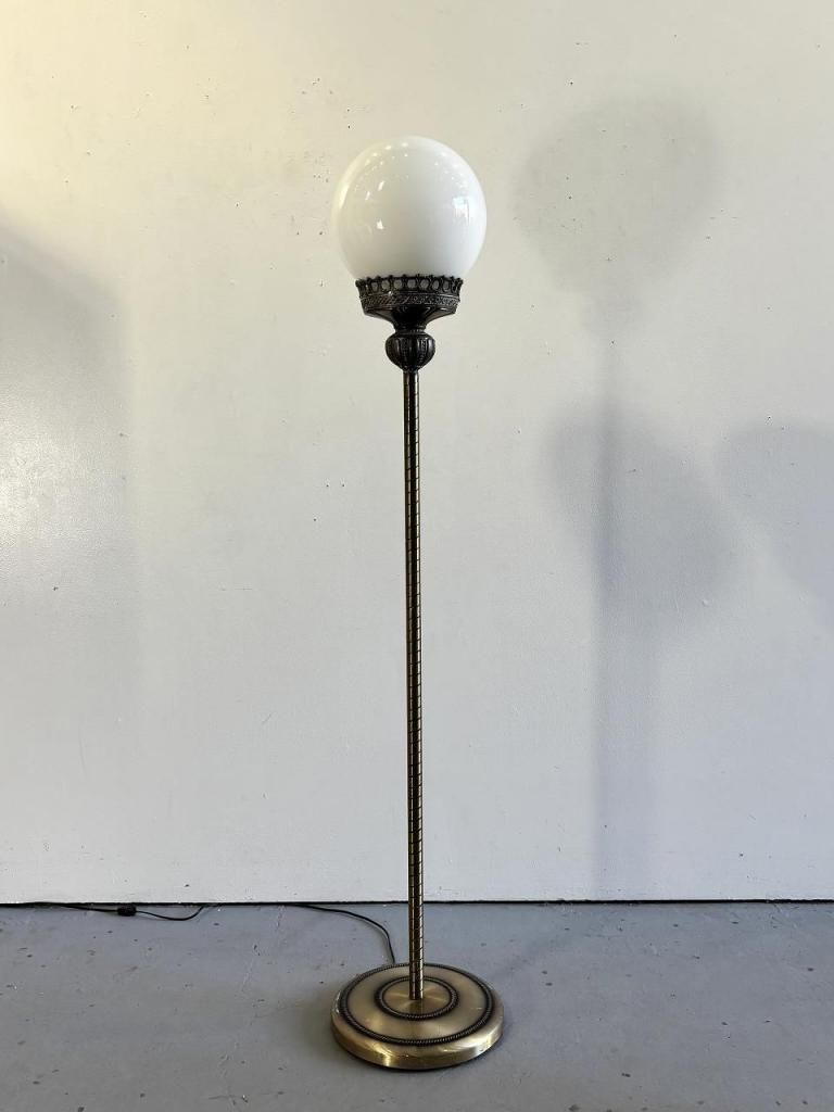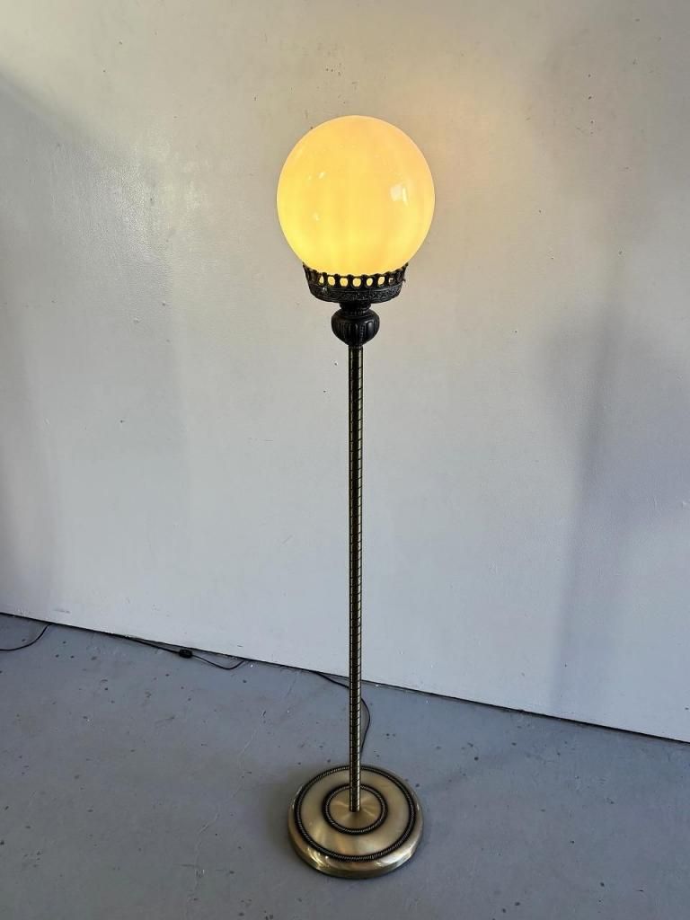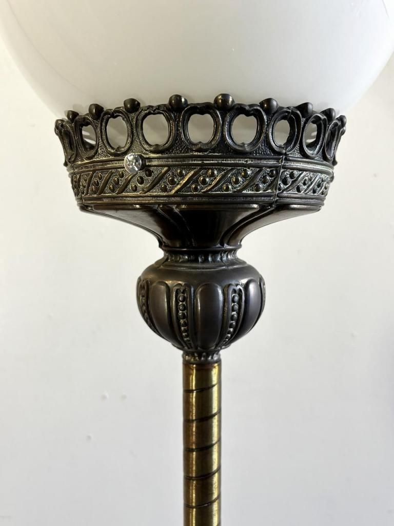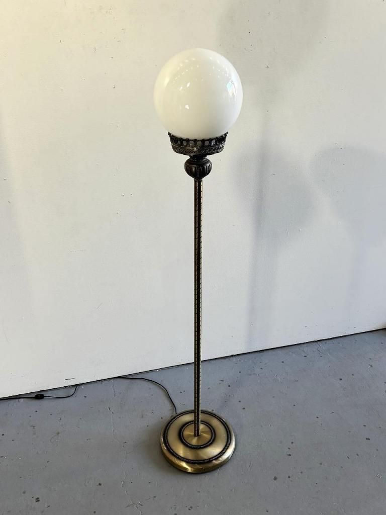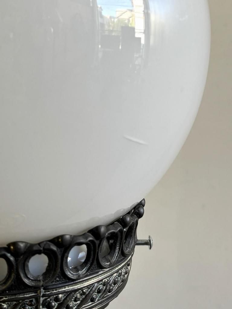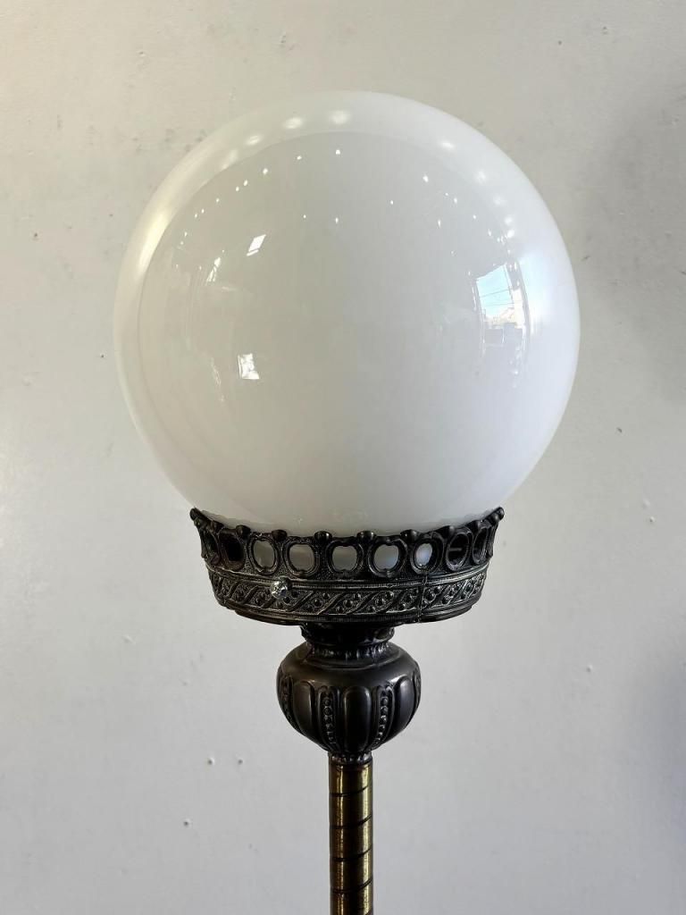 球体のホワイトガラスシェードに、装飾的なソケットカバーとスパイラル状の支柱を組み合わせたデザインの一台。