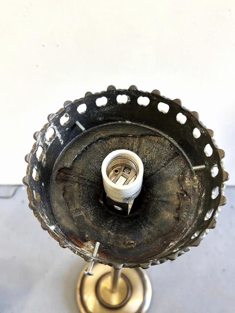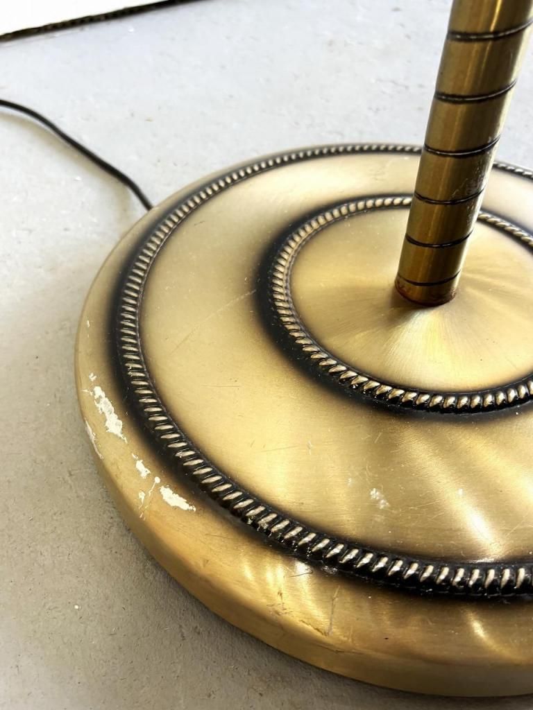 全体はブラスカラーで統一され、ベース部分のディテールやロープ模様の装飾など、当時の工業的な技術と装飾美が融合しています。