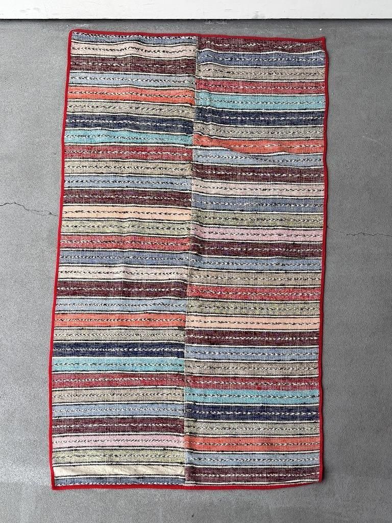 当時は台所や寝室などの生活空間で実際に使用されていたもので、フロアラグとして玄関・ベッドサイド・ソファ前など、足元のアクセントにはもちろん、床に敷くだけでなく、壁掛けやテーブル下、ベンチカバーなどにもおすすめです。