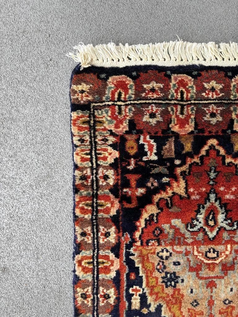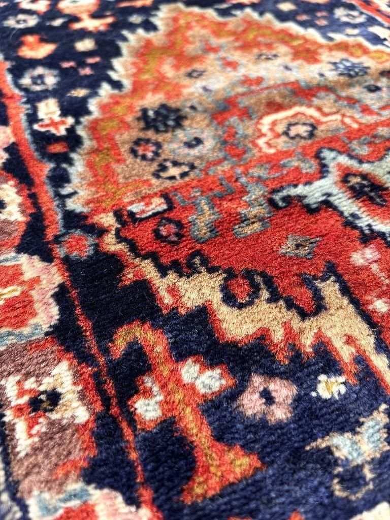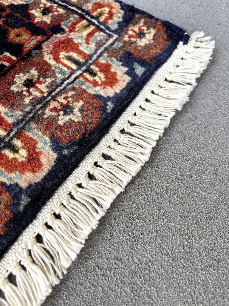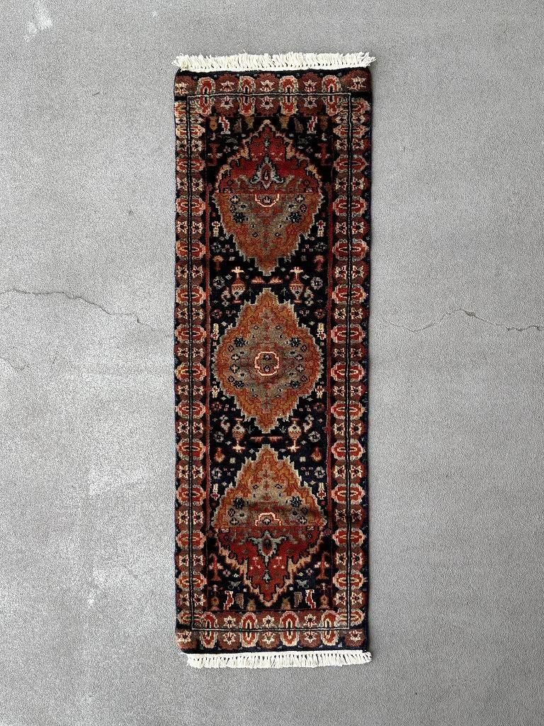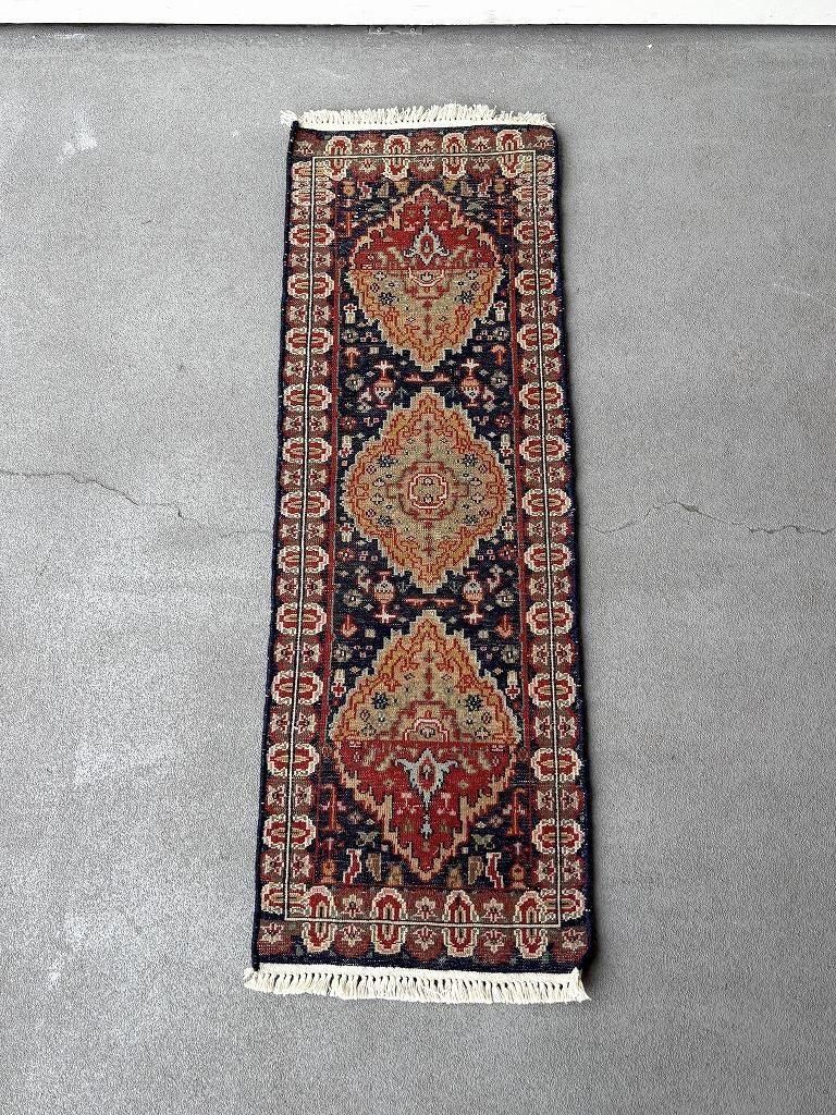 ハンドノット(手結び)により一枚一枚つくられており、中央から上下に並ぶメダリオンが3つ配置され、細く縦に長い帯状の中に対してバランス良く収まっています。