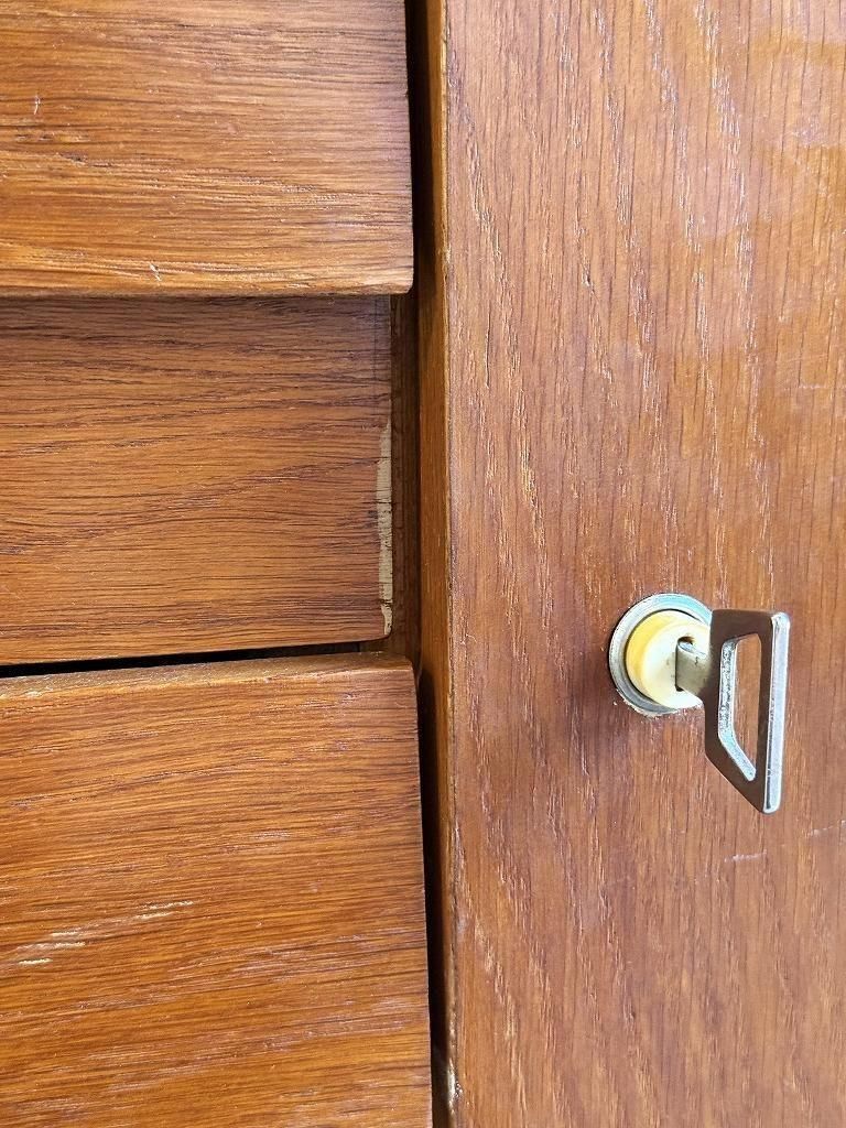 右側には4段の引き出し、左側には棚板付きの収納スペースを備え、日常使いに十分な容量を確保しています。左側の扉には鍵が付属しています。