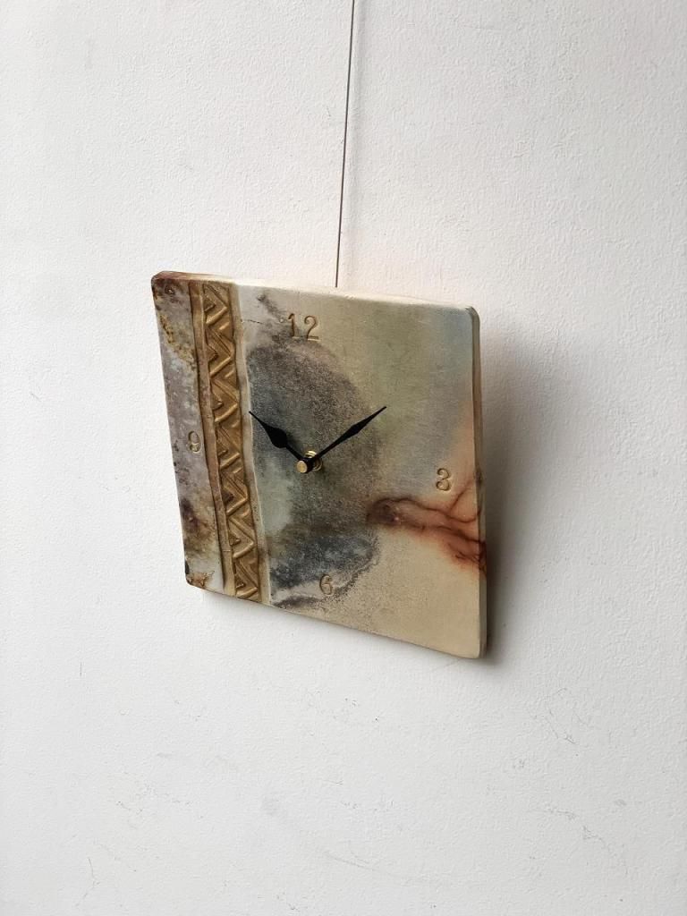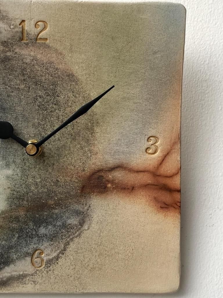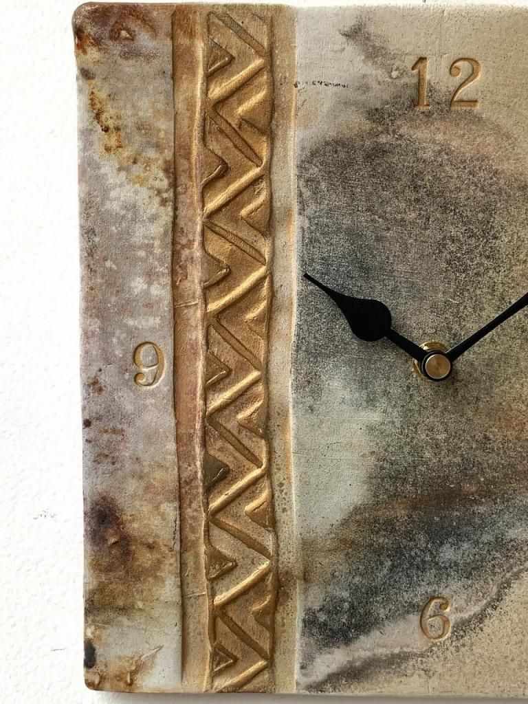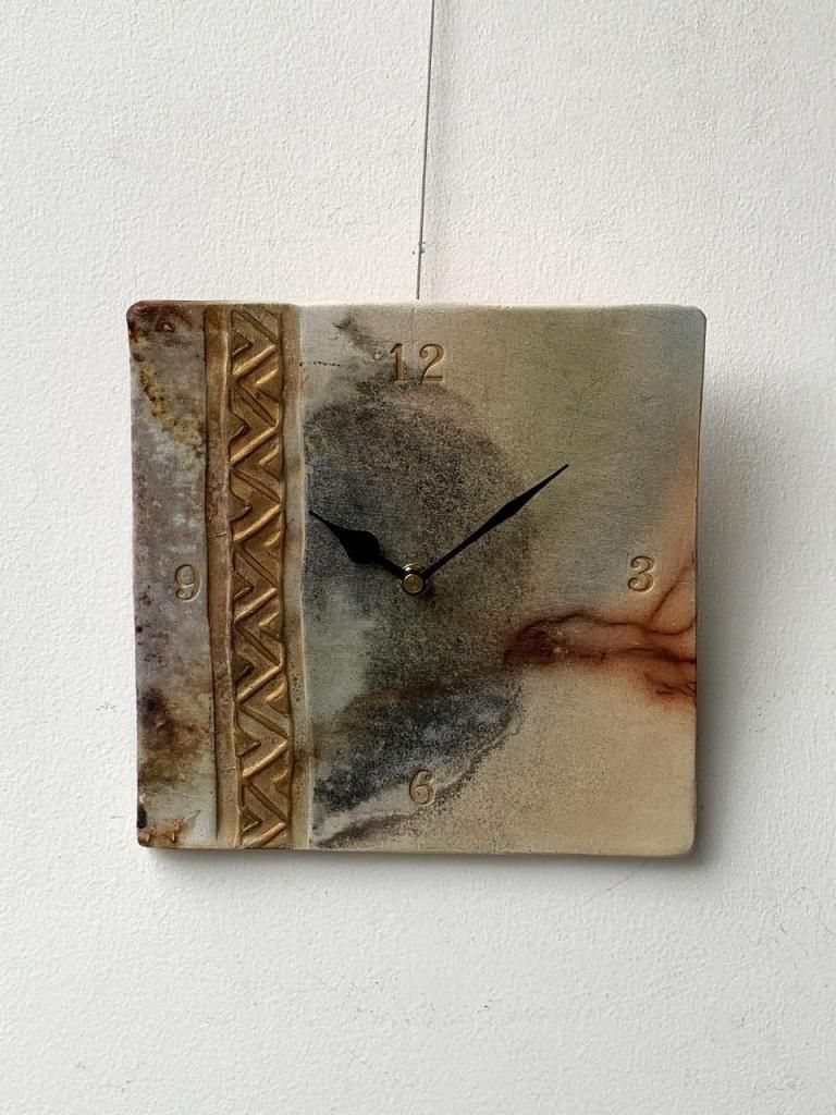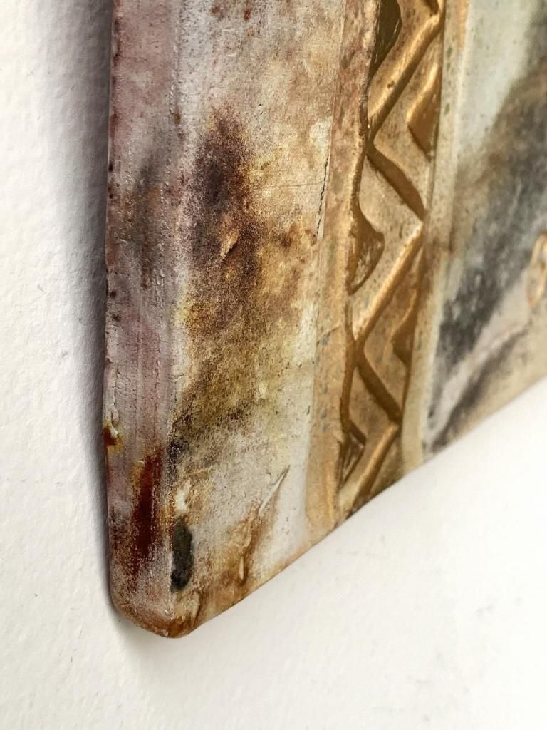 グレーやサンドベージュ、錆色が溶け合う独特の色調に、左側には幾何学模様のレリーフが施され、どこかプリミティブで静かな存在感を放ちます。