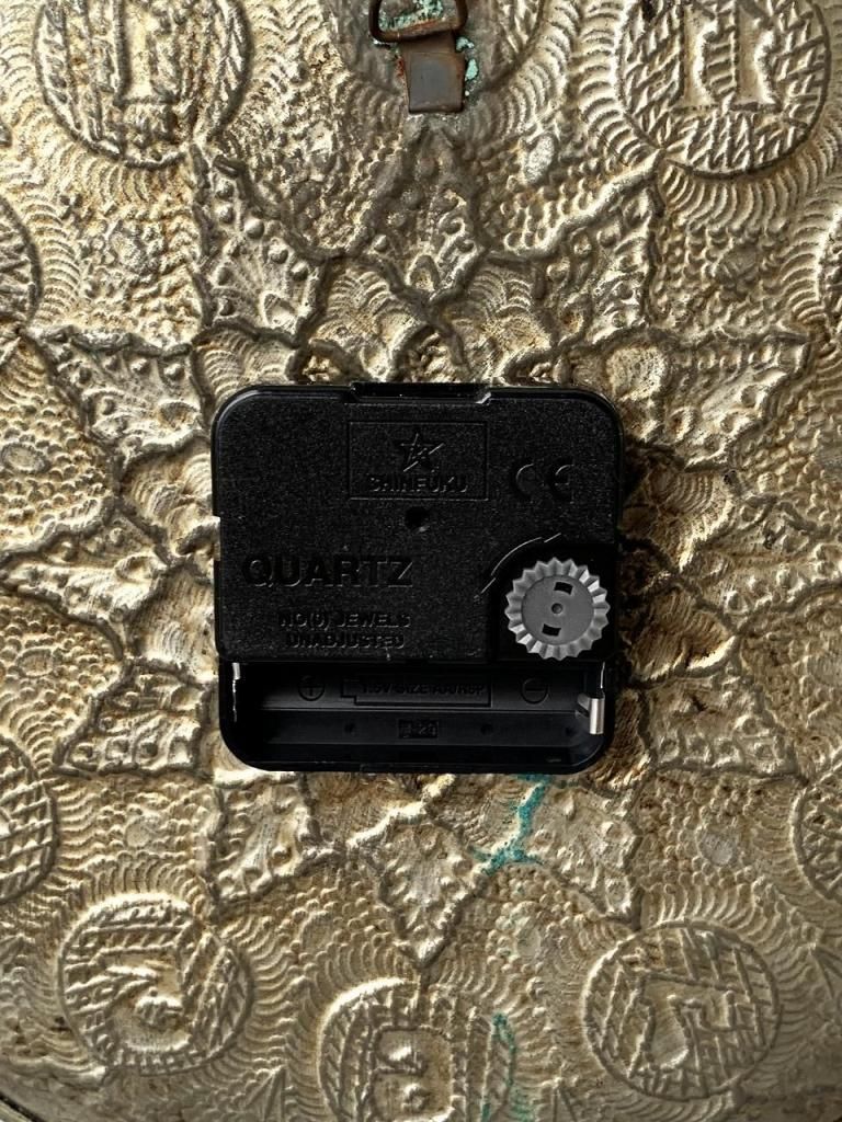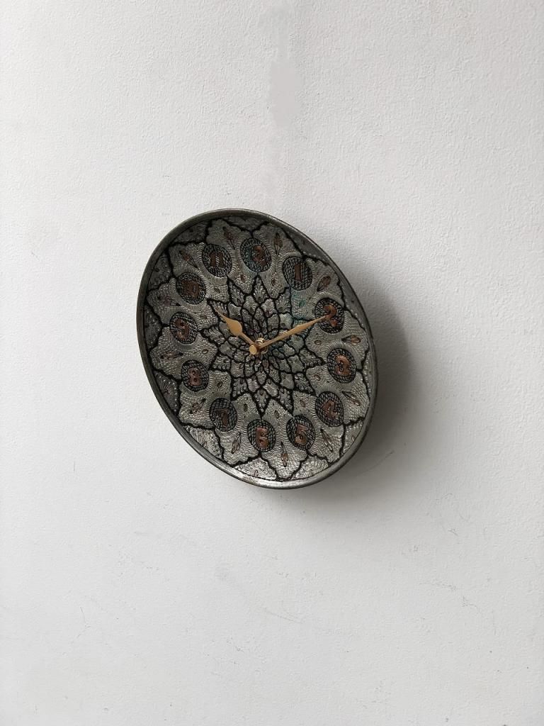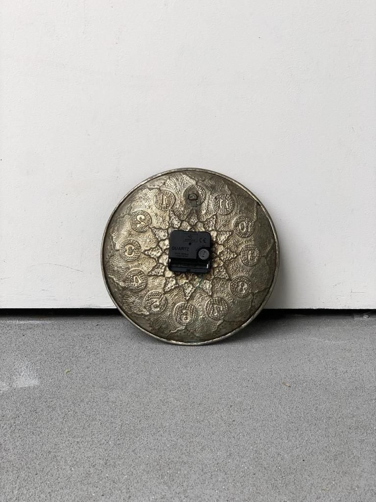 元は装飾用のメタルプレートだったものをベースに、時計としてリメイクした一点で、独特の存在感とハンドクラフトの趣きが感じられます。