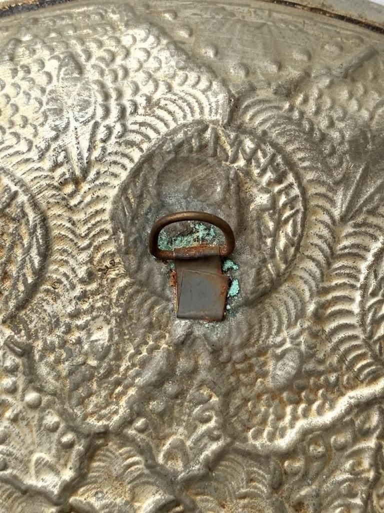 シルバーと銅色のコントラスト、ところどころに覗く緑青の風合いが、経年による味わいを引き立てています。