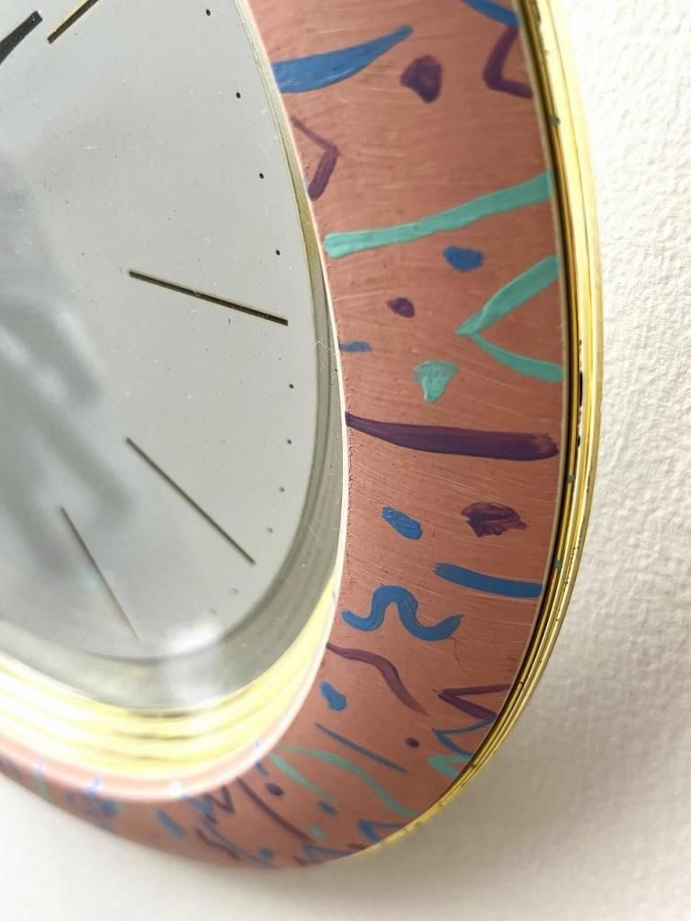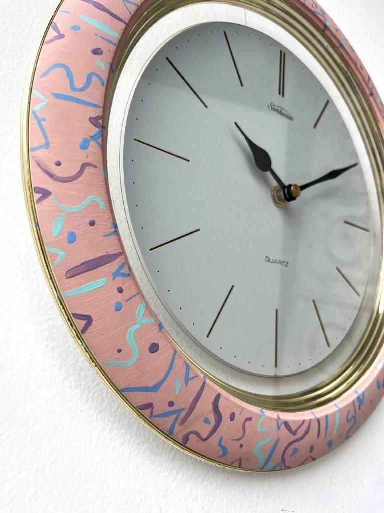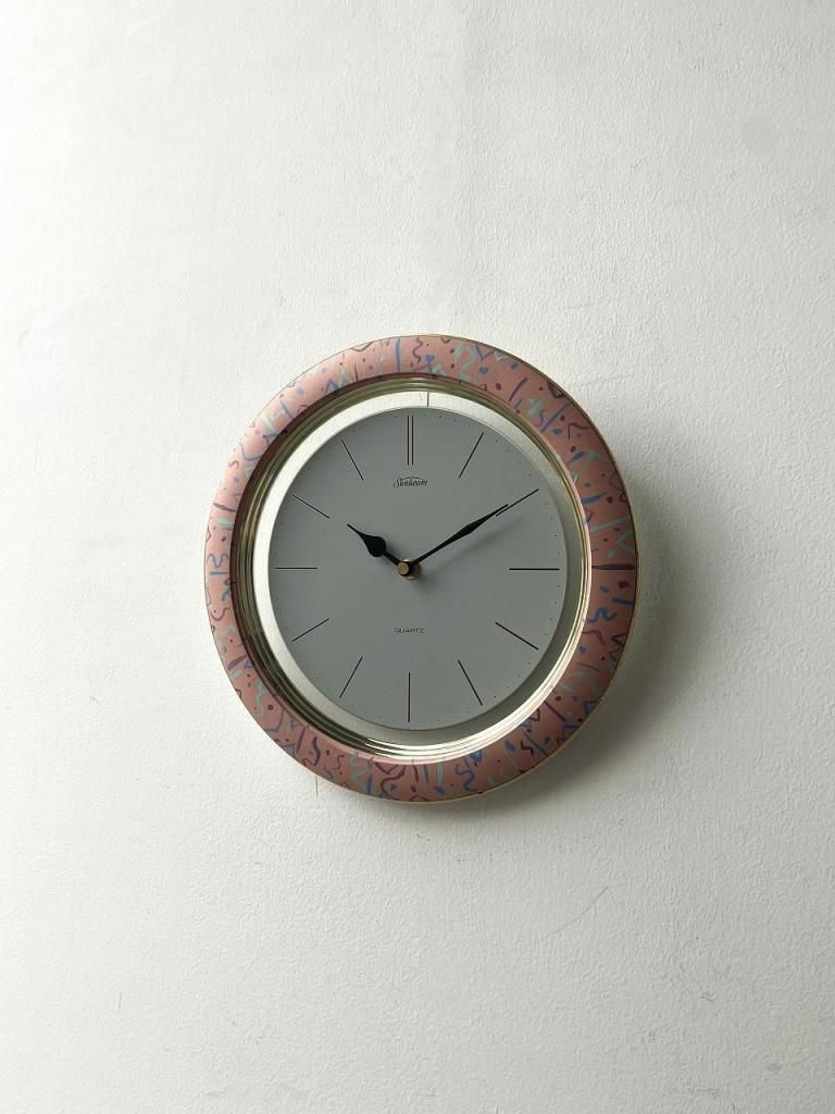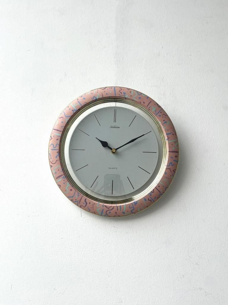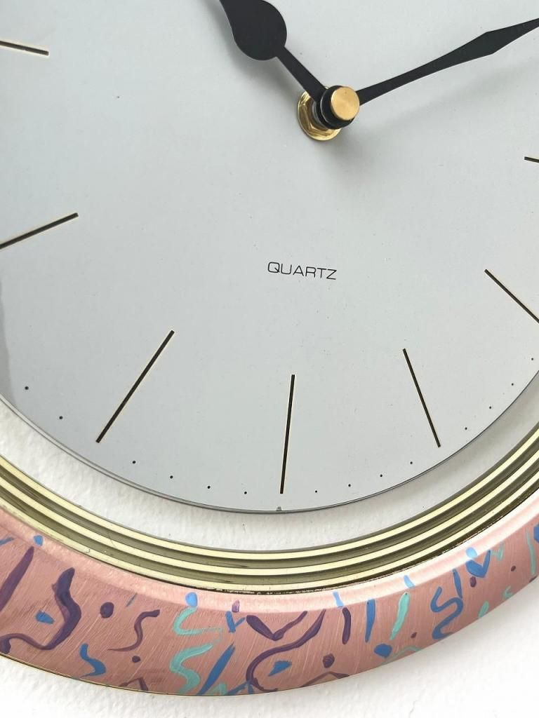 本品は、ミニマルな文字盤に対し、外周フレームにパステルピンクを基調としたポップなグラフィックがあしらわれたデザインです。