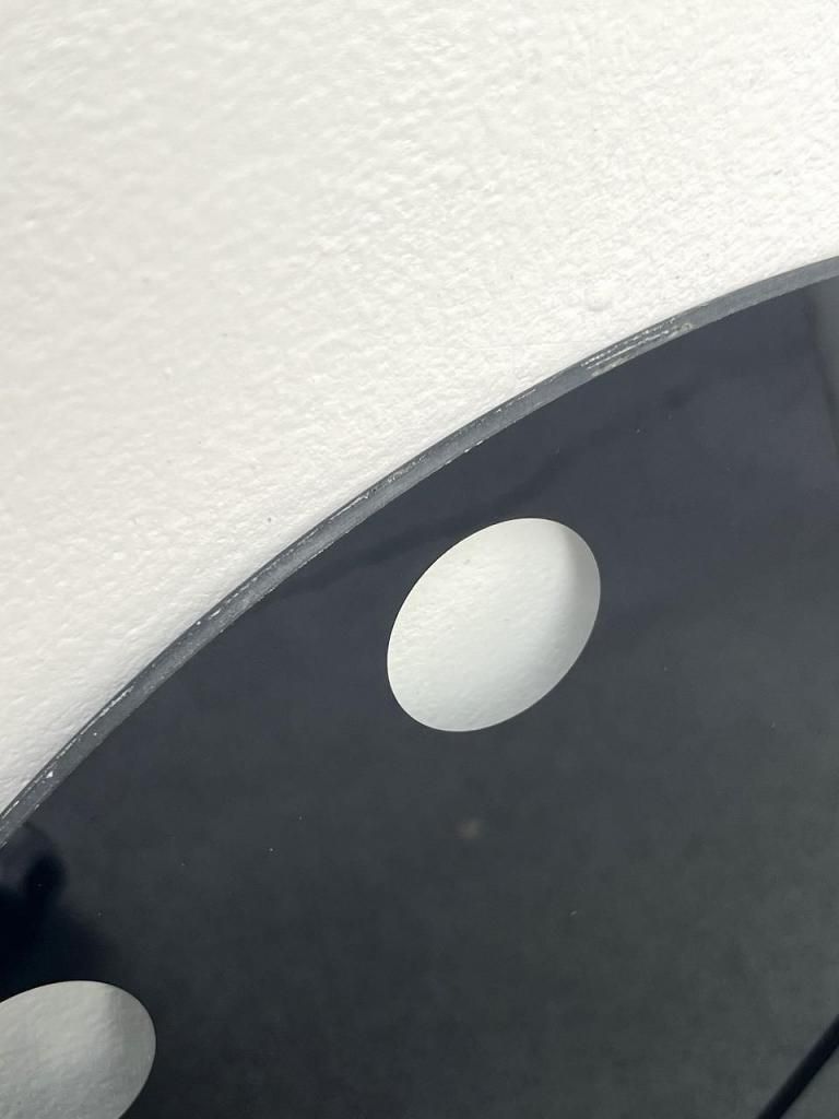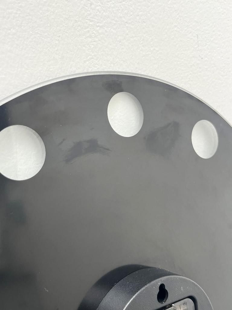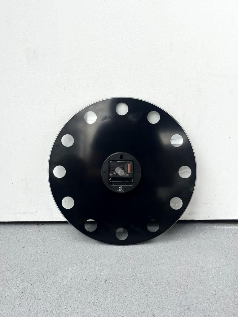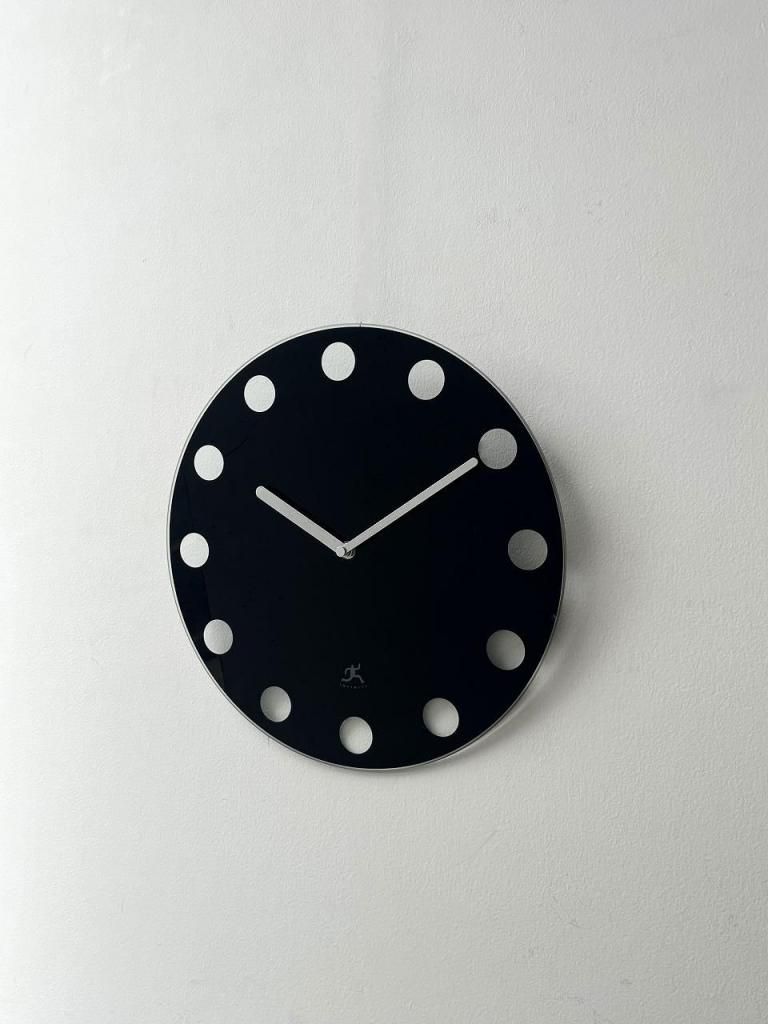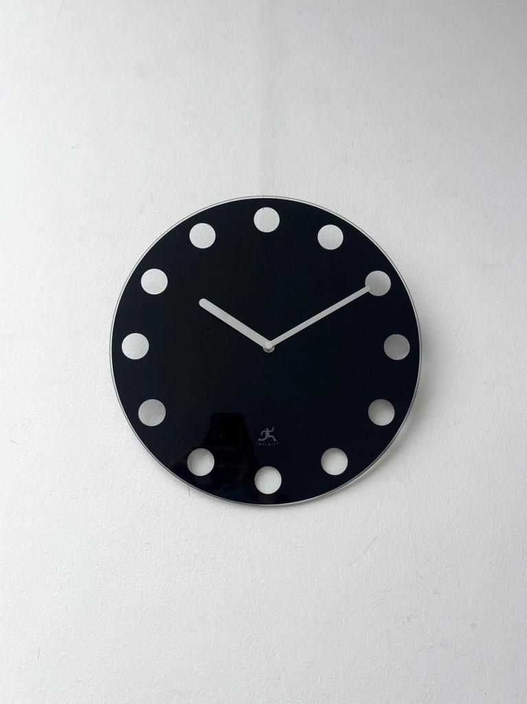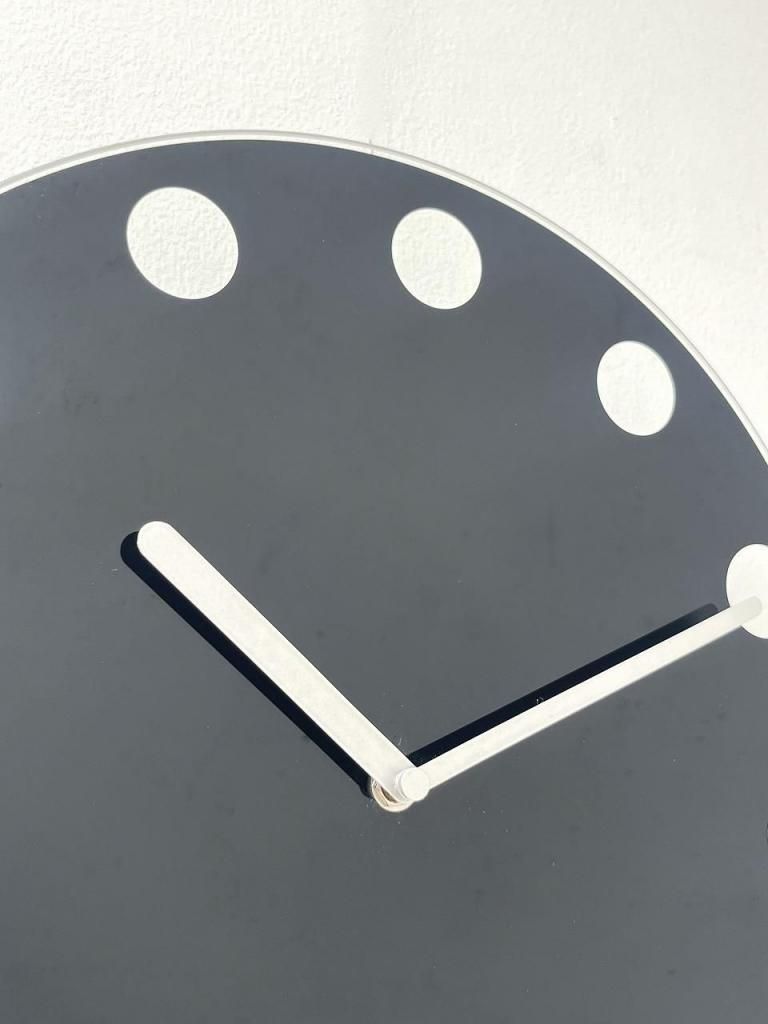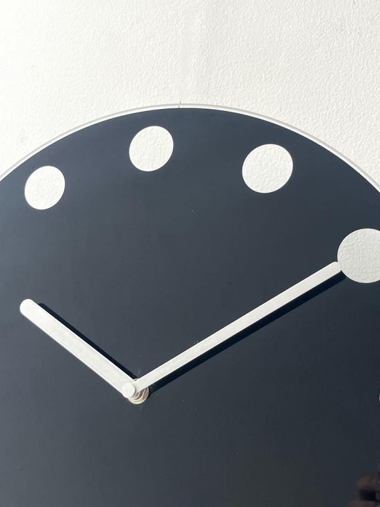 こちらはミニマルでモダンなモデルで、穴のように抜けた文字盤の表現は、視認性よりも造形バランスを優先し、モダンアートの領域に近いです。派手さや装飾を抑え、現代的で建築的な空間(オフィス・ギャラリー・ミニマル住宅)に向けた1台です。