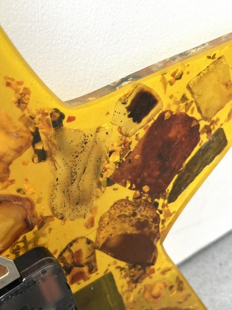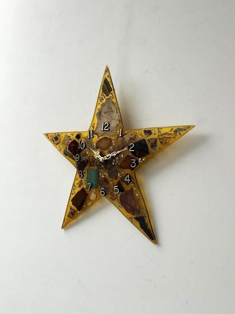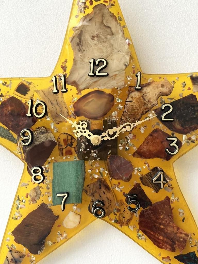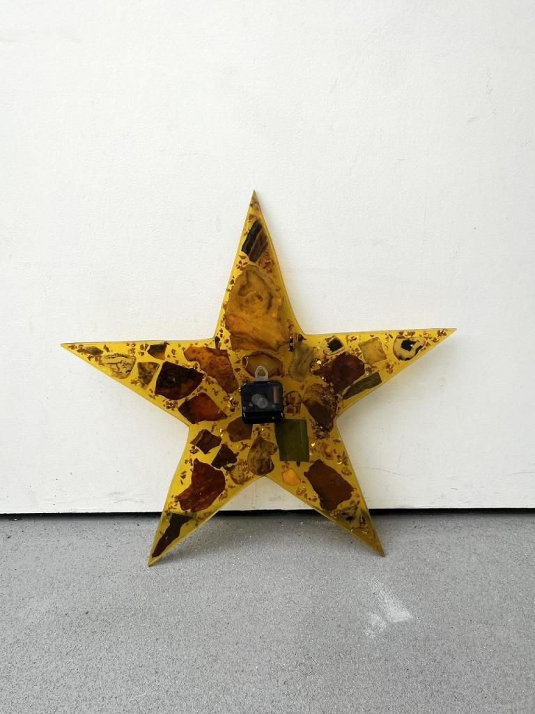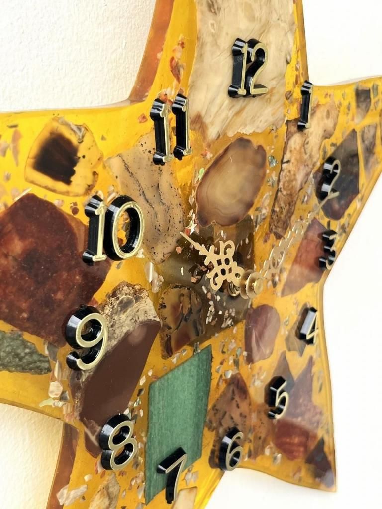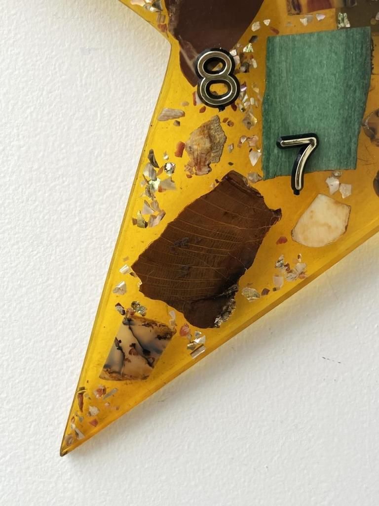星型のフォルムに琥珀色のレジン(樹脂)を流し込み、内部には天然石や木片、貝殻などを閉じ込めたデザインの一点。
