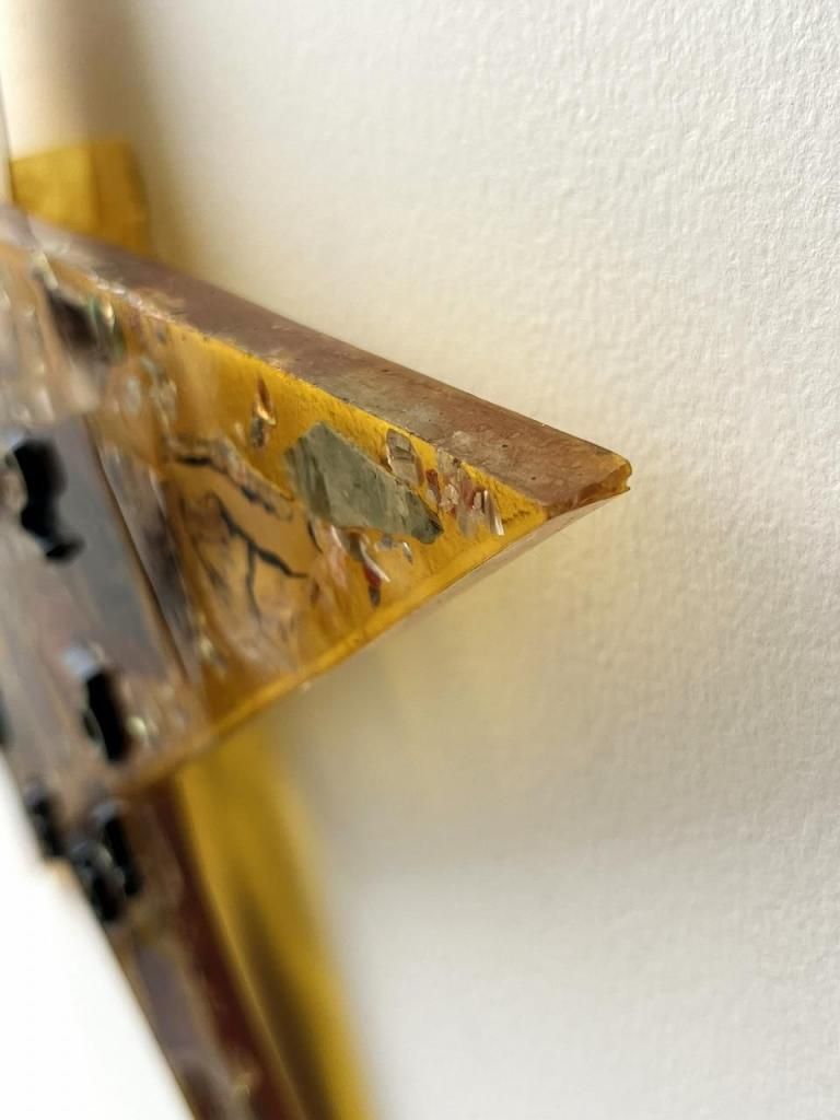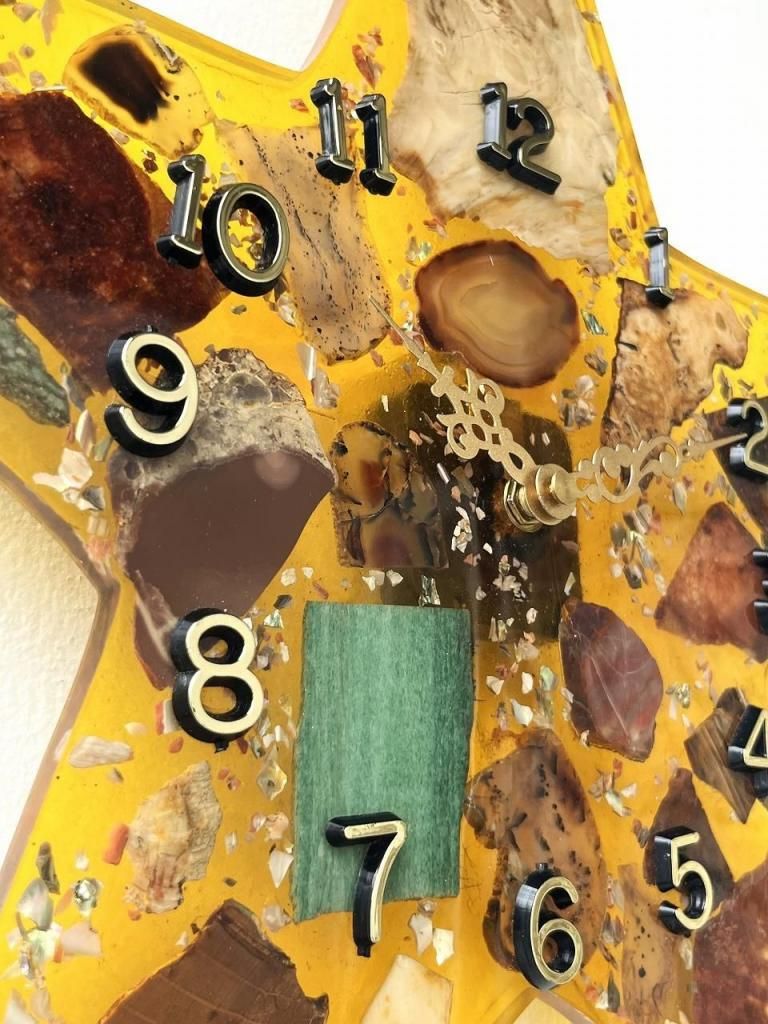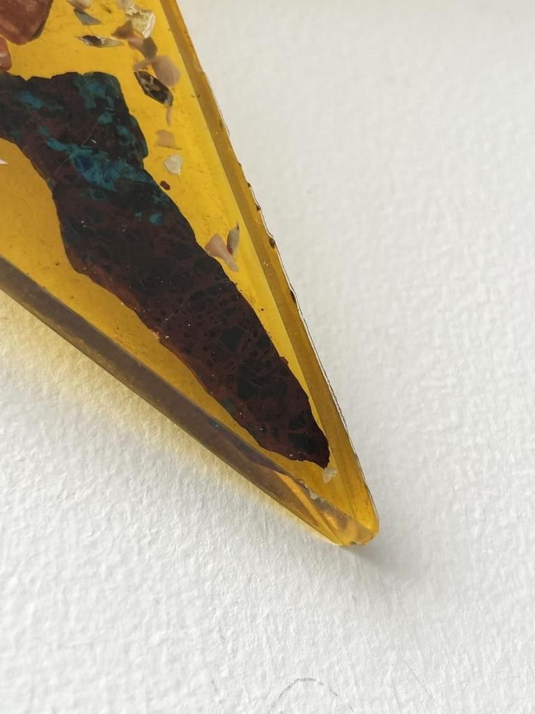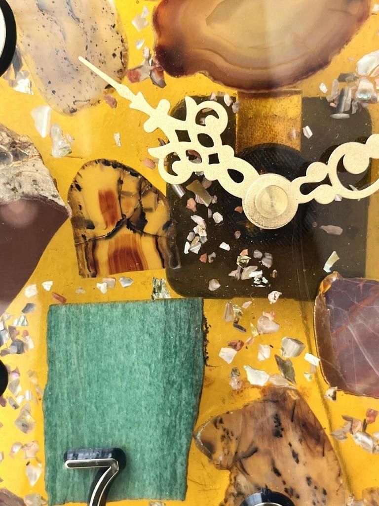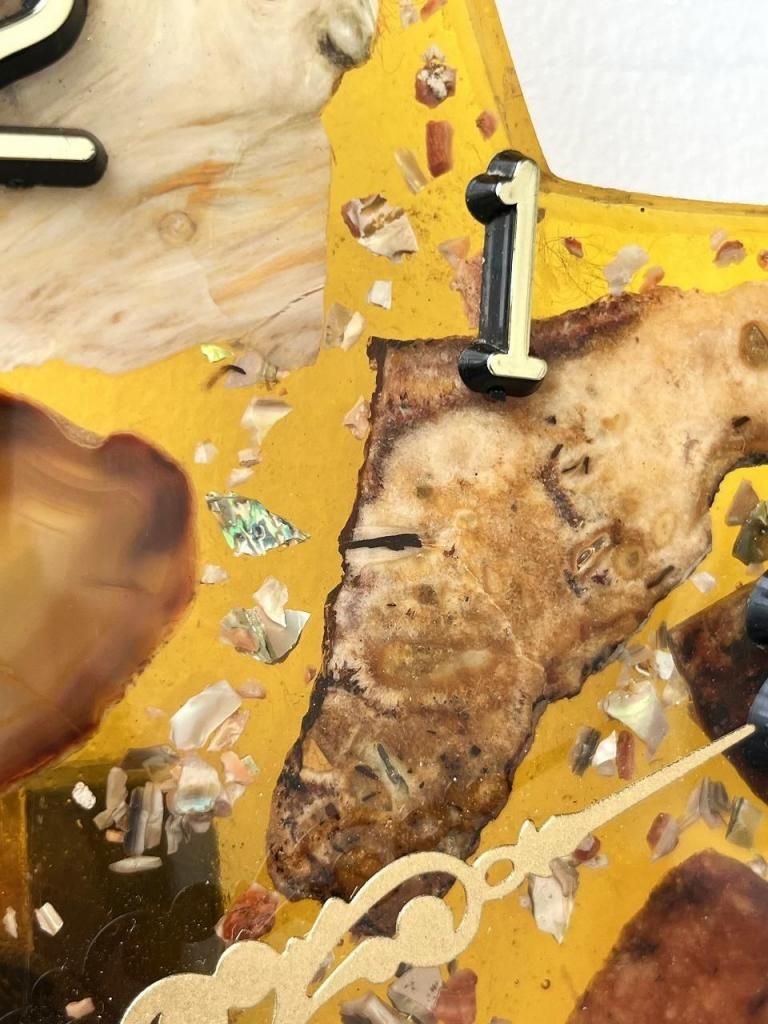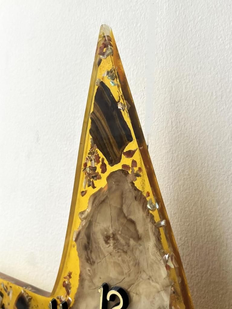 ミッドセンチュリー期に流行したレジンアートの技法が用いられており、当時は家具や照明の装飾にも多く取り入れられました。光を受けるとレジンの透明感と鉱物の奥行きが際立ち、インテリアに独特の温かみと幻想的な表情を与えます。