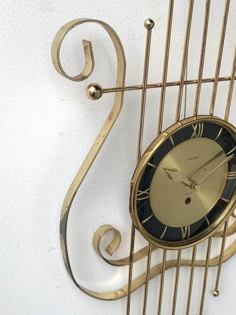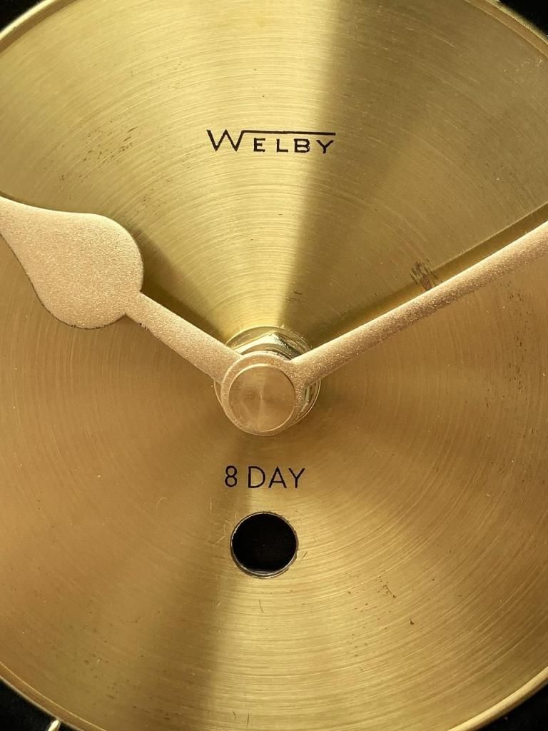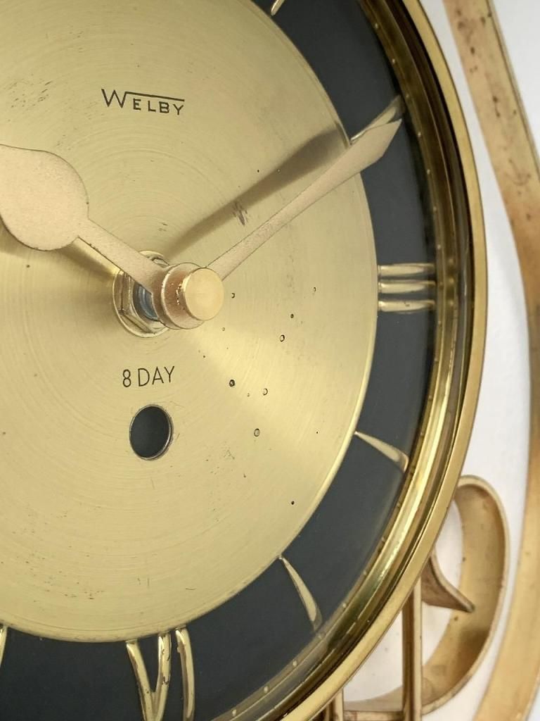 WELBY社は、イリノイ州を拠点とした老舗時計メーカー Westclox(ウェストクロックス)社 のブランドラインのひとつとして知られ、1950年代以降、家庭用クロックのデザイン性を重視した高級ラインを展開していました。当時のアメリカでは、単なる機能としての時計ではなく、インテリアの一部としての壁掛け時計が重視されており、WELBYはモダンデザインからオーナメンタルな装飾スタイルまで幅広く手掛け、その洗練された造形と素材使いで人気を博しました。
