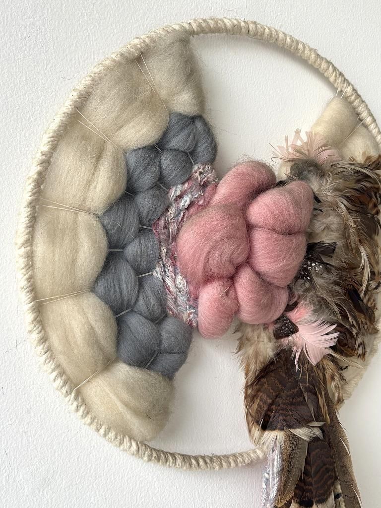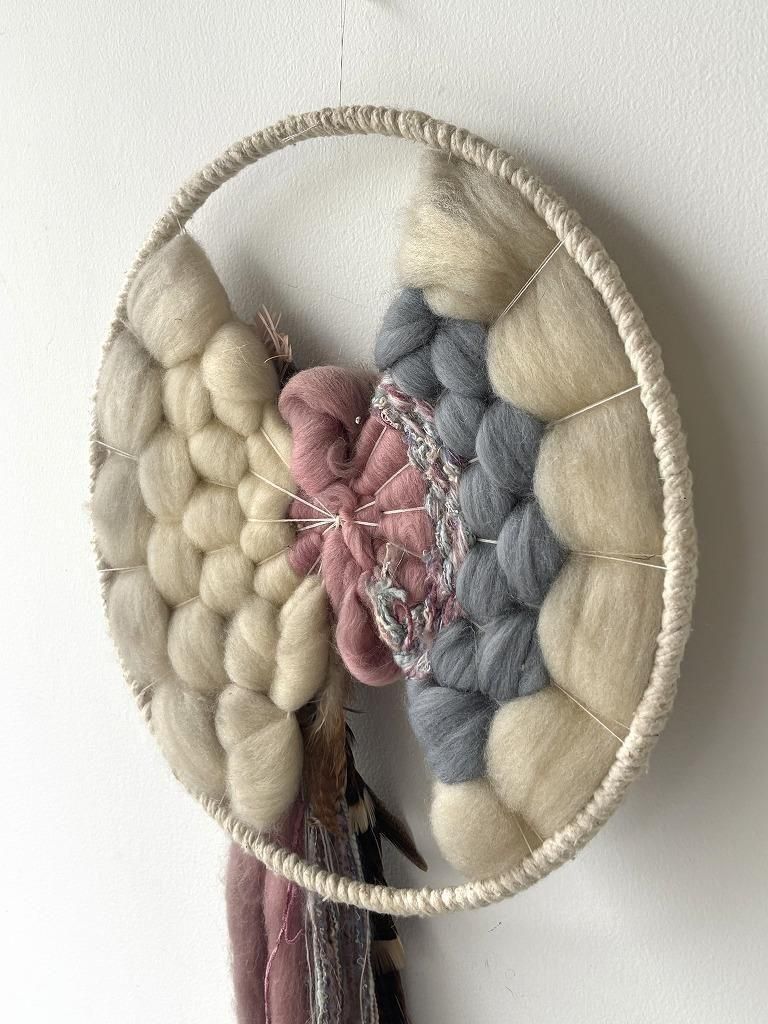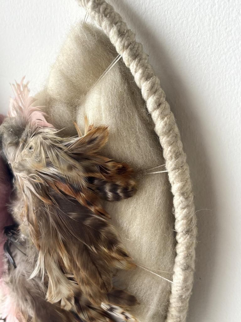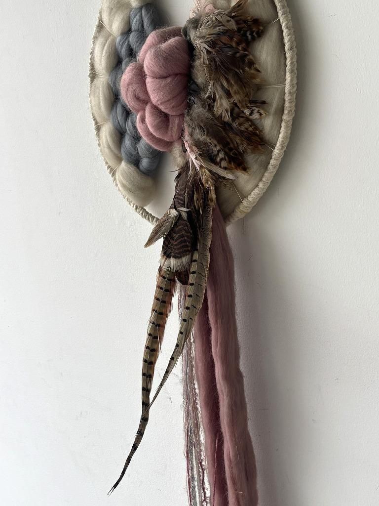 立体的で奥行きがあることで存在感が生まれ、円形フレーム・羊毛・羽根・長く垂れたファイバーなど素材感を存分に楽しめる一品です。