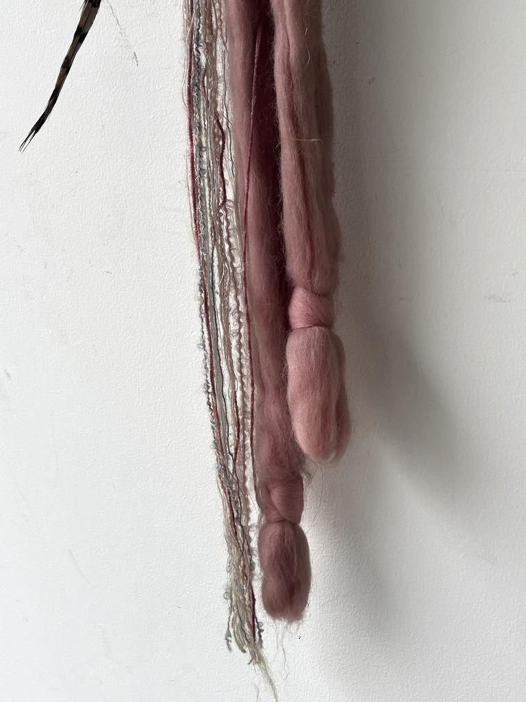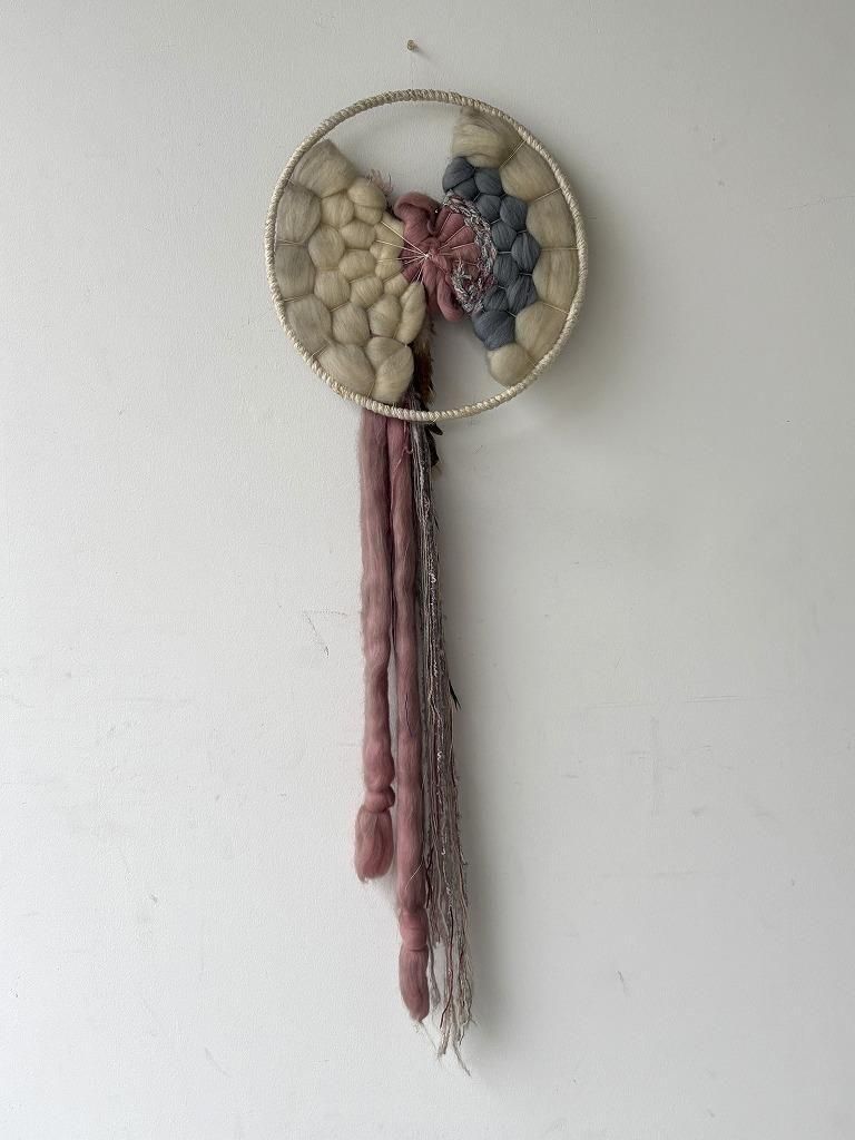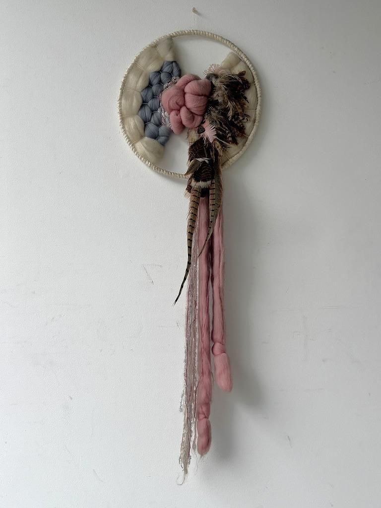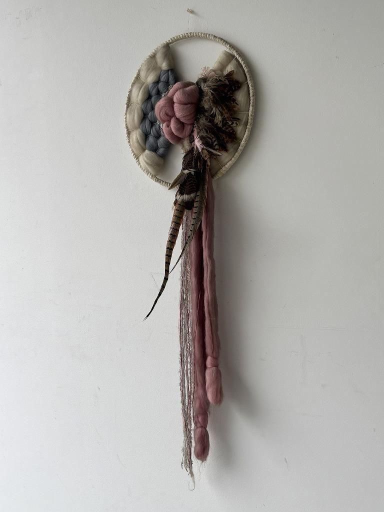 立体的で奥行きがあることで存在感が生まれ、円形フレーム・羊毛・羽根・長く垂れたファイバーなど素材感を存分に楽しめる一品です。