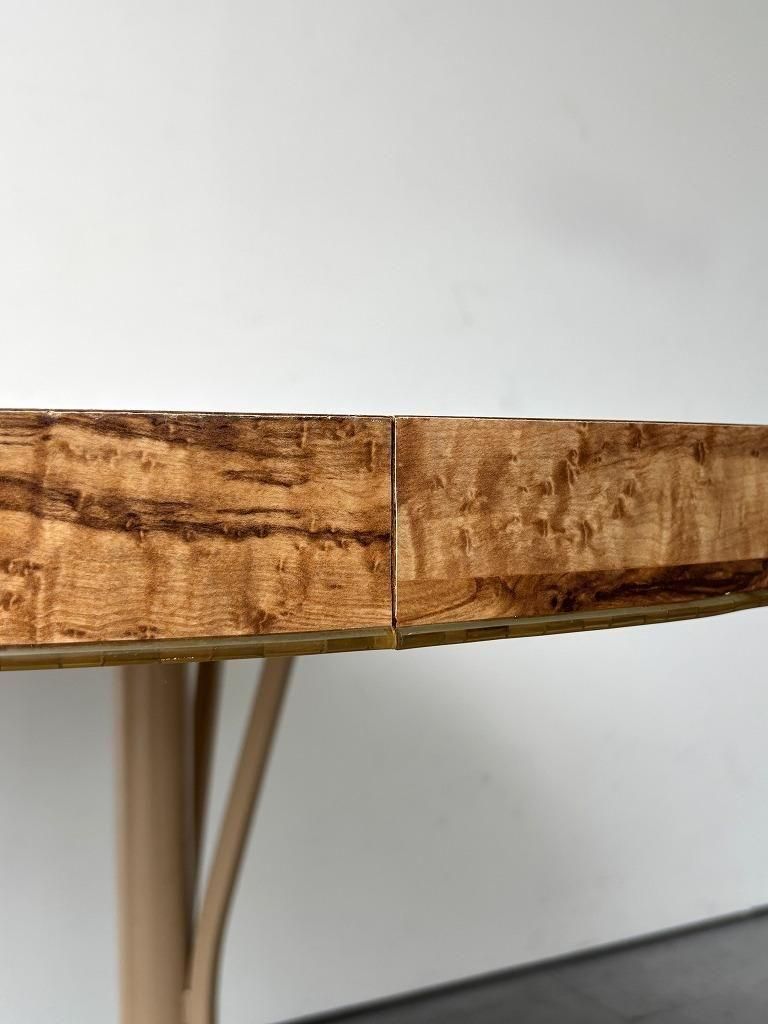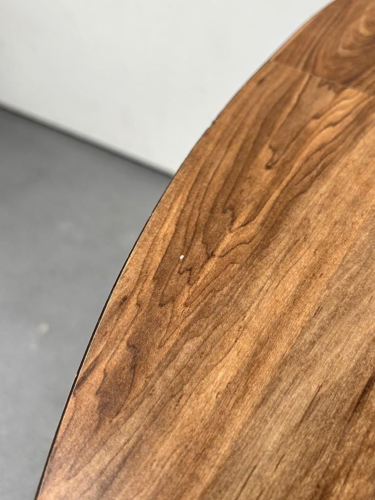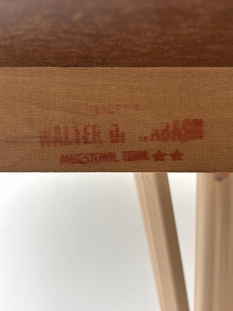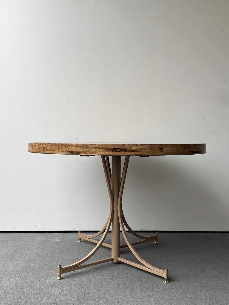 シンプルで合理的、余計な装飾がないミッドセンチュリー・モダンなデザイン。2本支柱から脚が放射状に伸び、アジャスター付きの4点で安定性を確保。当時のオフィス家具・会議用テーブルに多く採用された脚部のデザインですが、木目調天板とメタルレッグの組み合わせをすることで家庭的な雰囲気となり、当時のホームユース向けに制作されたことが伺えます。