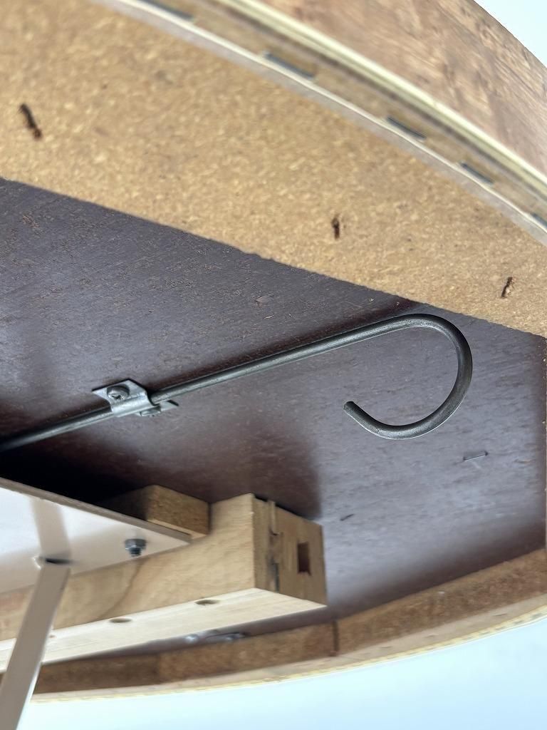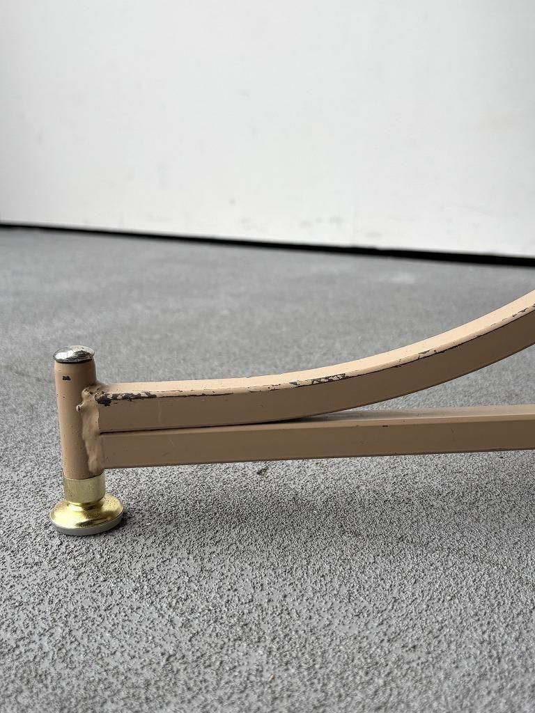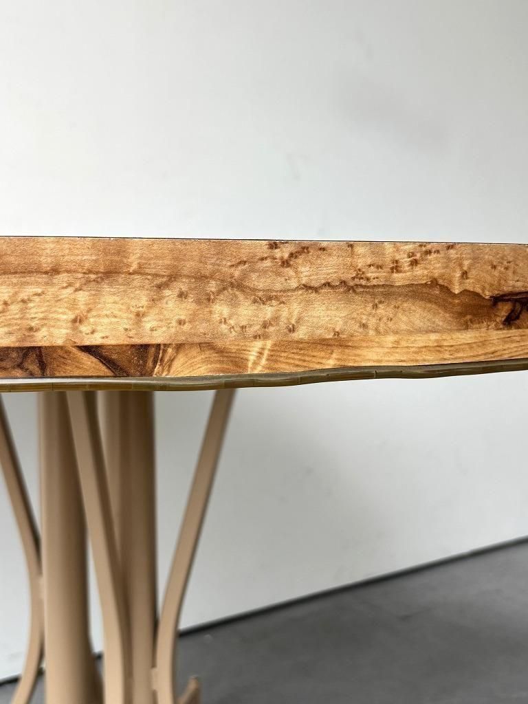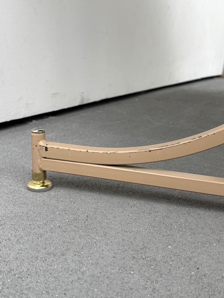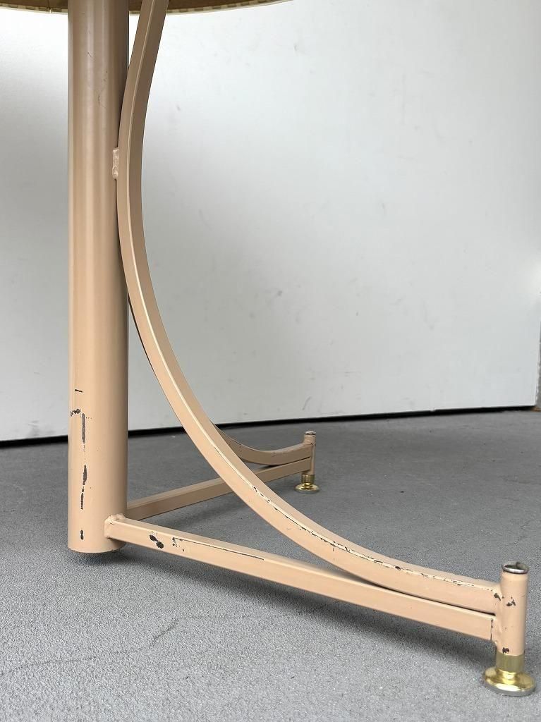 シンプルで合理的、余計な装飾がないミッドセンチュリー・モダンなデザイン。2本支柱から脚が放射状に伸び、アジャスター付きの4点で安定性を確保。当時のオフィス家具・会議用テーブルに多く採用された脚部のデザインですが、木目調天板とメタルレッグの組み合わせをすることで家庭的な雰囲気となり、当時のホームユース向けに制作されたことが伺えます。