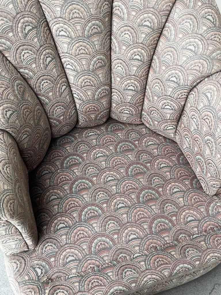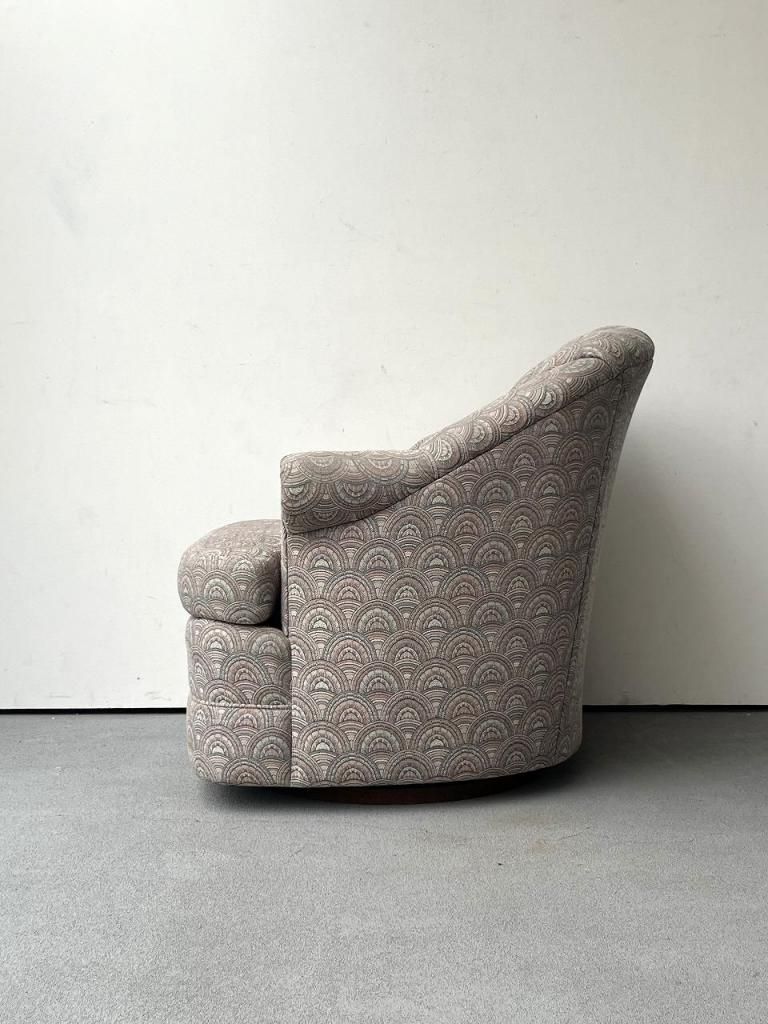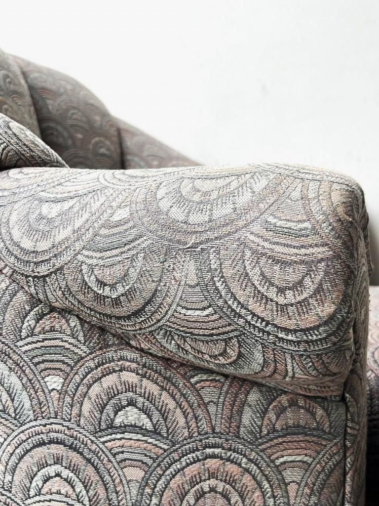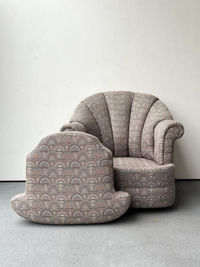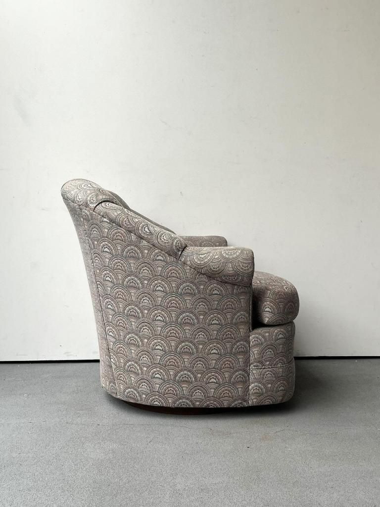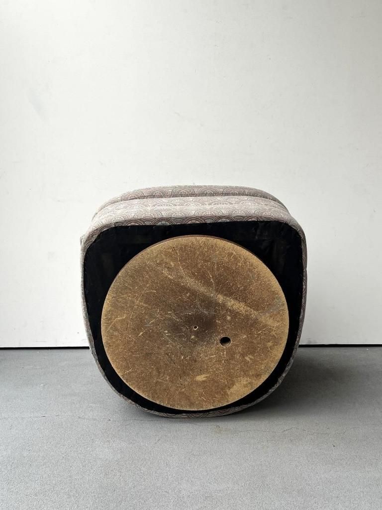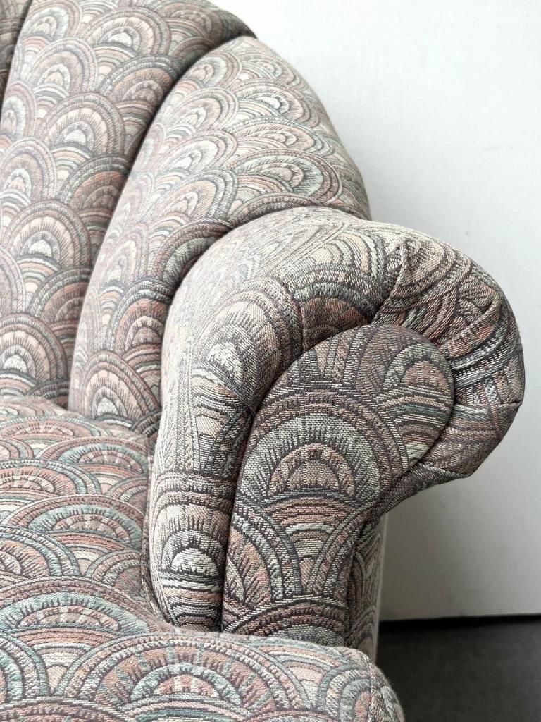 全体を覆う生地は、淡いトーンの幾何学模様が織り込まれた上質なファブリックを使用し、アール・デコを思わせる半円のパターンが印象的で、空間に程よい華やかさと上品さを添えます。