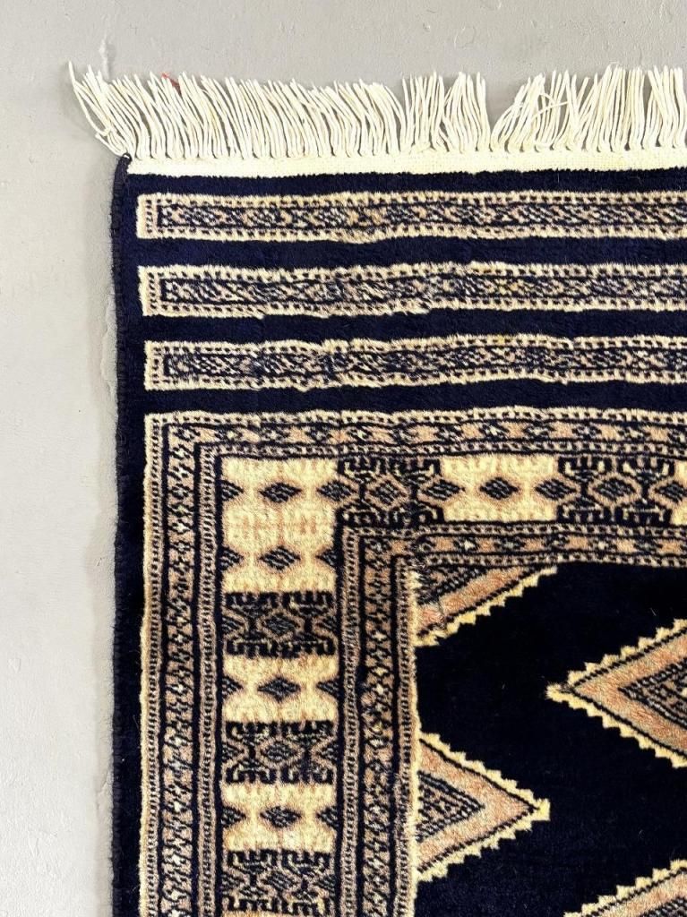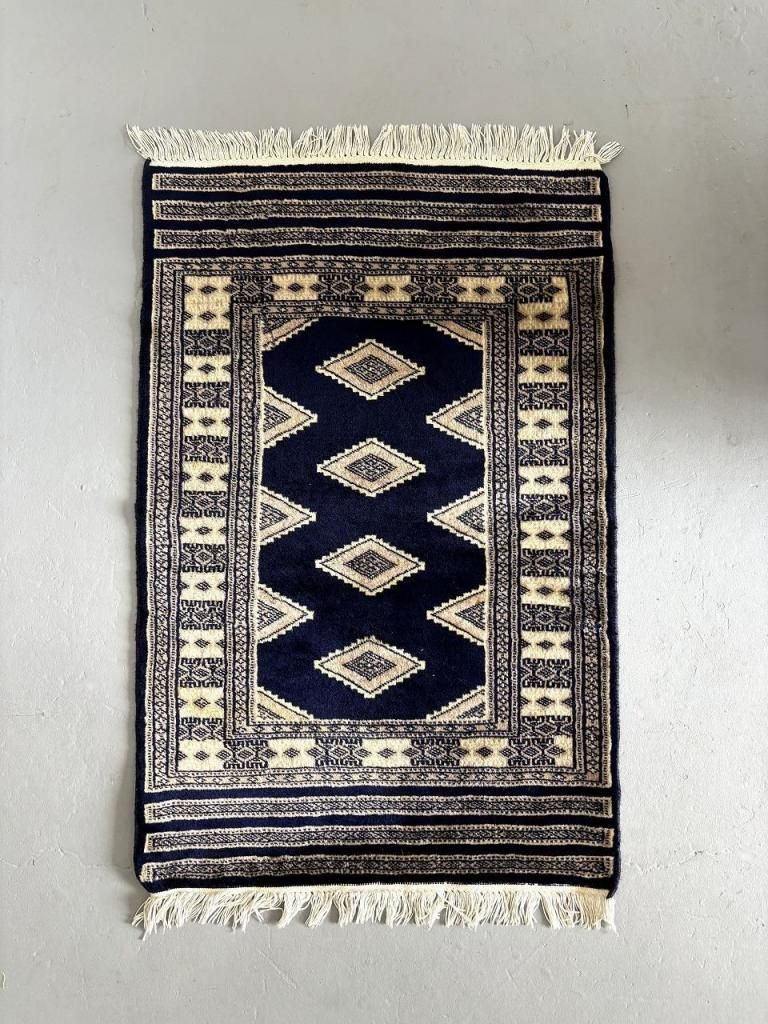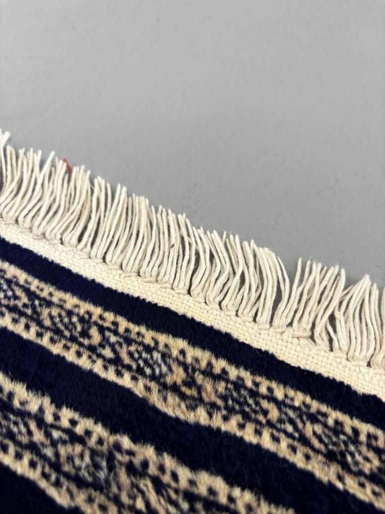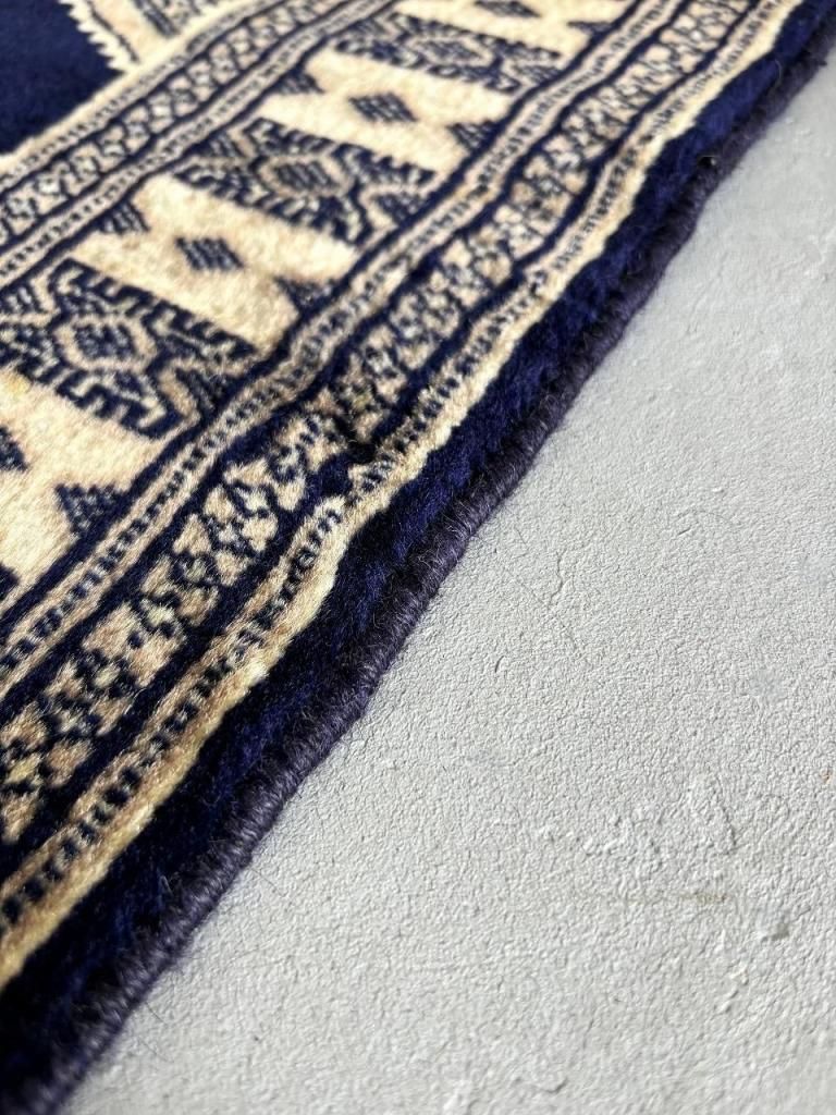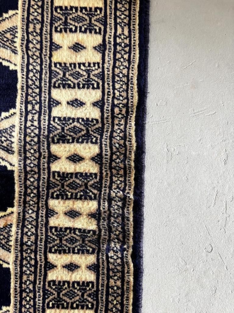 ハンドノット(手結び)により一枚一枚つくられており、深いネイビーが基調となっており、全体に落ち着いた印象で、上品さや静けさを持った1枚。