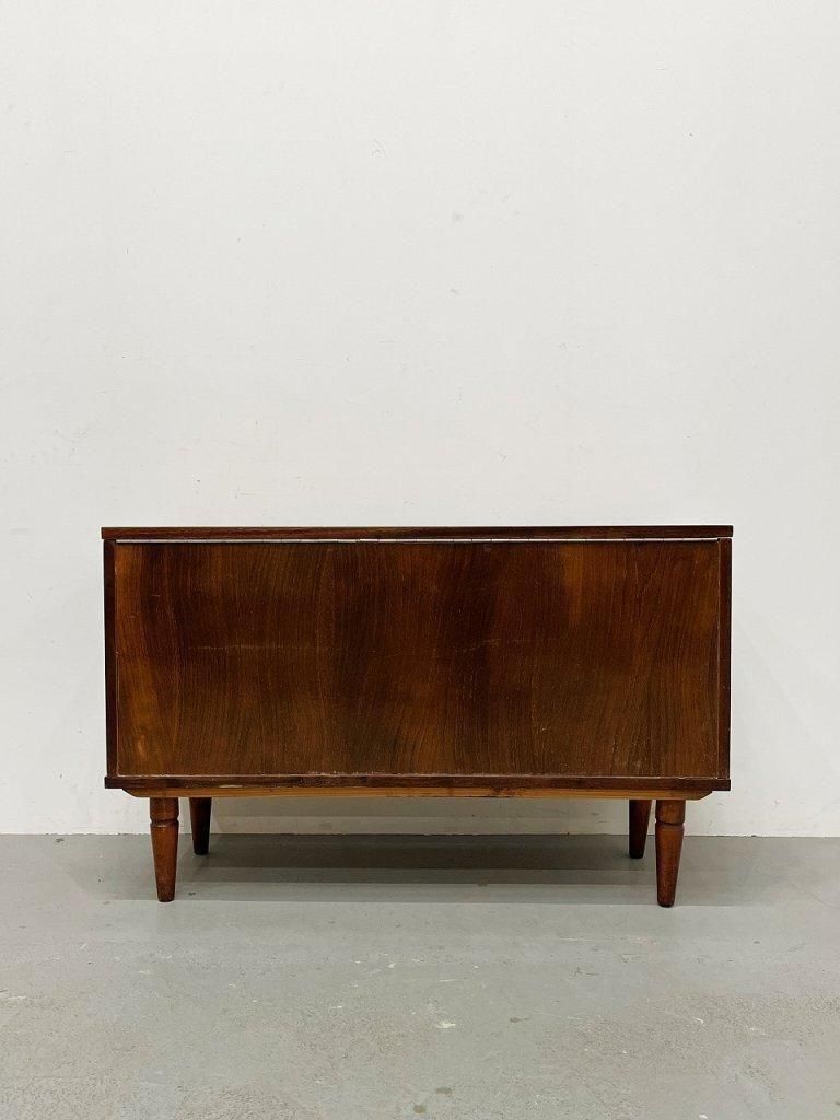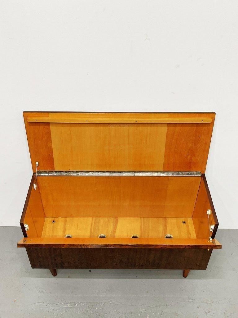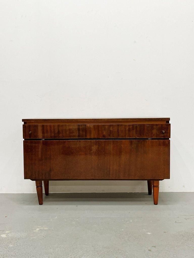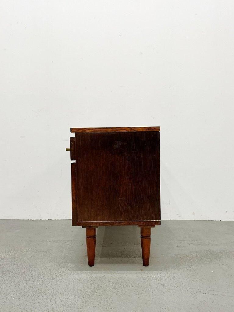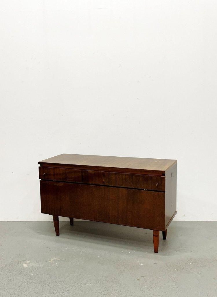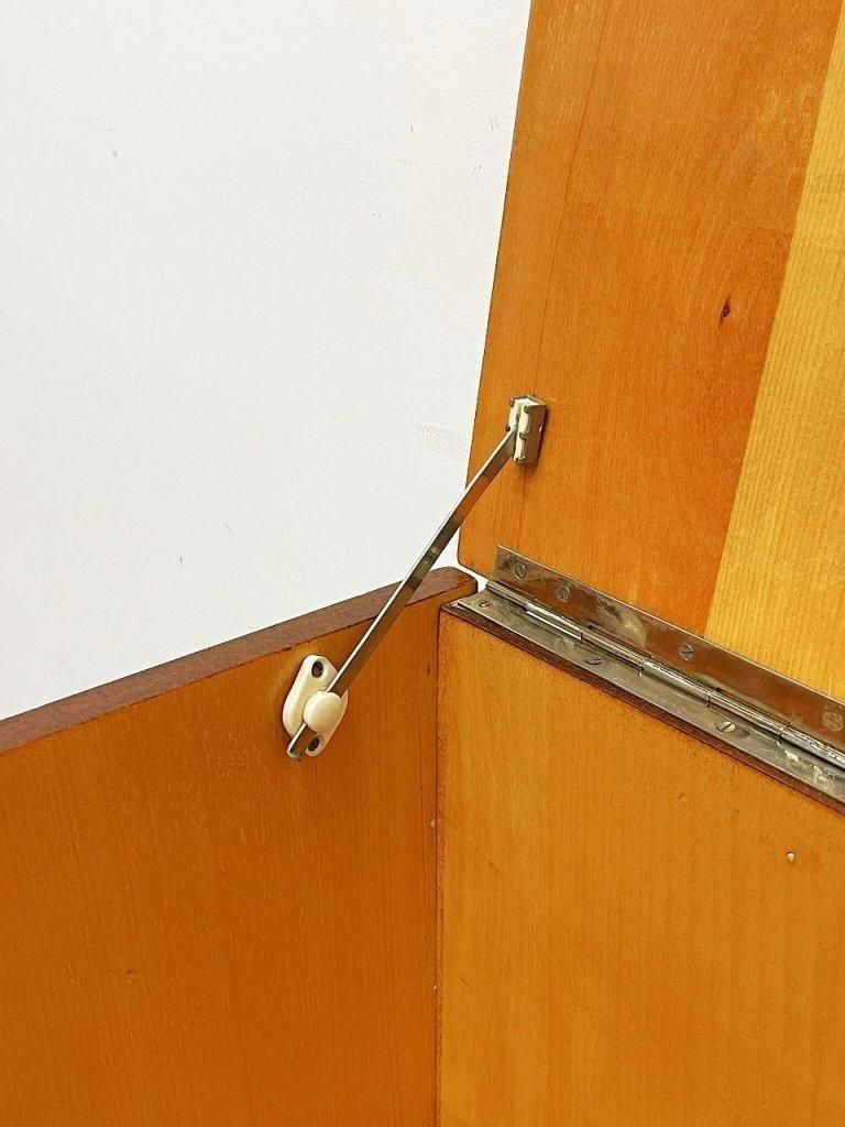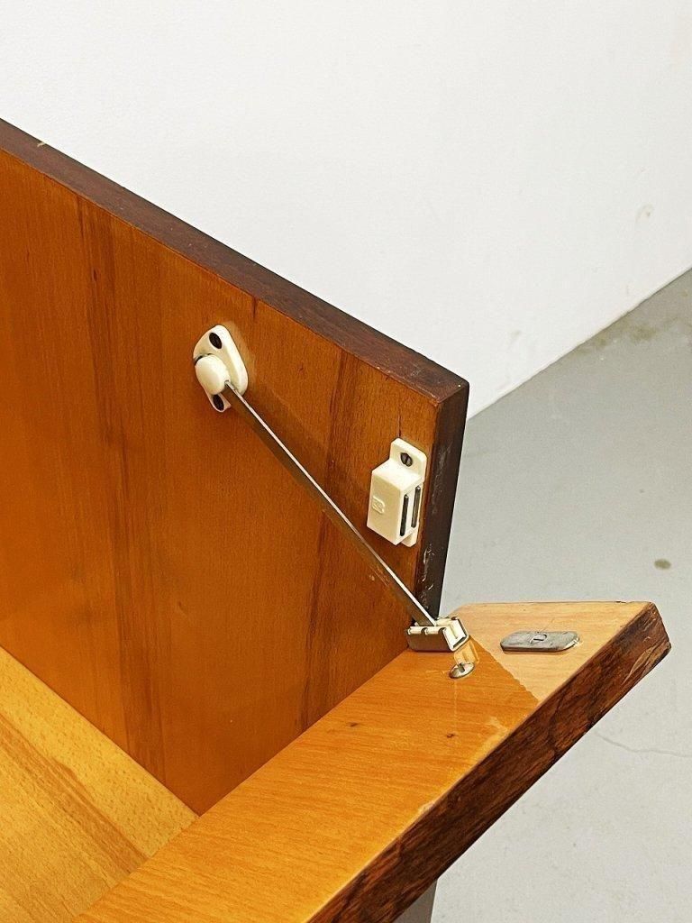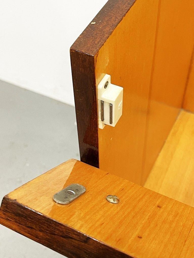 外装には深みのあるブラウンのウッドが使用され、内側には明るい木目の無垢材を組み合わせた構造。直線的で装飾を抑えたフォルムと、丸脚の軽やかな脚部が特徴で、同時期のチェコミッドセンチュリー家具らしいデザインです。