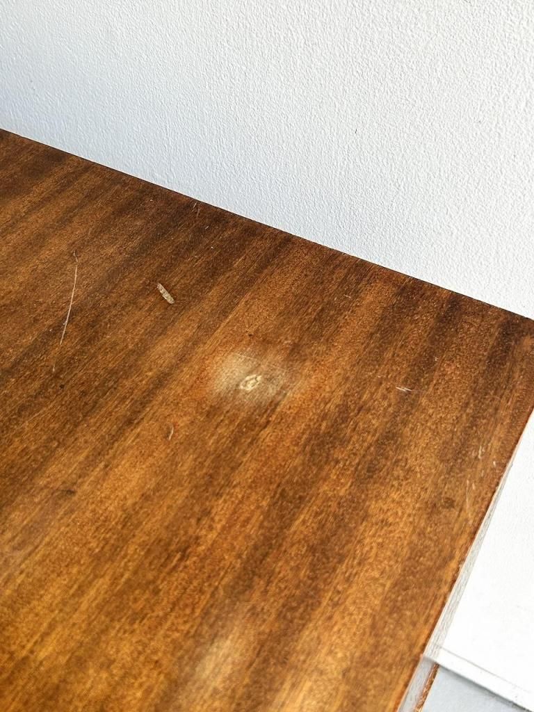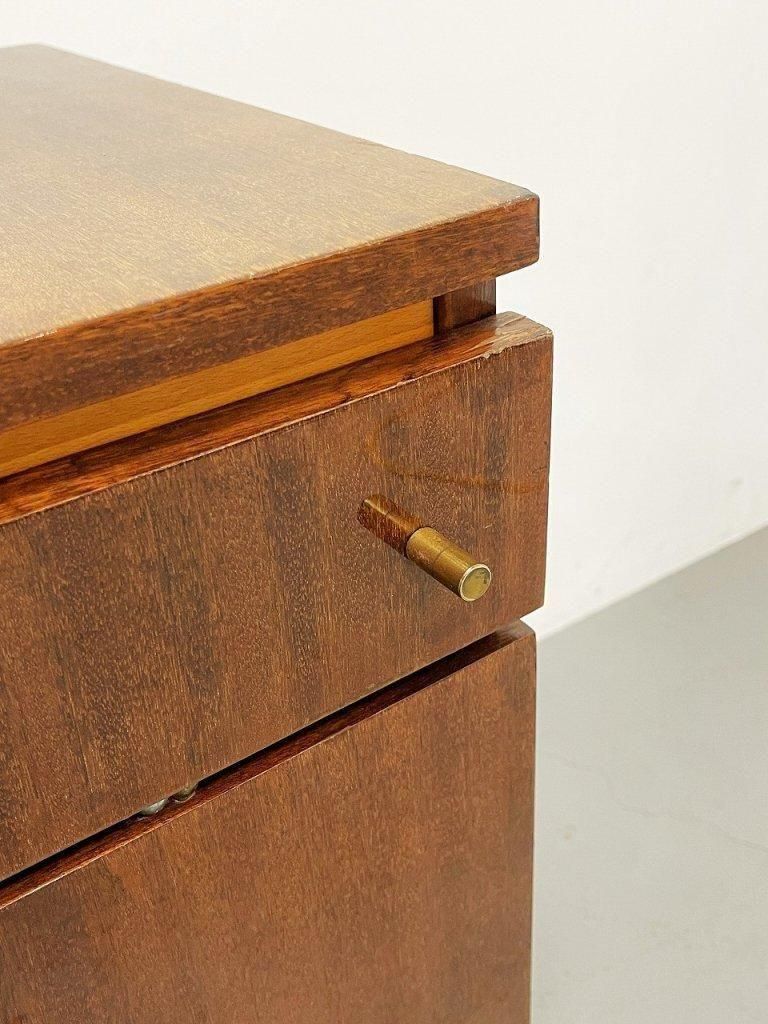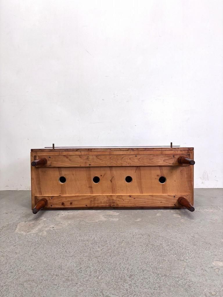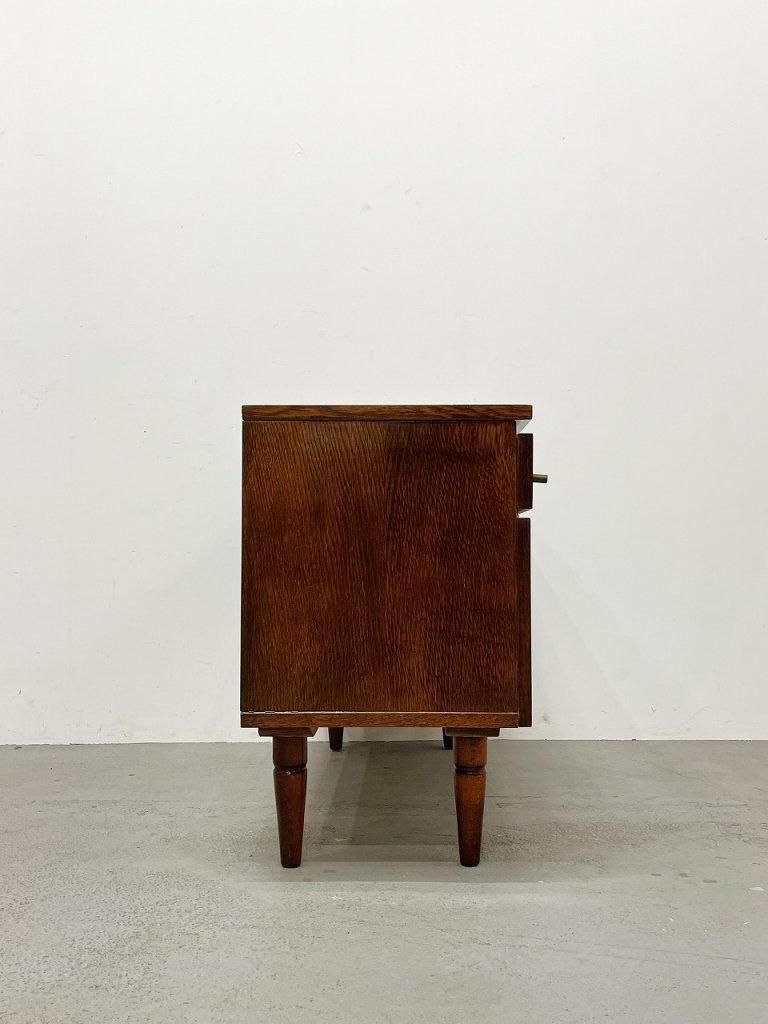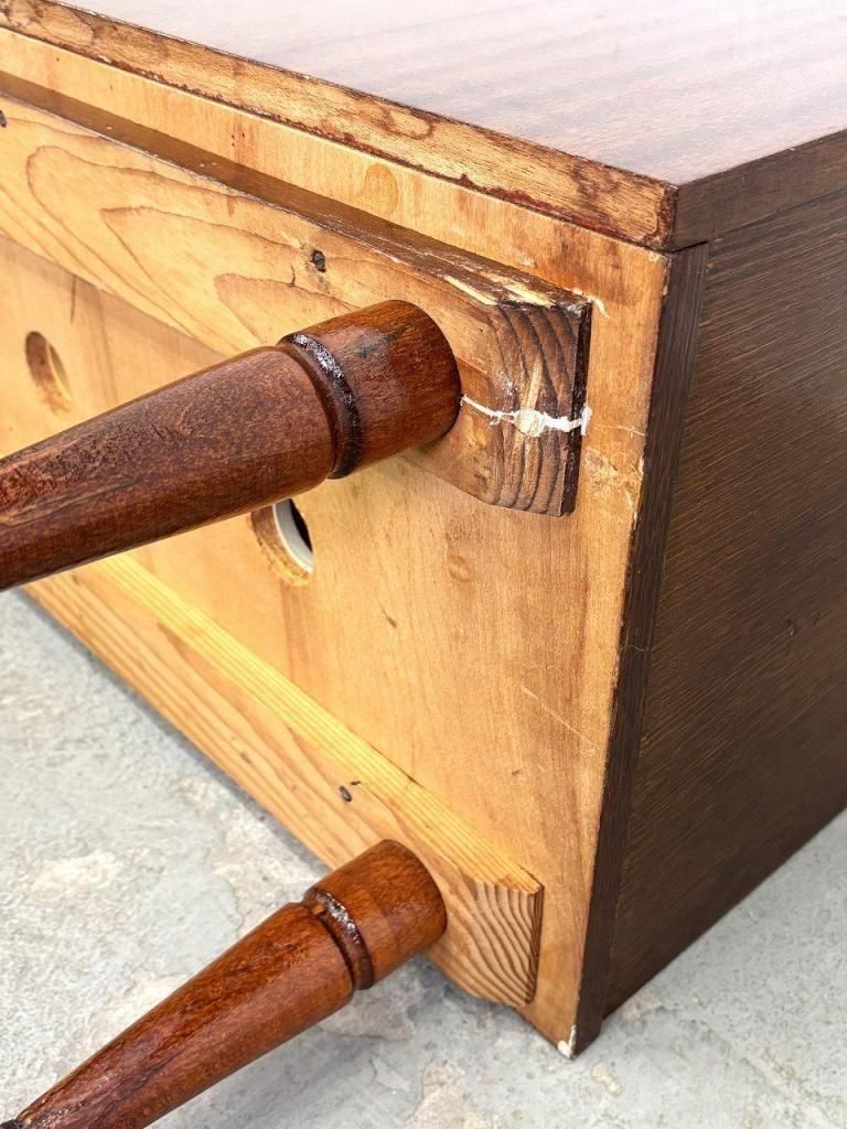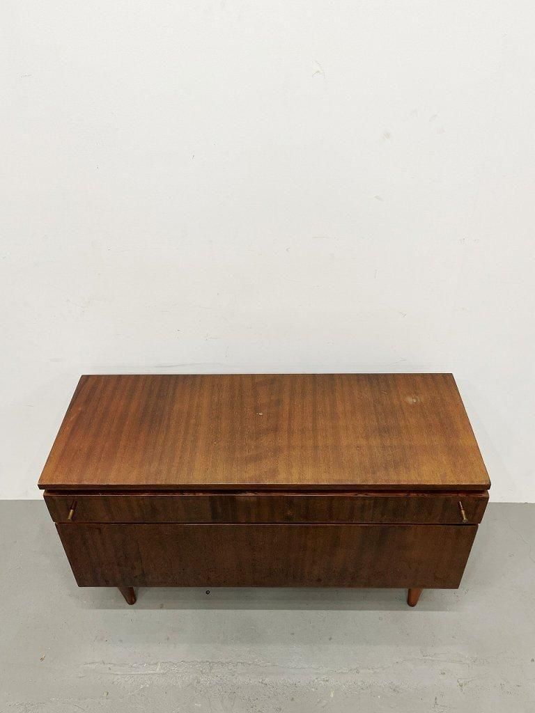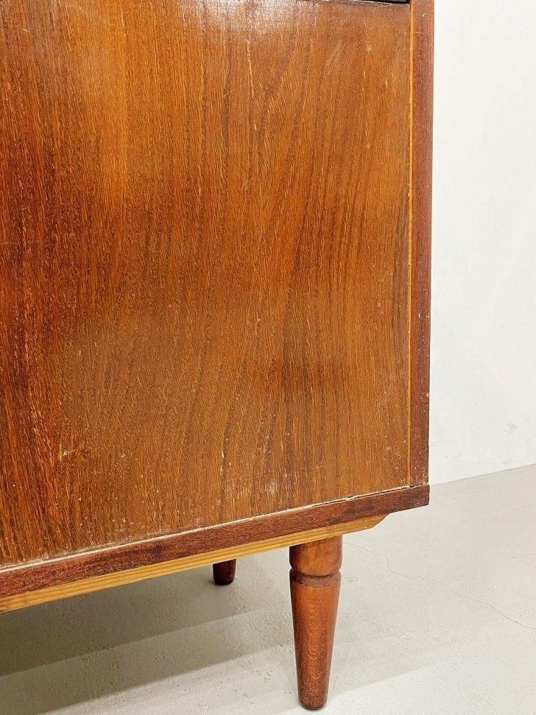 外装には深みのあるブラウンのウッドが使用され、内側には明るい木目の無垢材を組み合わせた構造。直線的で装飾を抑えたフォルムと、丸脚の軽やかな脚部が特徴で、同時期のチェコミッドセンチュリー家具らしいデザインです。
