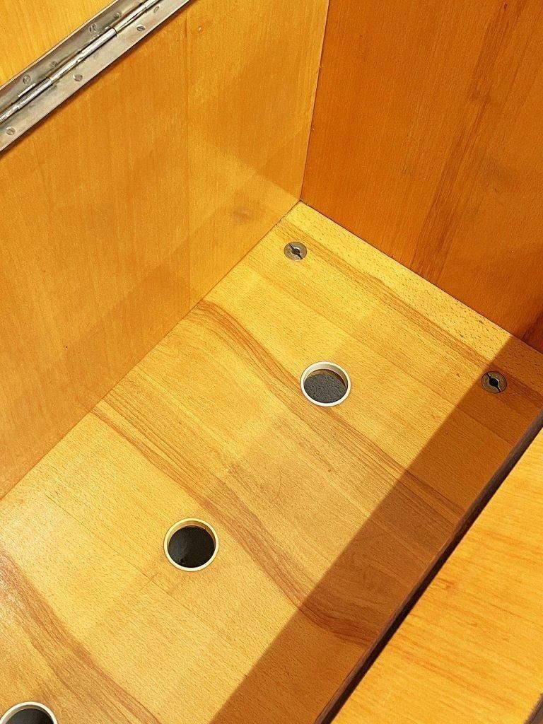 内部は通気性を考慮した穴付きの設計となっており、収納部の切り替えられた木目が美しく、シーズンオフの洋服や大きめの雑貨、毛布やリネン類など幅広いアイテムの収納にもお勧めの一台です。
