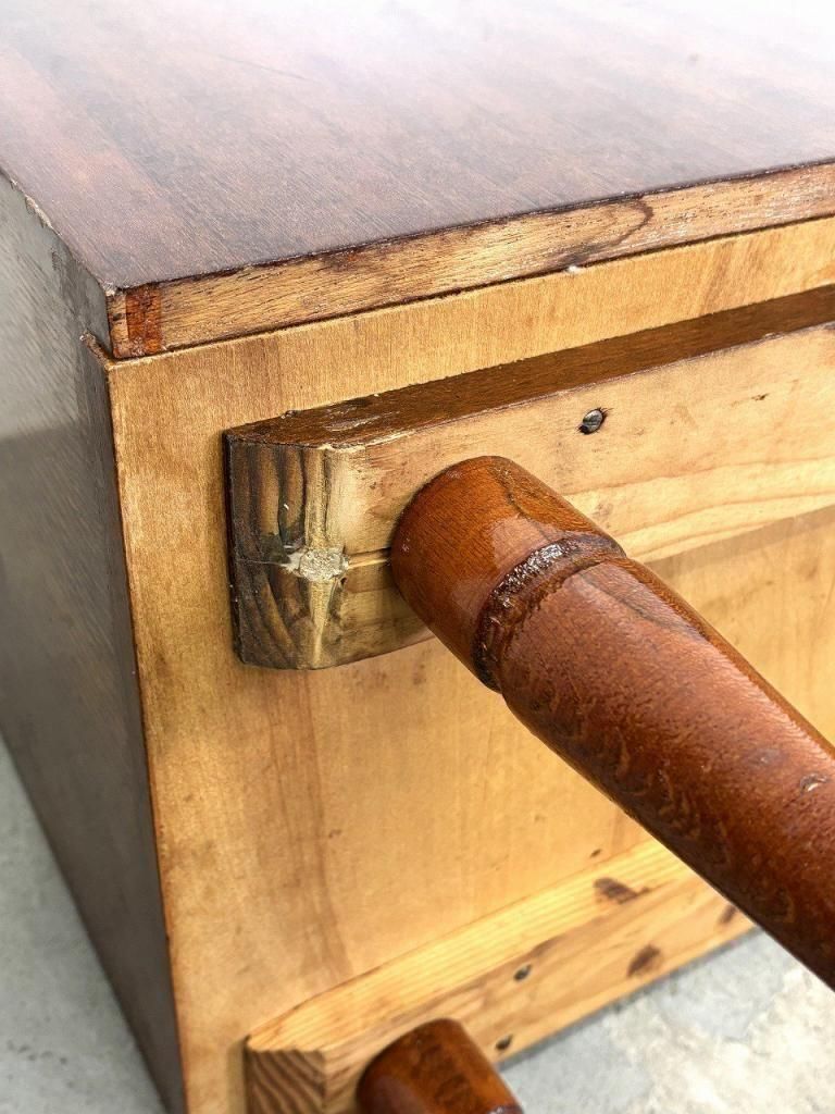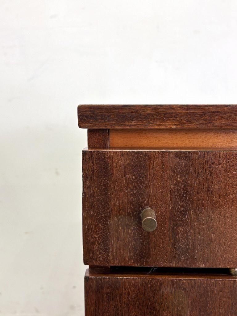 当時の住宅事情を反映した省スペース設計の収納家具で、ベッドサイドや寝具収納用として用いられていた一台。