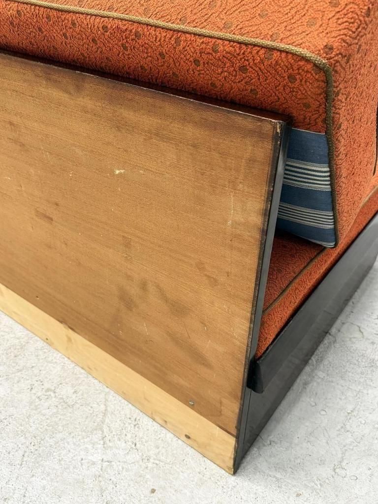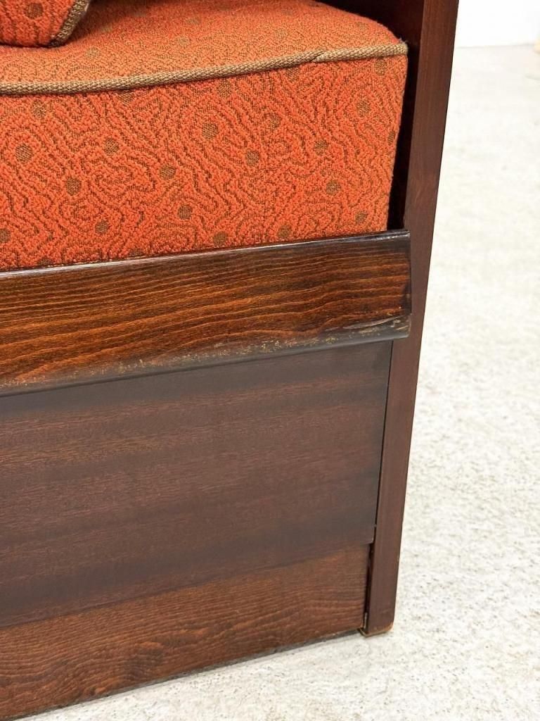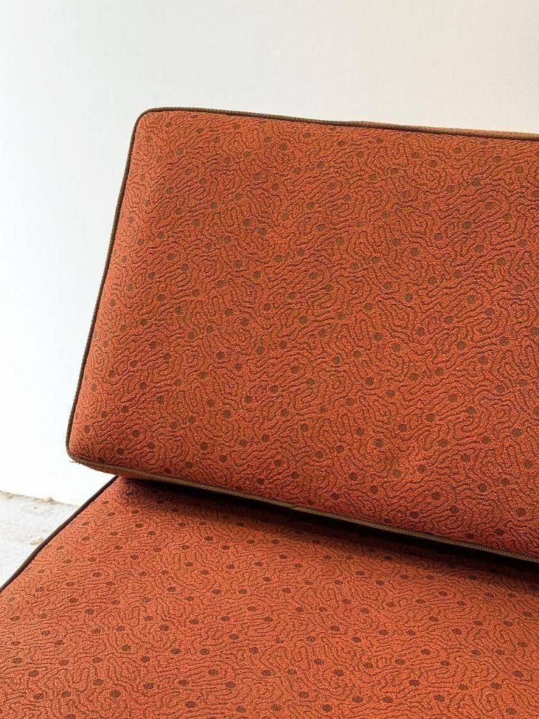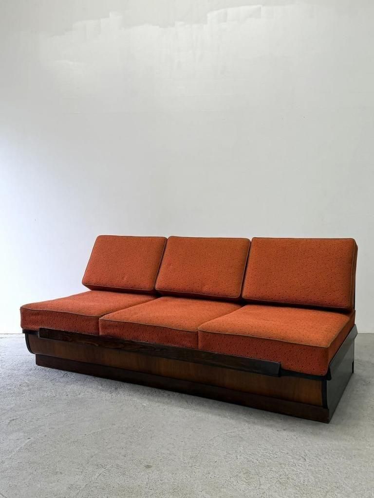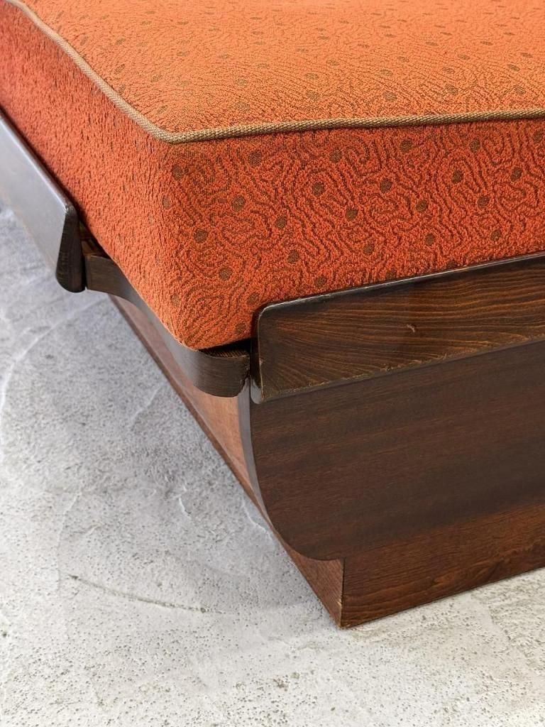 直線を基調としたフォルムに、温かみのあるウッドベースとオレンジのファブリッククッションを組み合わせ、当時の東欧モダンらしいシンプルさと柔らかさが調和しています。