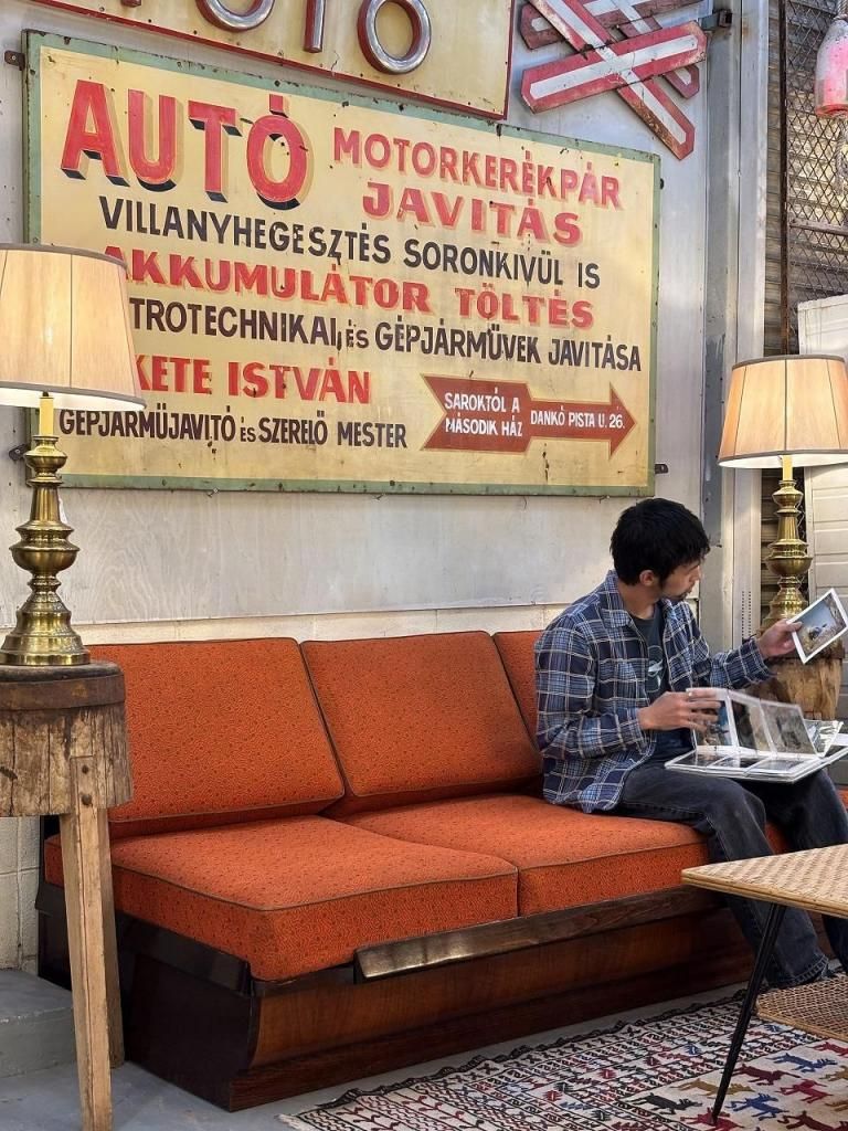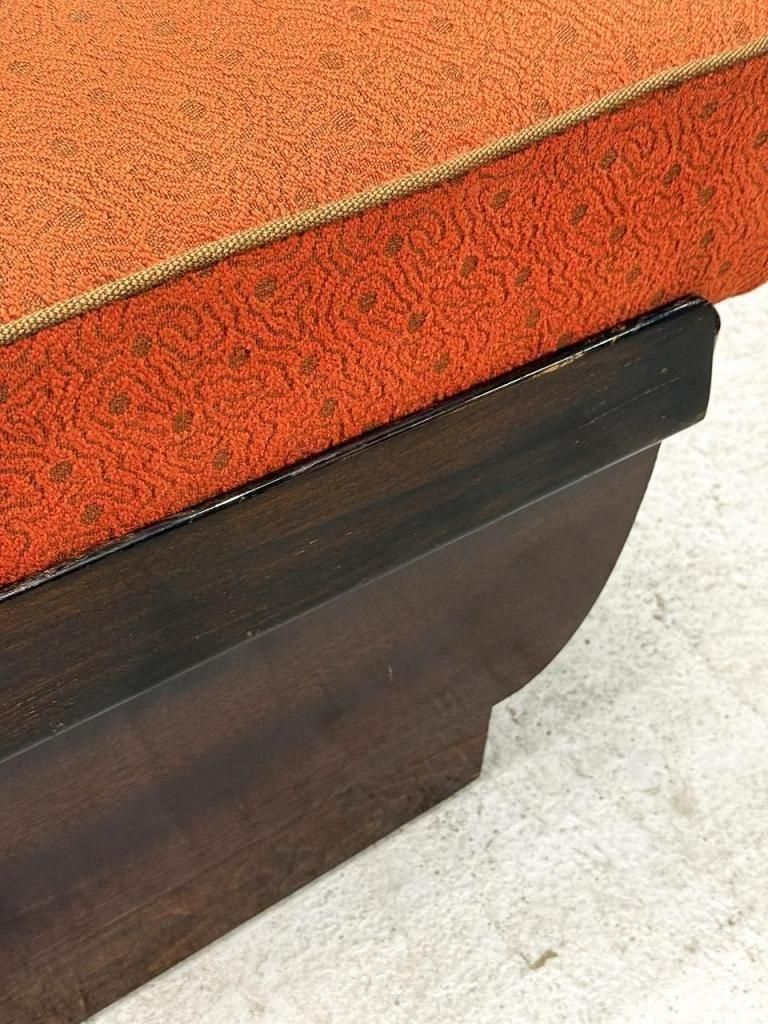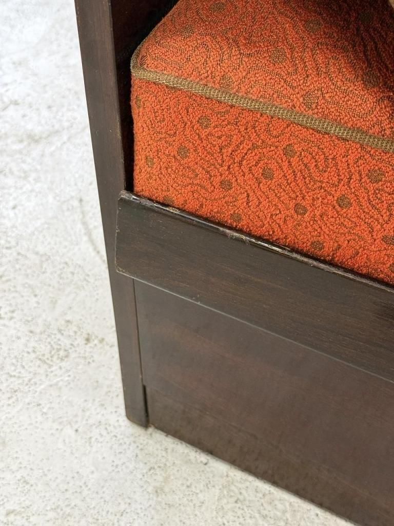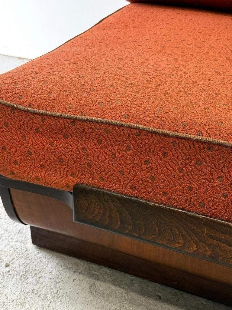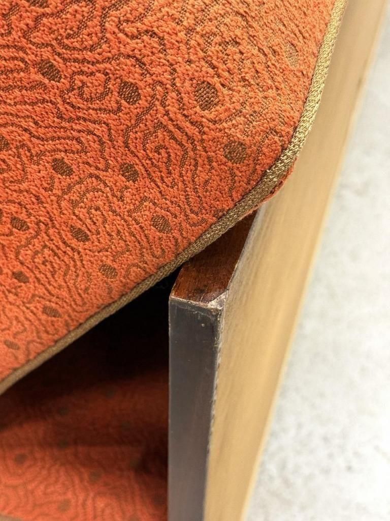 直線を基調としたフォルムに、温かみのあるウッドベースとオレンジのファブリッククッションを組み合わせ、当時の東欧モダンらしいシンプルさと柔らかさが調和しています。