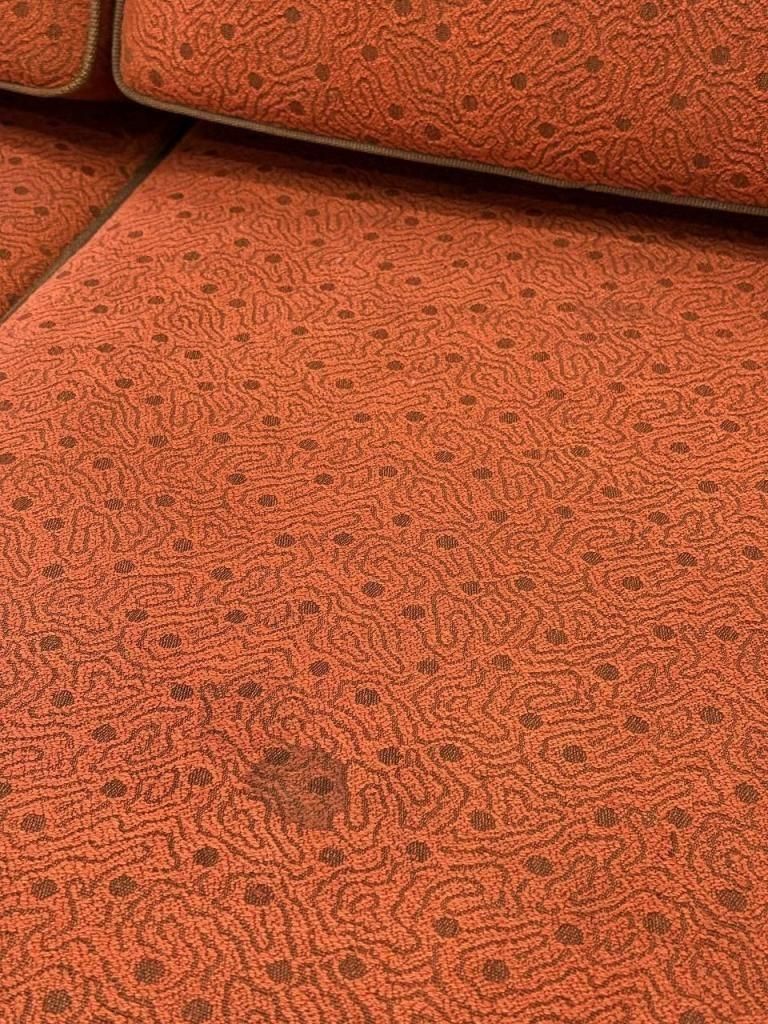 ファブリックは等高線のようなランダムに配置された曲線が織りで表現された特徴的なテキスタイルです。後年に訪れるポストモダンのようなデザインで、当時ではかなり前衛的なものになります。