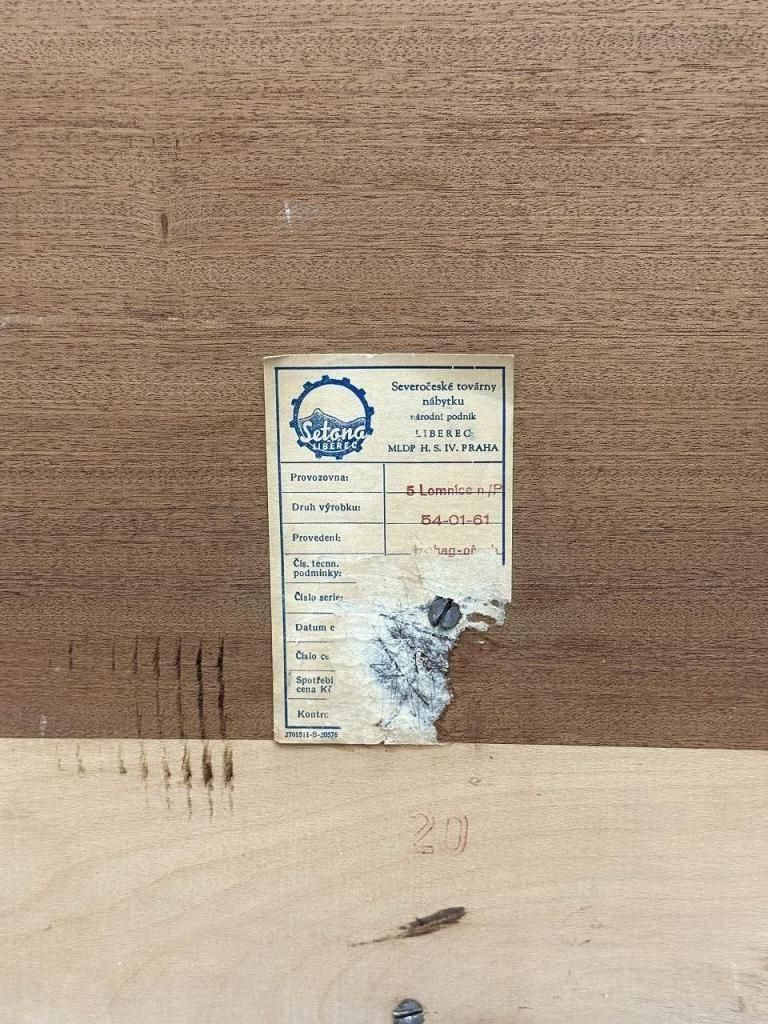 当時のチェコスロバキアでは、各地域の工場が国有化され、住宅需要に合わせた家具の大量生産が進められていました。Setona Liberecはその中でも北ボヘミア地方を代表する工場のひとつで、木工産業が盛んなリベレツを拠点に、機能的で堅牢な家具を多く製造していました。