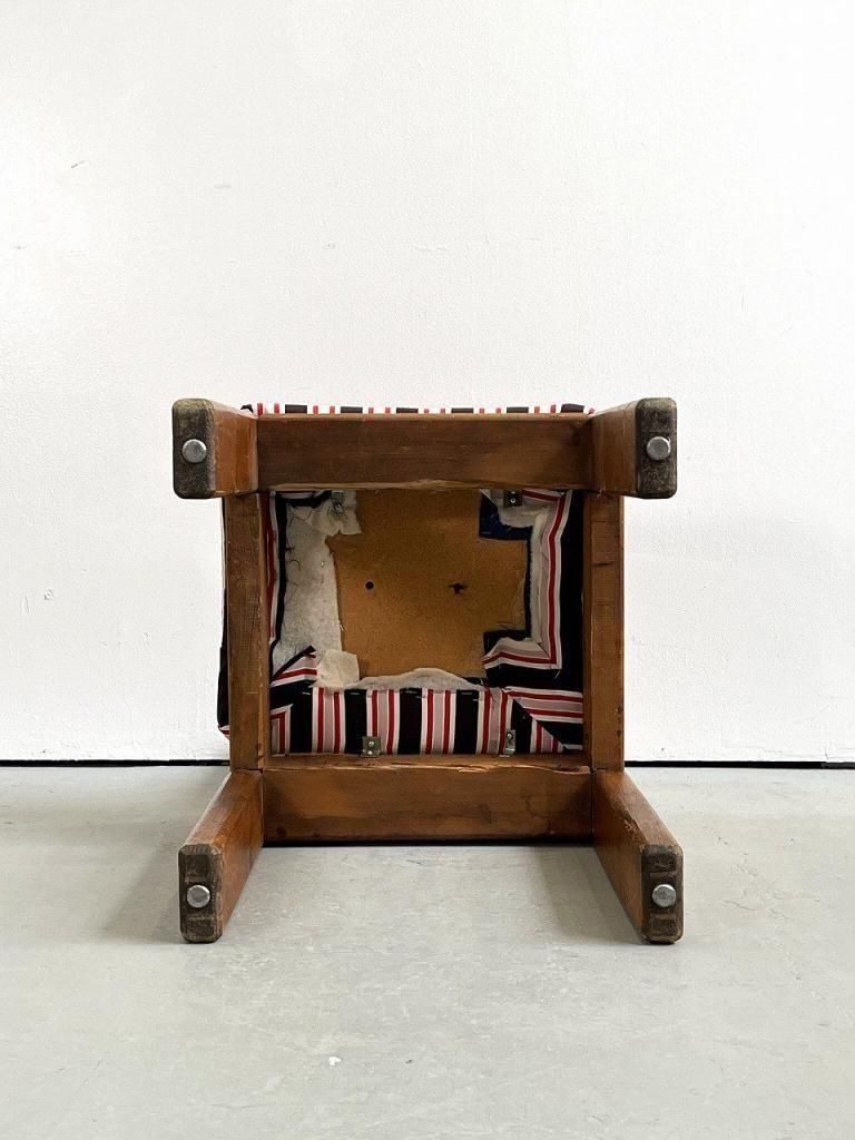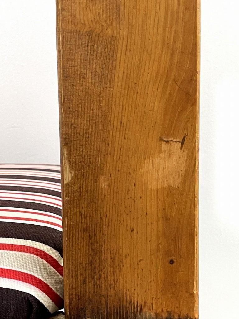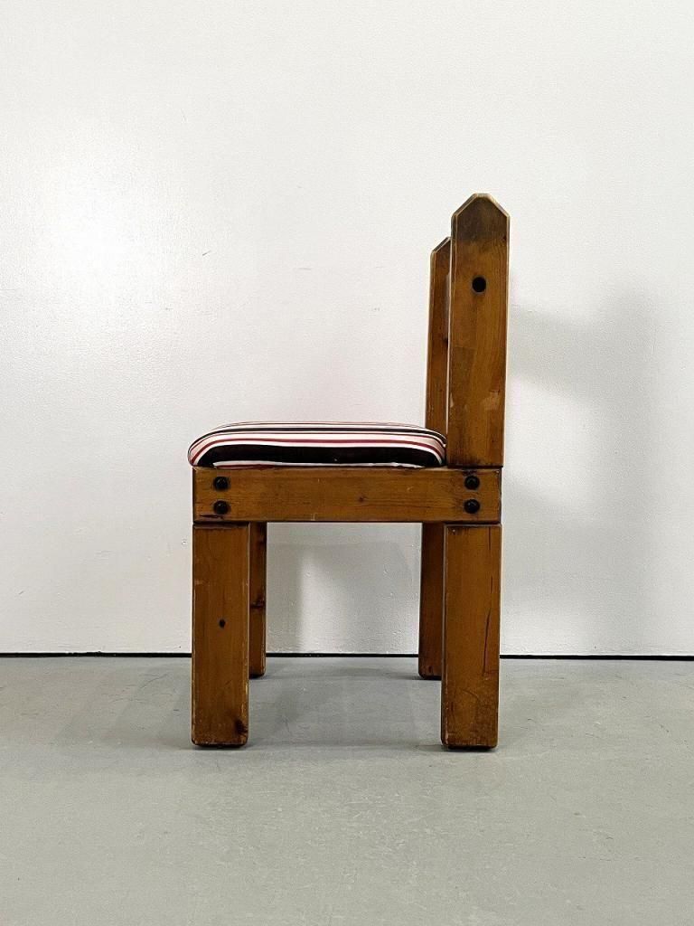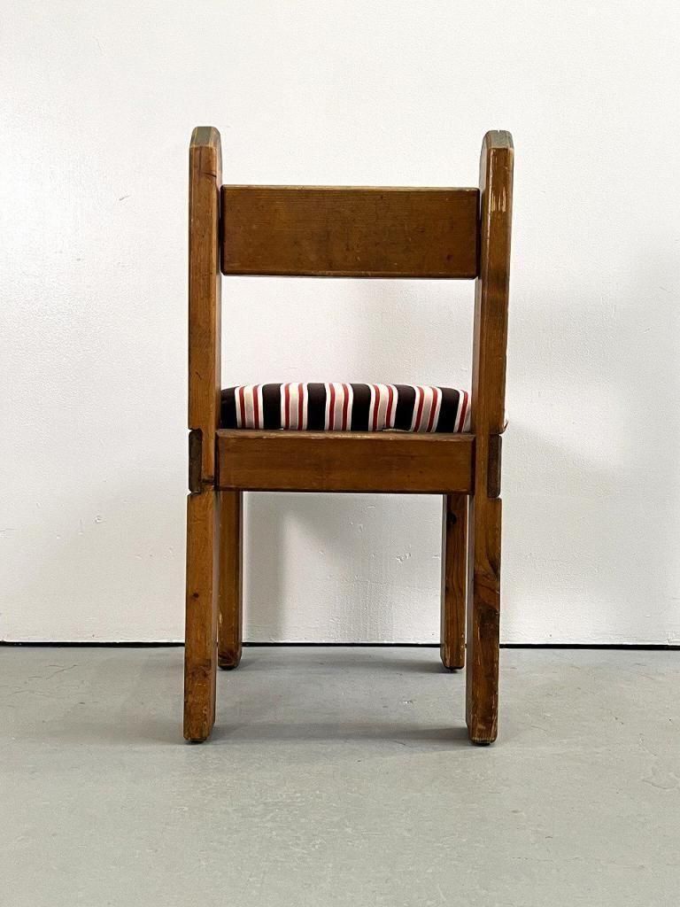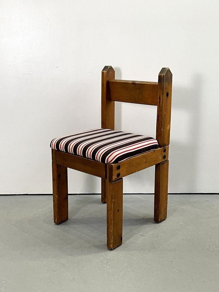 無骨な木材フレームと、モダンなストライプファブリックのコントラストが印象的な一脚。