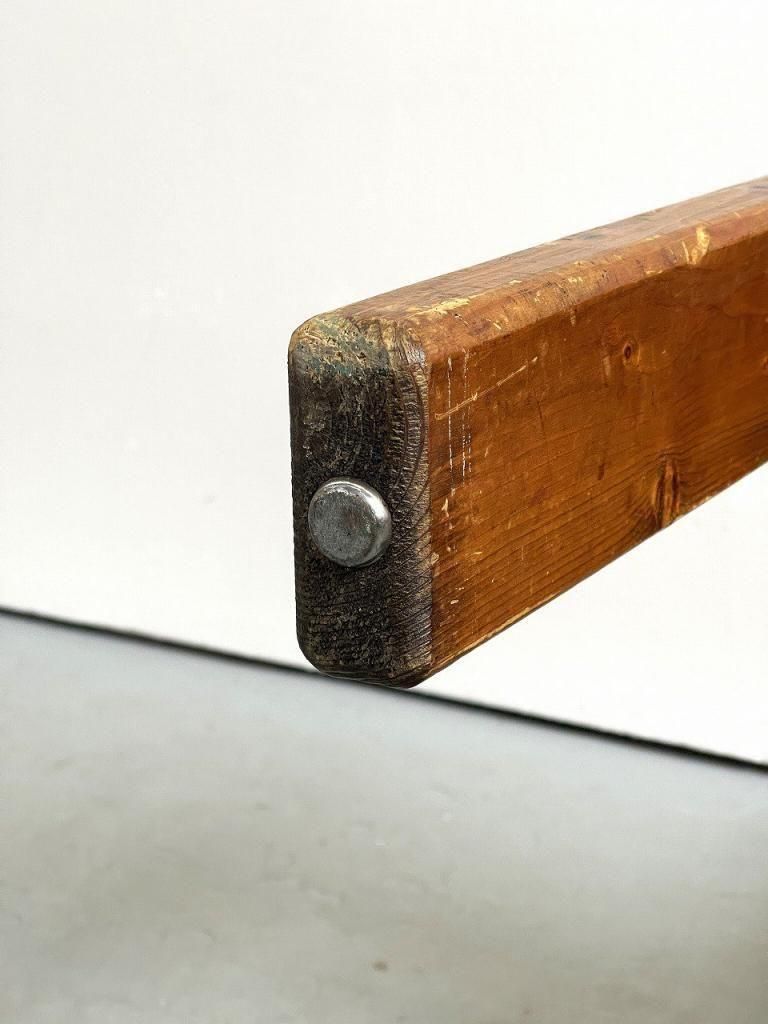 インダストリアルな印象を持ちながらも、どこかクラフト的な温もりを感じさせるデザイン。フレームには無垢材が使われ、手仕事によるジョイントやビス留めの表情が素朴で味わい深い仕上がりです。
