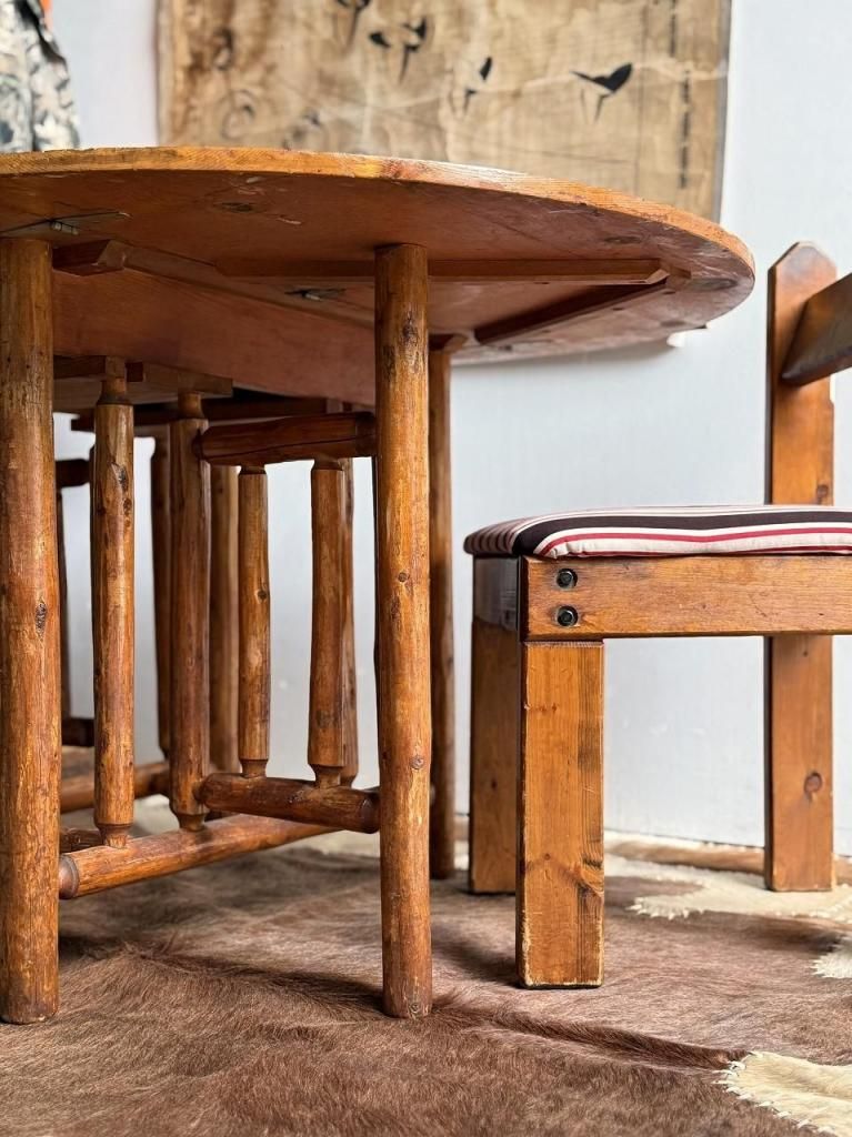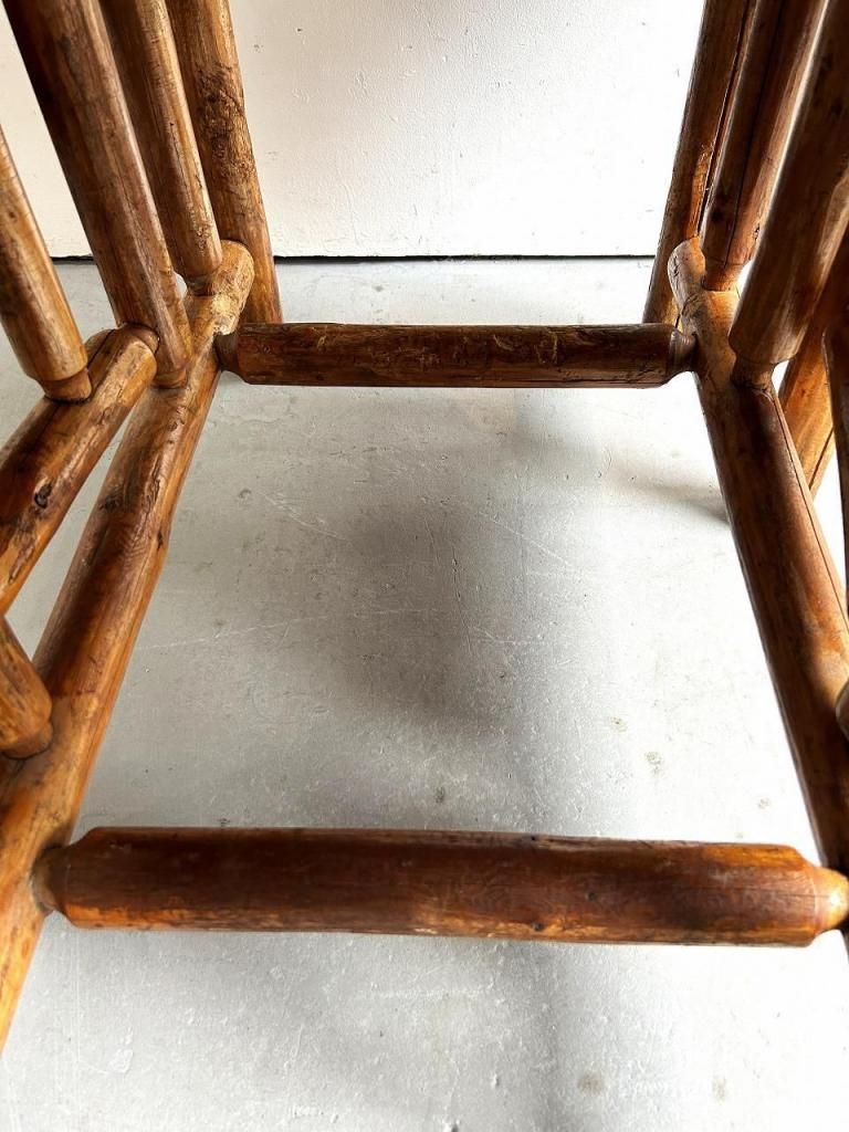 脚部は丸太状の無垢材を連結した構造で、各パーツの太さや間隔がわずかに異なるため、手作業で仕上げられた古い家具ならでは雰囲気を感じさせます。