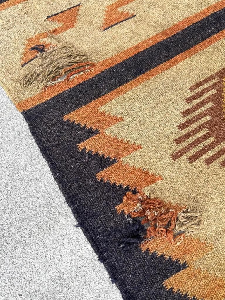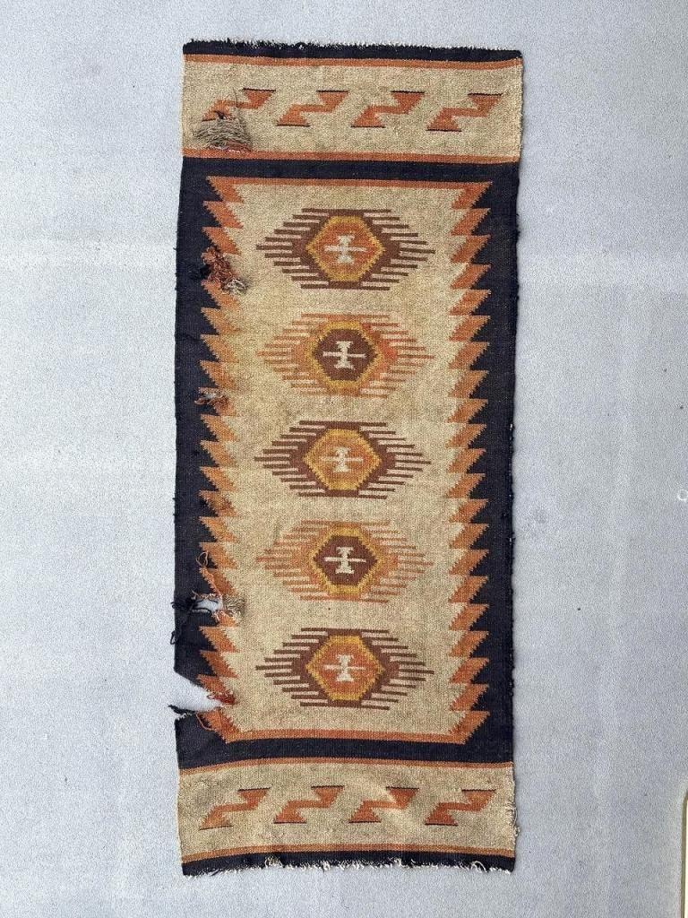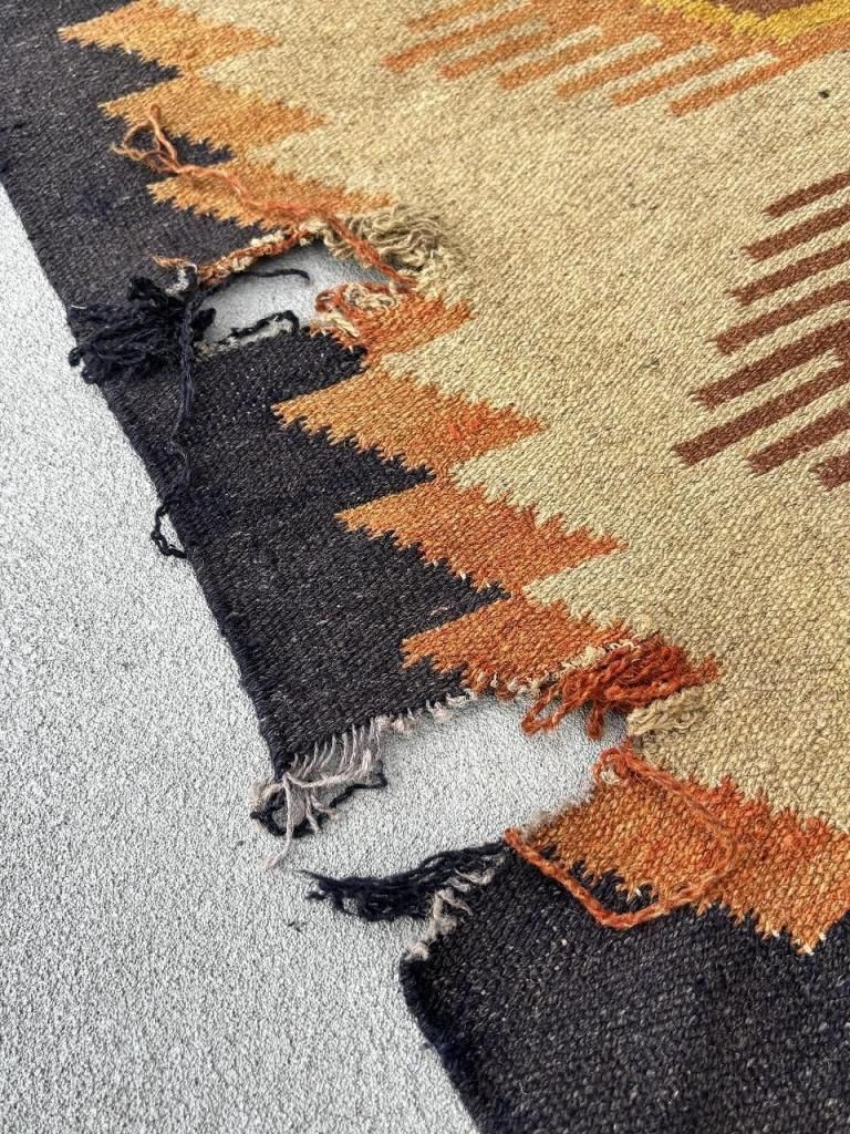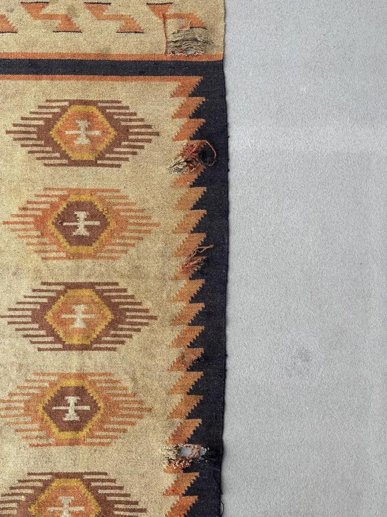 素材はウールで、経年により柔らかく落ち着いた風合いへと変化しており、部分的にほつれやダメージが見られますが、ヴィンテージならではの表情として味わい深く、空間に独特の温度感を与えてくれます。