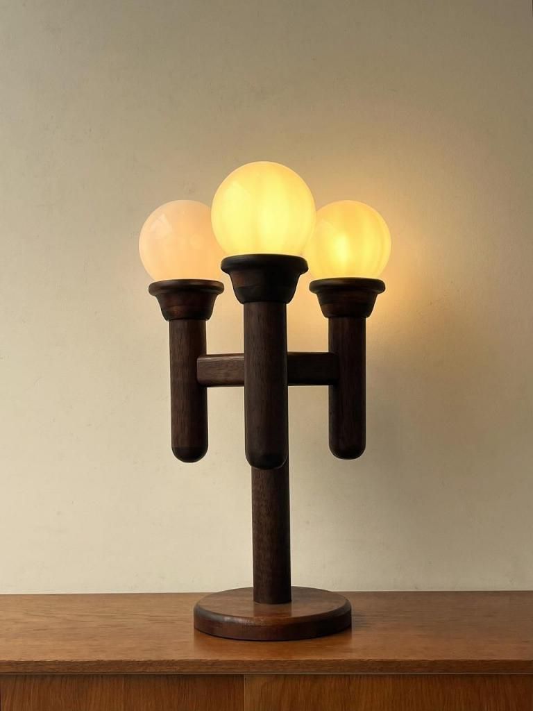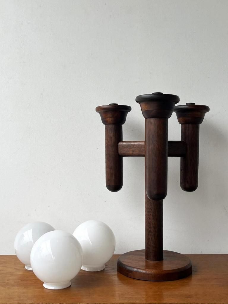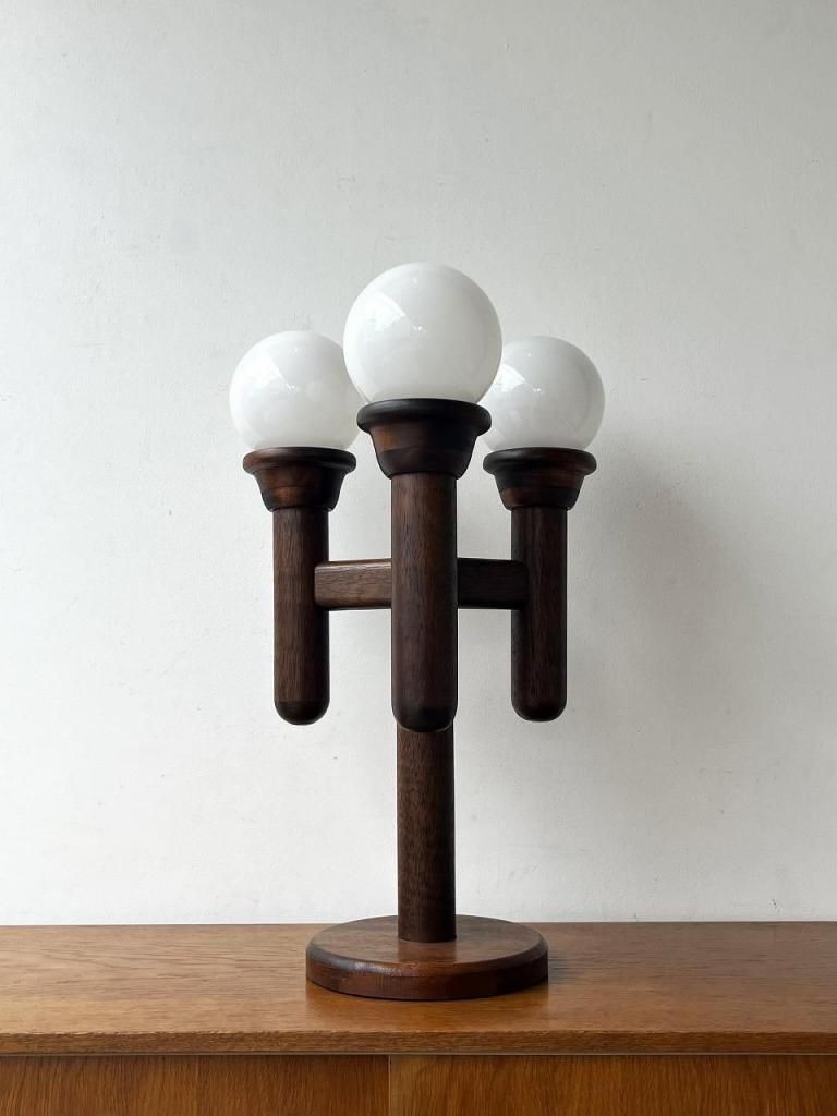 高さ約680mmのテーブルランプサイズは、日本の住空間にも取り入れやすく、ミッドセンチュリーの家具にはもちろん、様々な空間に馴染みます。彫刻のような佇まいと穏やかな光を併せ持つ、特別なヴィンテージピースです。